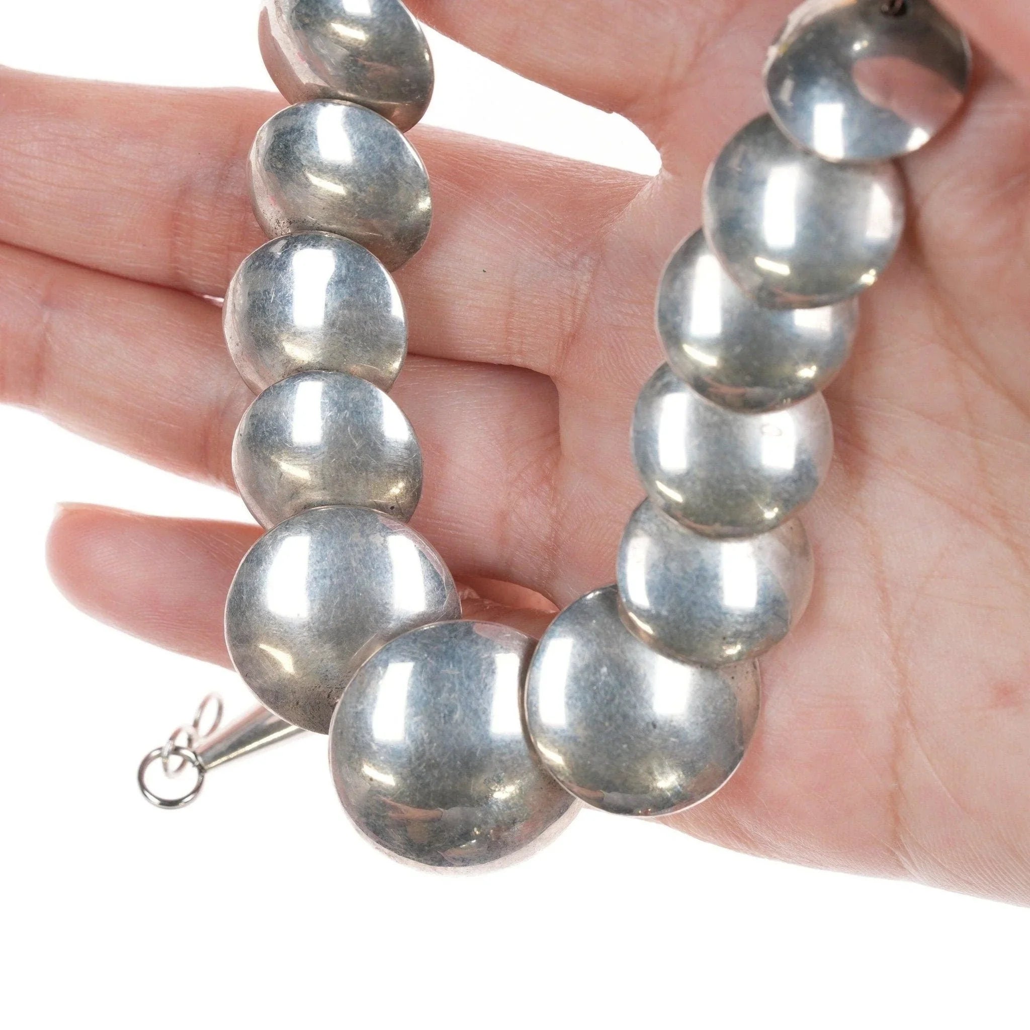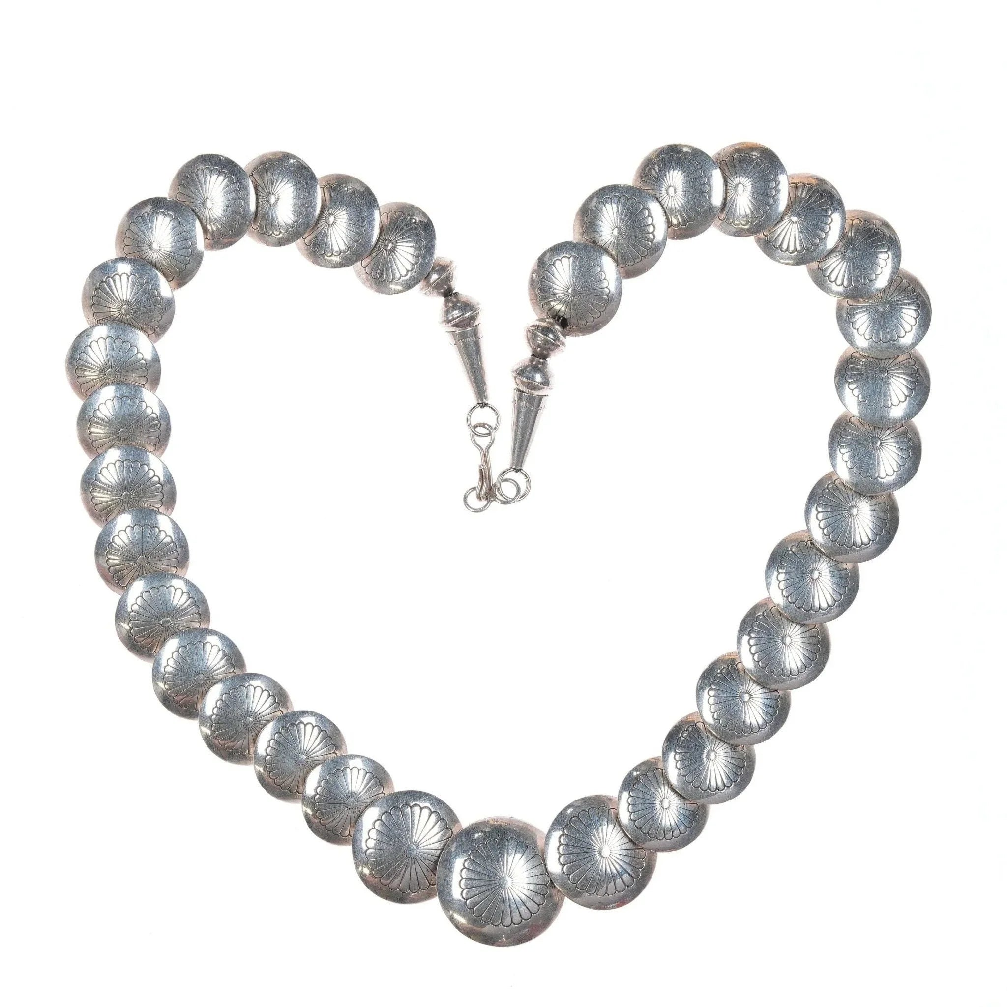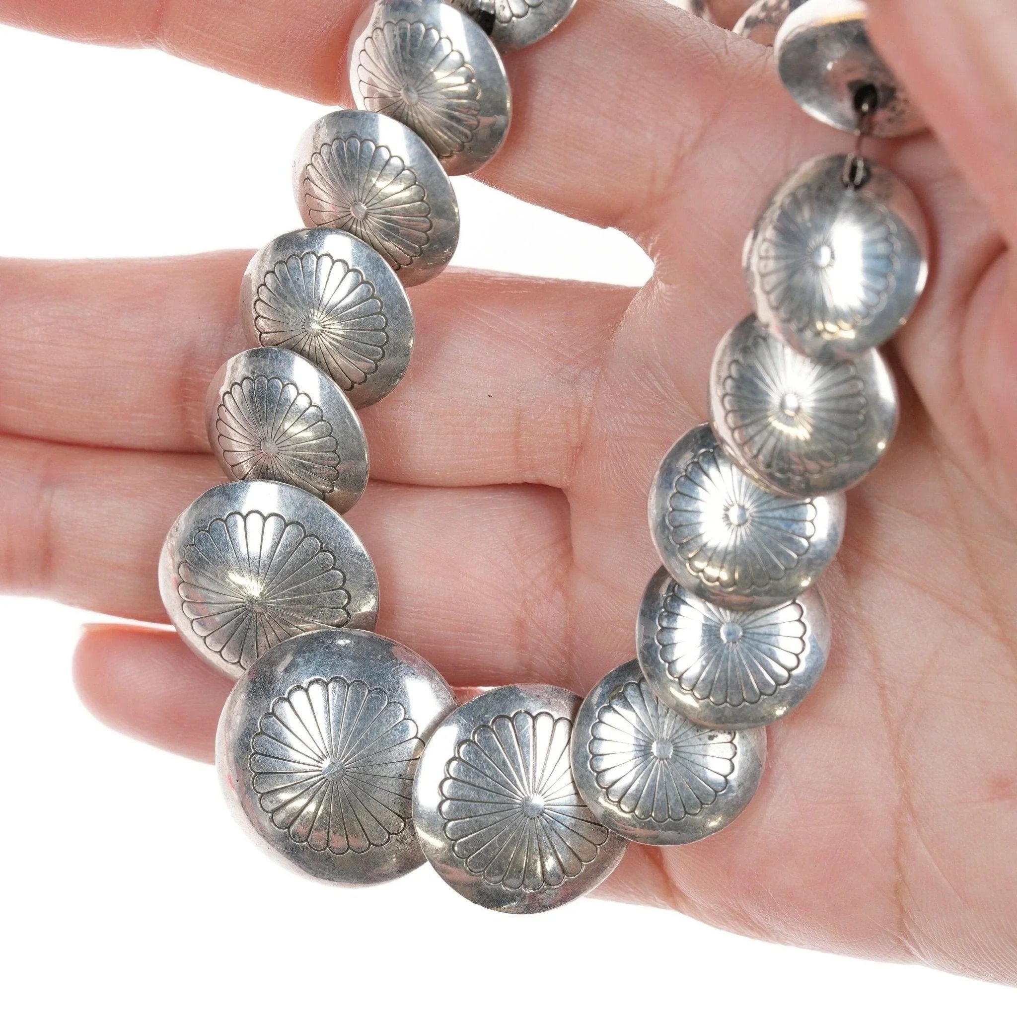 18" Native American Sterling Beaded discs necklace. Bottom disk is 7/8".<br><br>All precious metals are tested and guaranteed, if Stated sterling it's<br>guaranteed to be 90% silver or more, all clasps are functional, I will not offer<br>anything here with any significant issues. Measurements and weight should be<br>shown in the pics if not otherwise described in the listing.