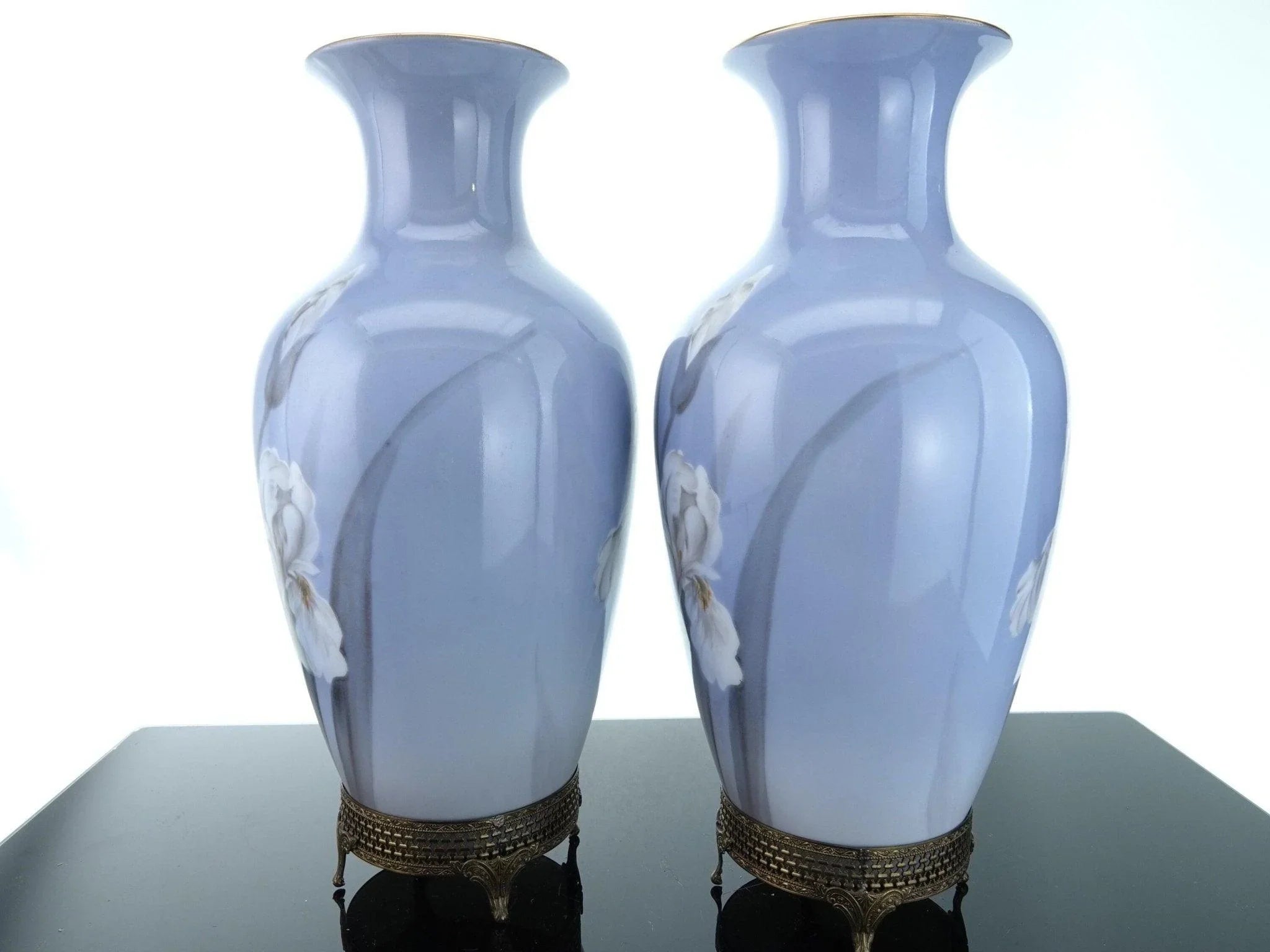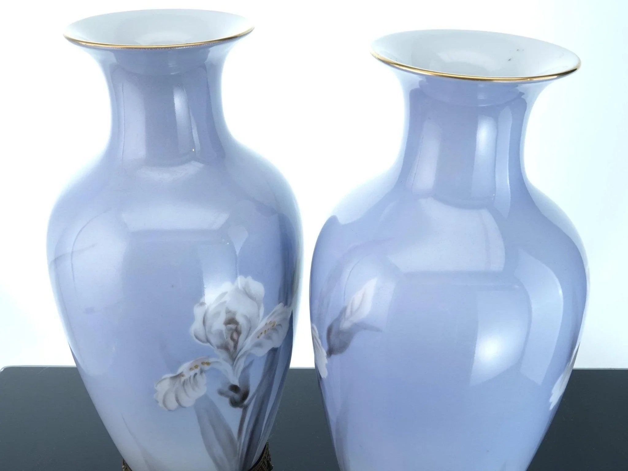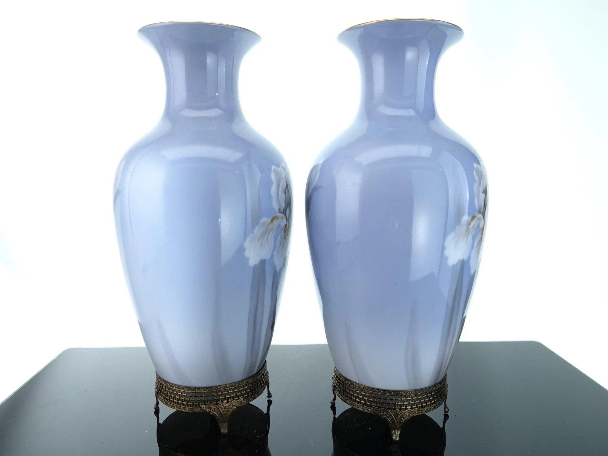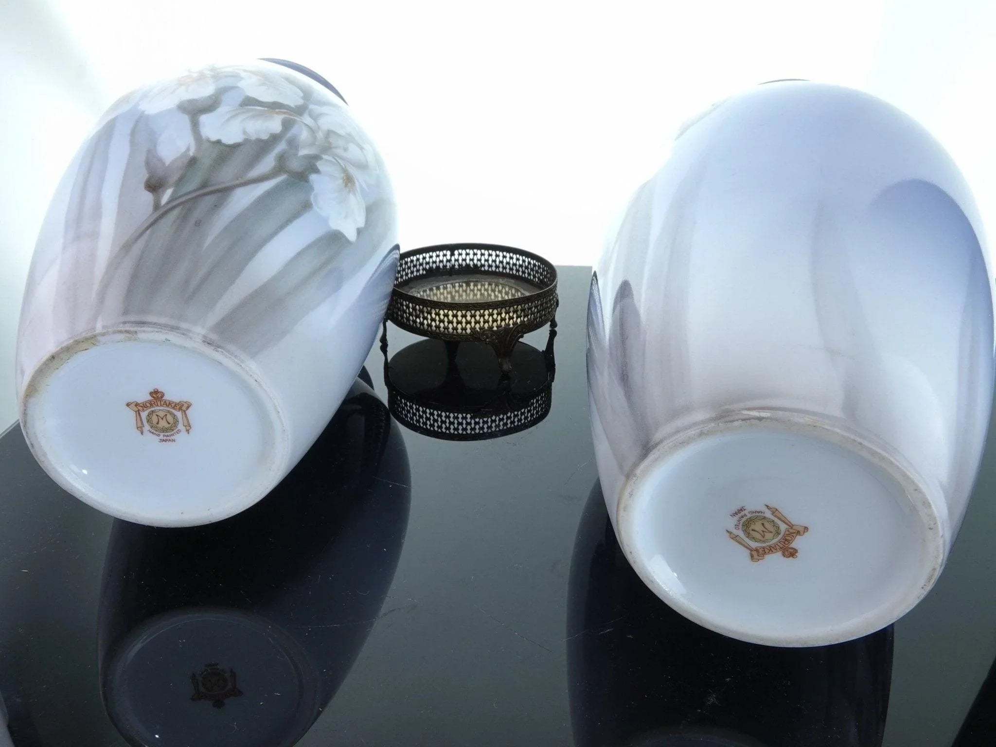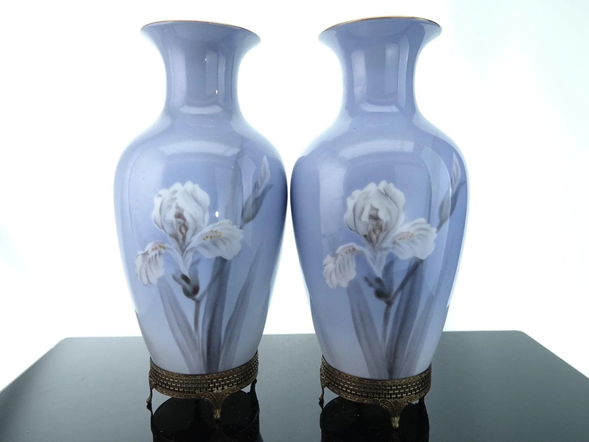 1940's Noritake Hand Painted Iris Vases On brass Stands Pair. Unusual Pair of hand painted vases with an uncommon Noritake mark. No cracks, chips, restorations, or wear, hand painted with subtle variations. 11" tall with the removable stands, 10.5" tall without. The stands came with the vases, I'm including them and it will be up to you whether you want to use them or not. TW234