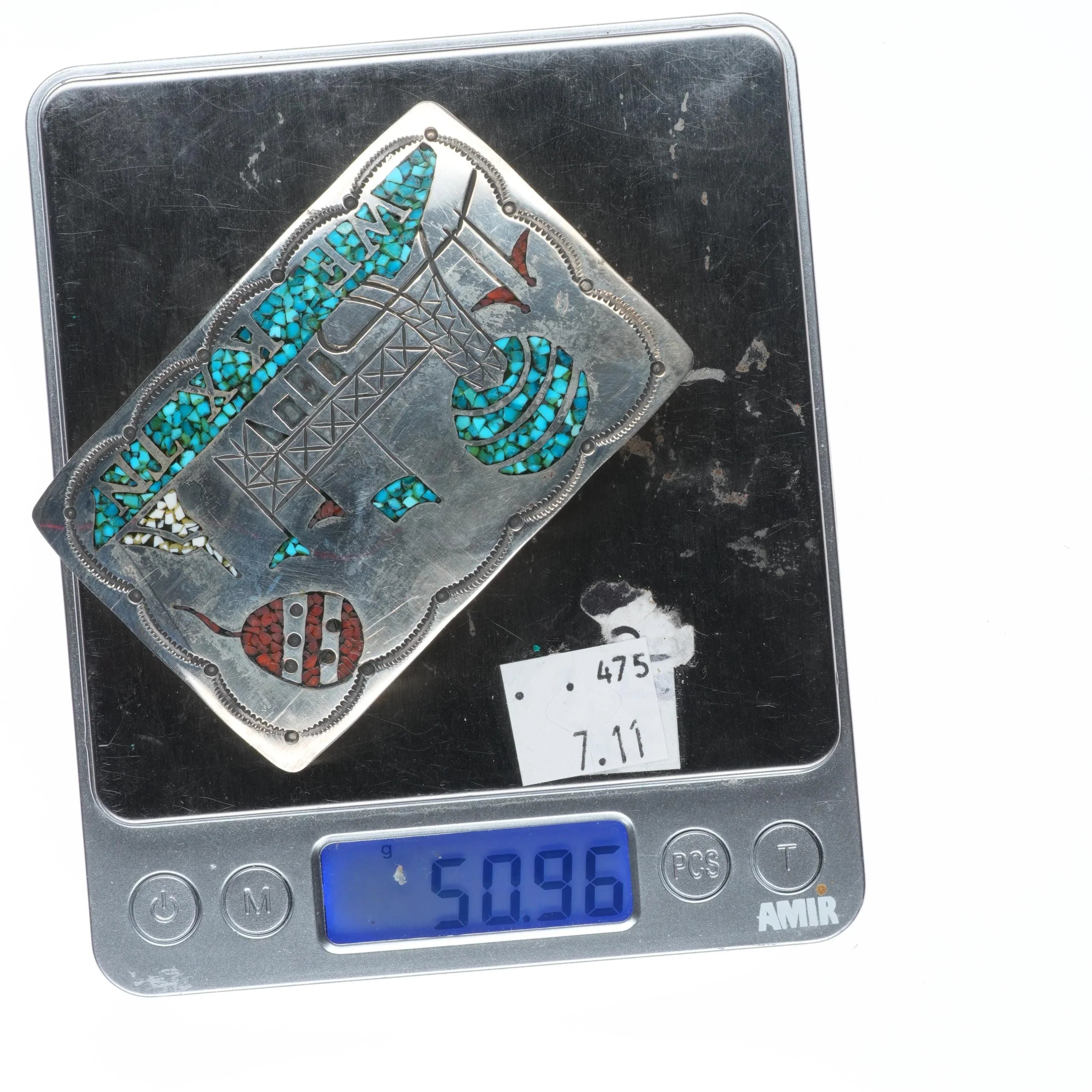 1981 Vintage Navajo Sterling silver Knoxville worlds fair belt buckle chip inlay. Fits up to a 1.5" belt. Tested and guaranteed solid sterling silver with weight and measurements in pictures. Fully functional, stones are secure. All items will likely have some expected wear, the older they are the more wear they should have. 1981, #7, likely very few made.