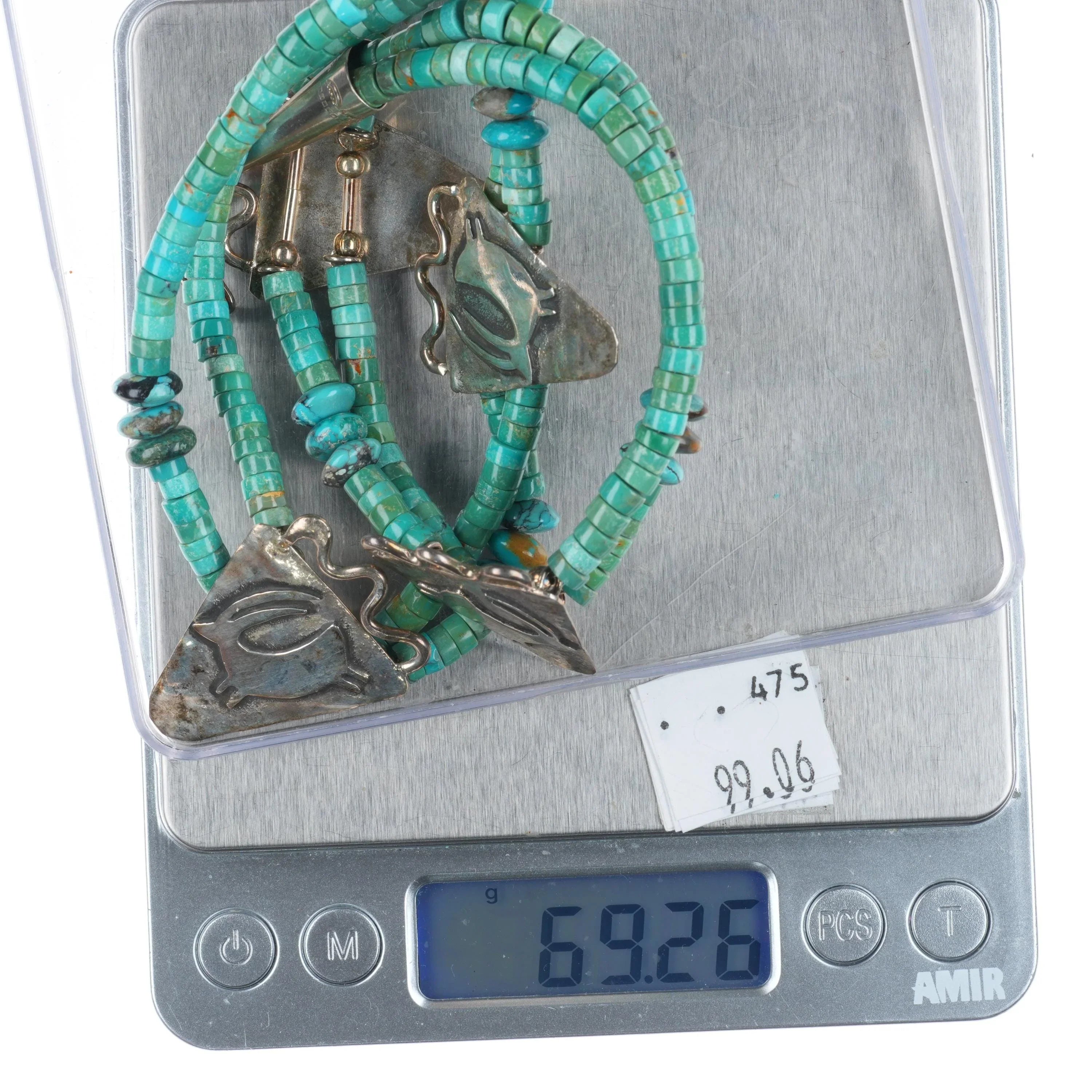 21" Shaman‘s Dream sterling silver petroglyph turquoise heishi necklace. Solid sterling silver tested and guaranteed with weight and measurements in the pictures. No issues, circa last quarter of the 20th century. Signed Shaman‘s Dream and illegible writing below that.