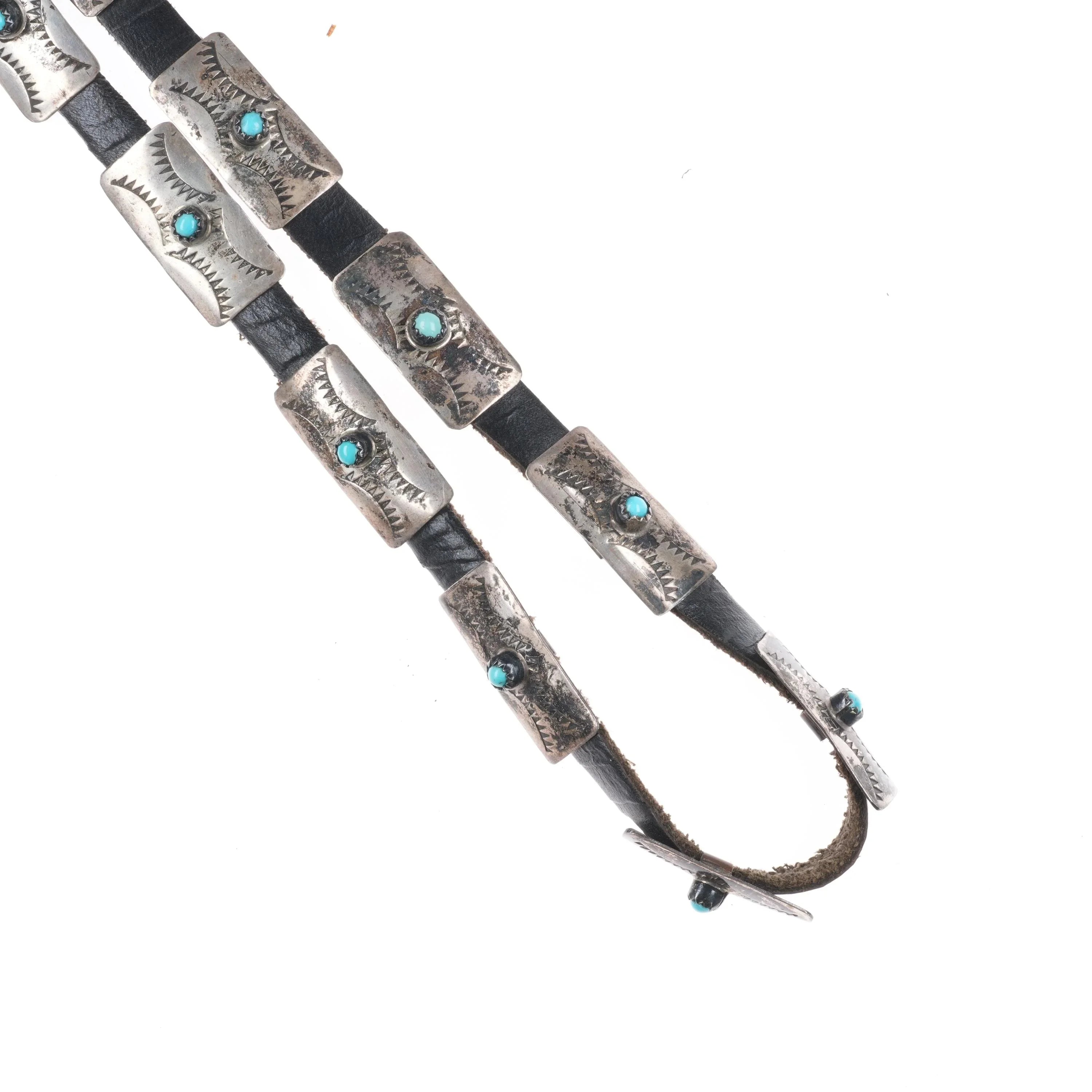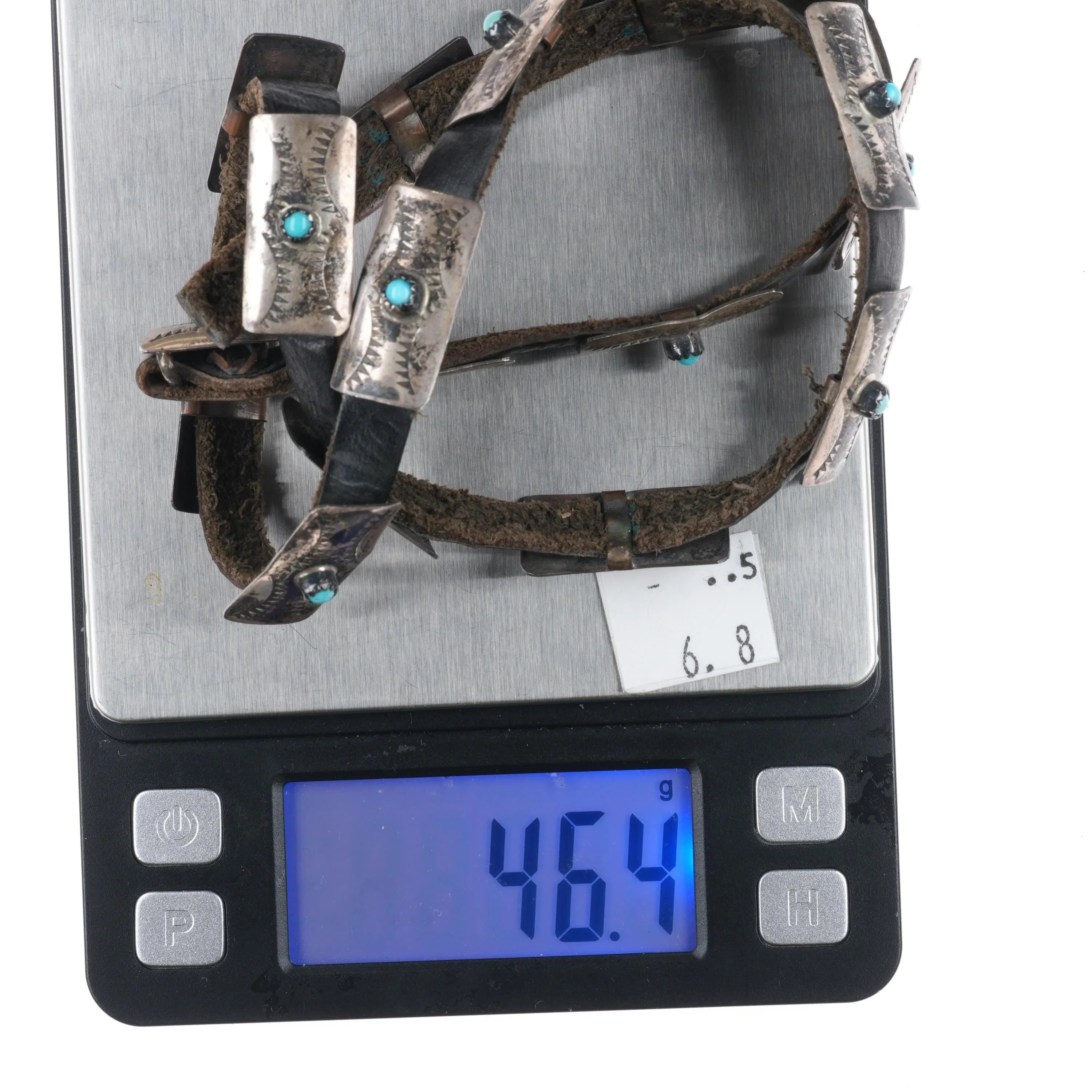 24.5" Navajo sterling silver and turquoise conchos hatband on leather. Solid sterling silver tested with weight and measurements in pictures.. 25" total length as shown in pics.