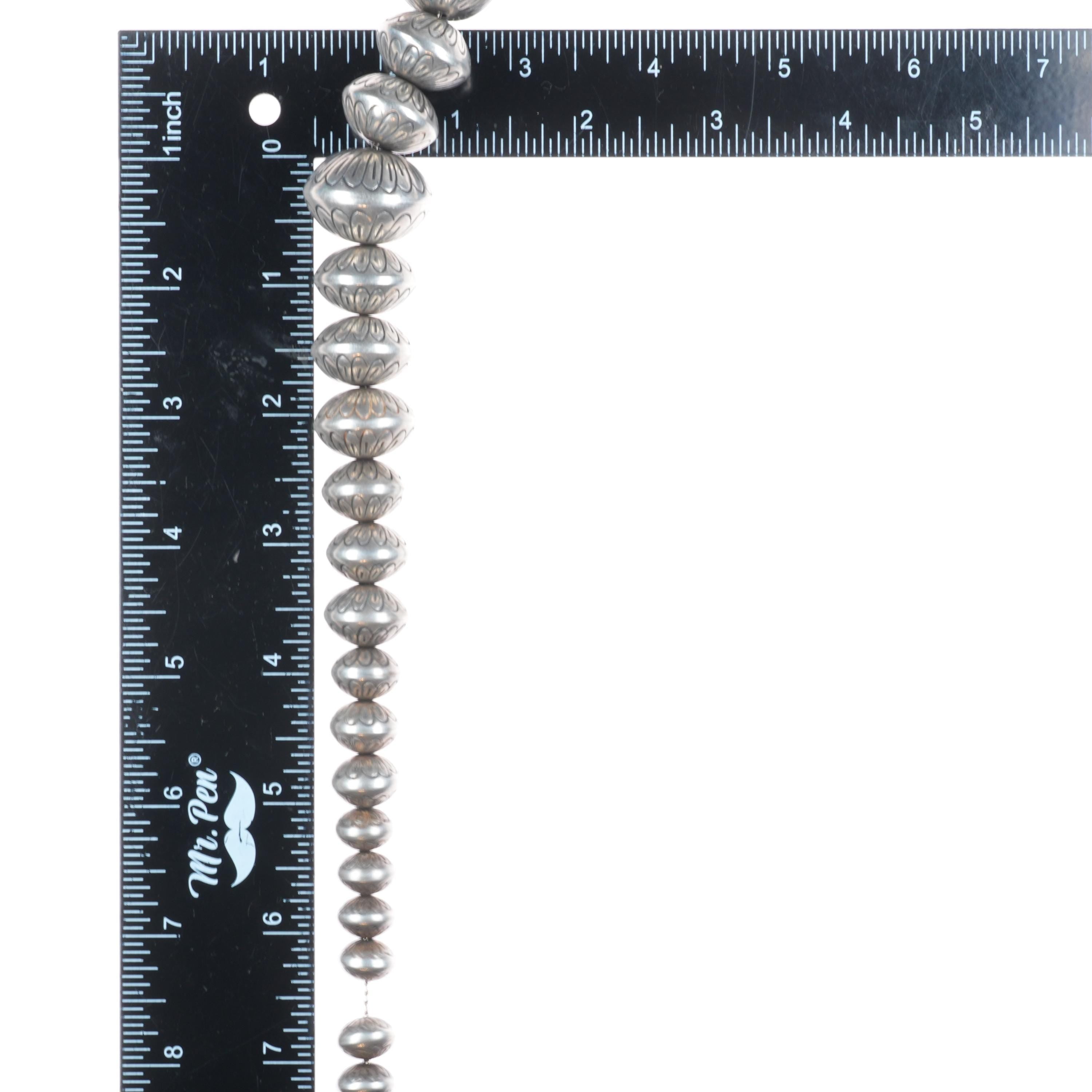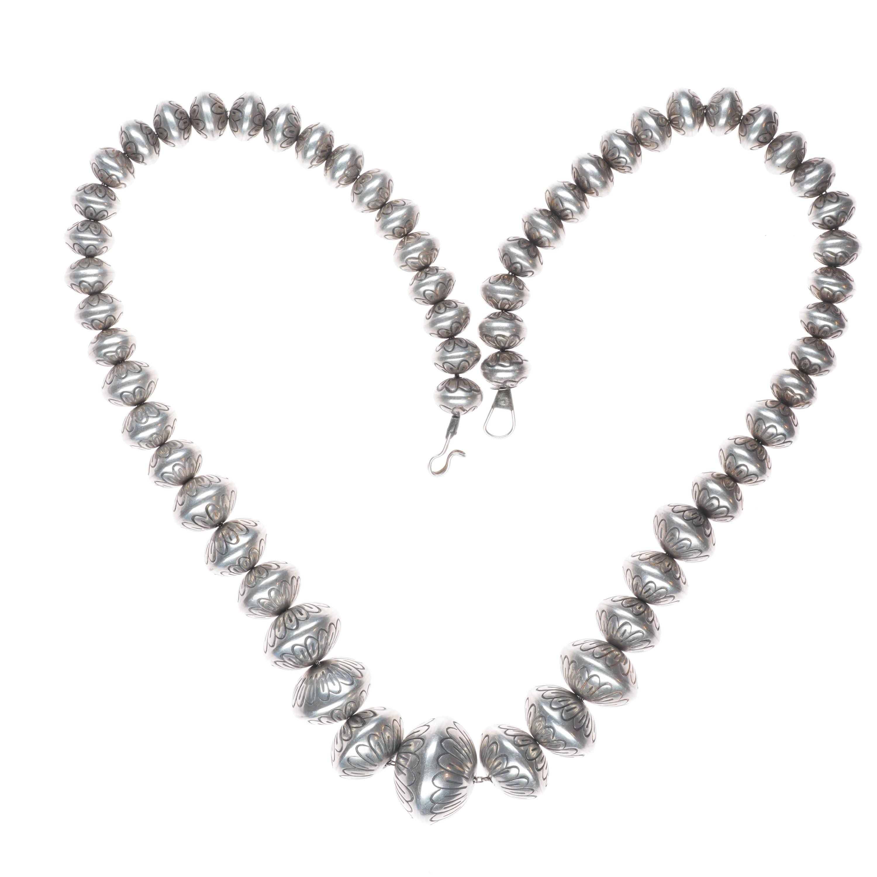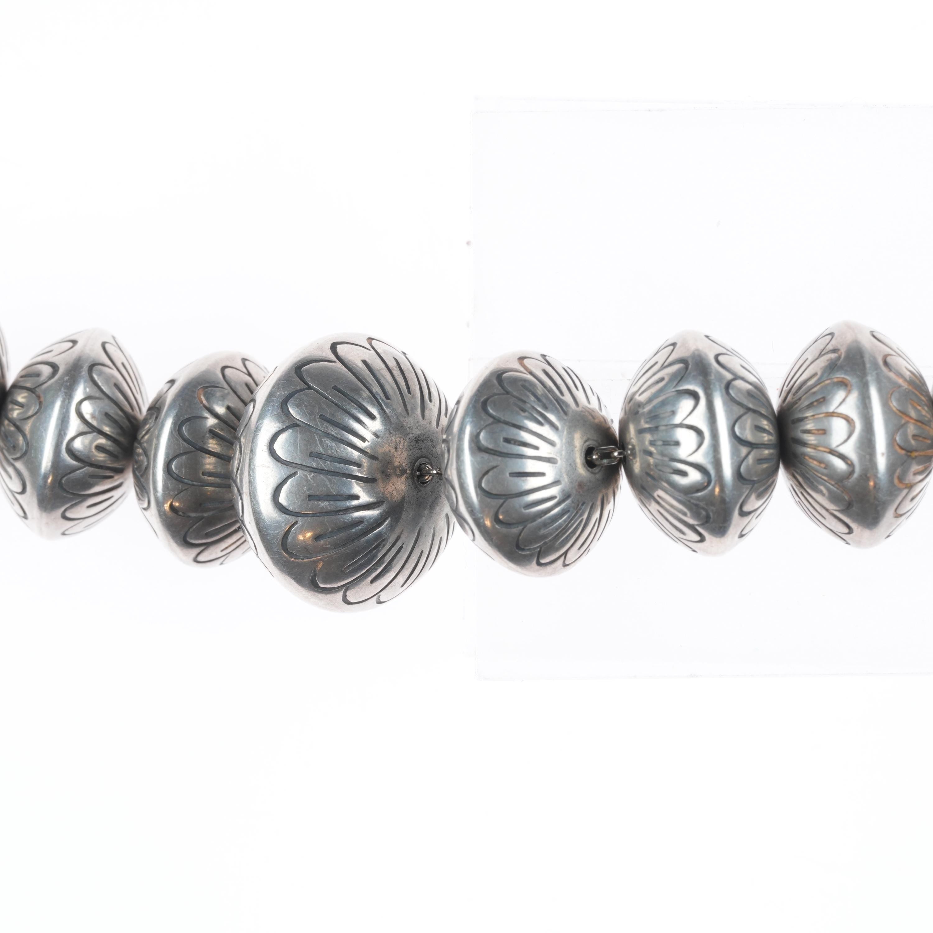 24" Heavy vintage SW Handmade/Hand stamped Navajo pearl beaded necklace, circa last quarter of the 20th century. Selling the Navajo pearl necklace shown in good condition with measurements in pictures. 24" long. Handmade beads, hand stamped. I've seen necklaces with this tag attributed to Selena Warner of the Acoma tribe, I cannot verify that.
