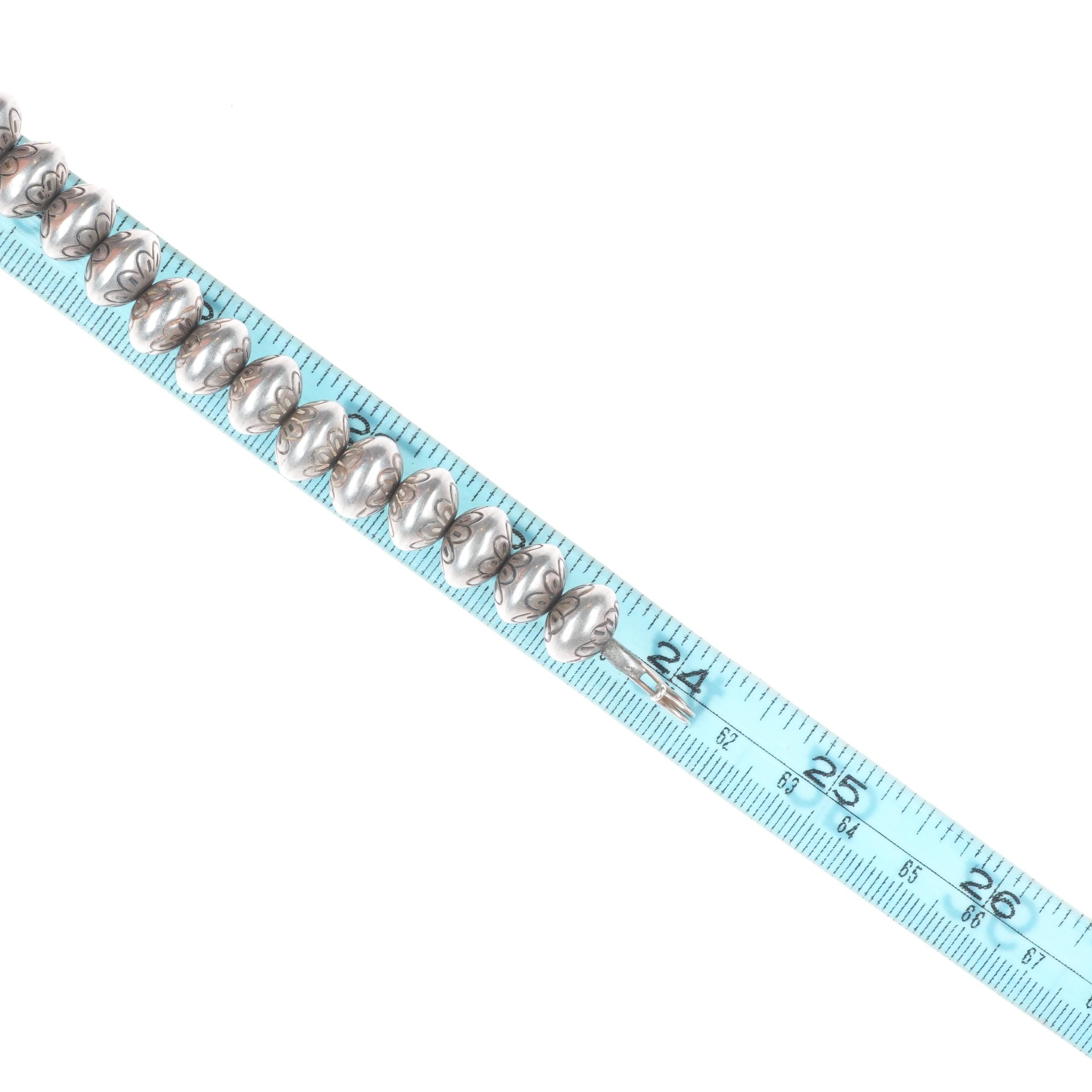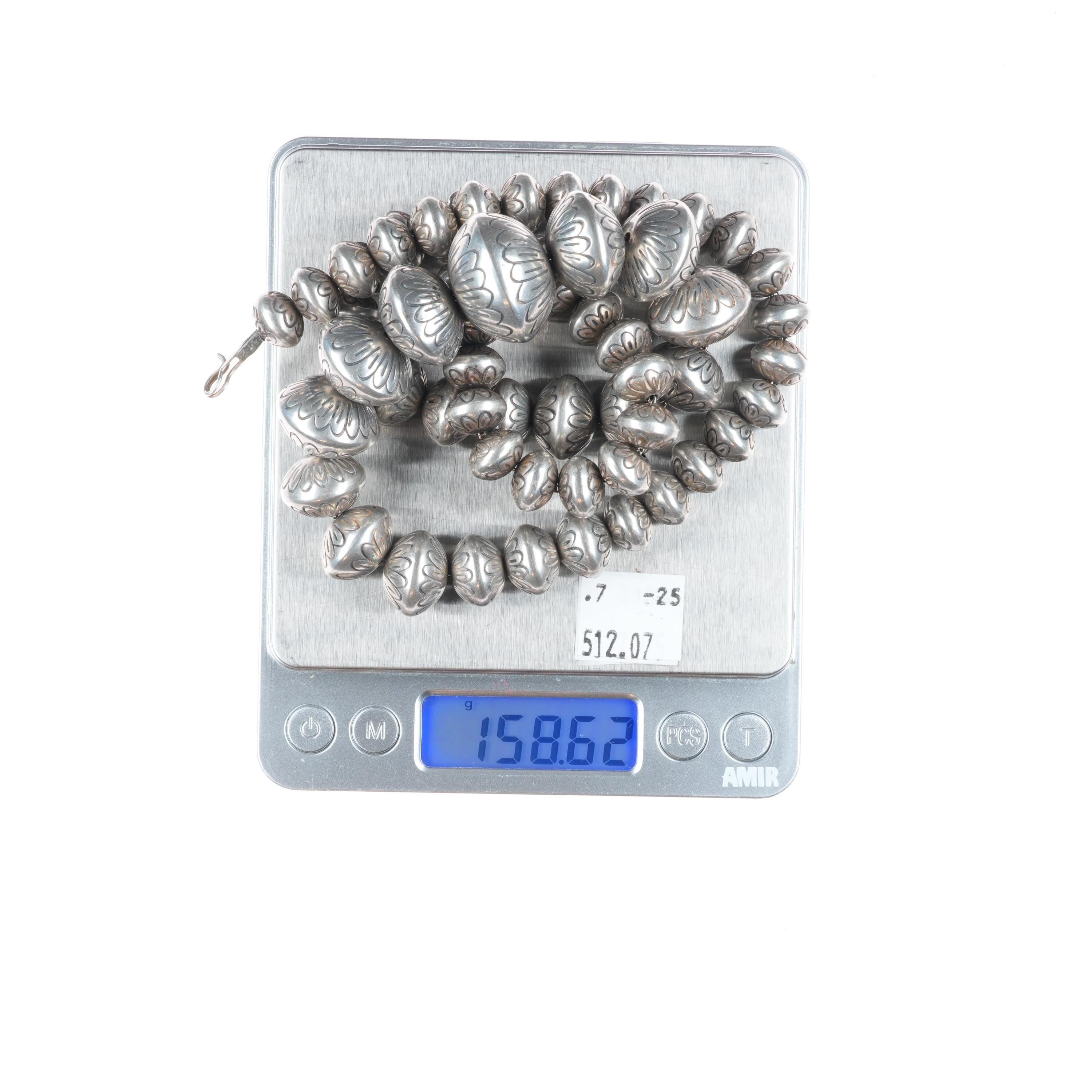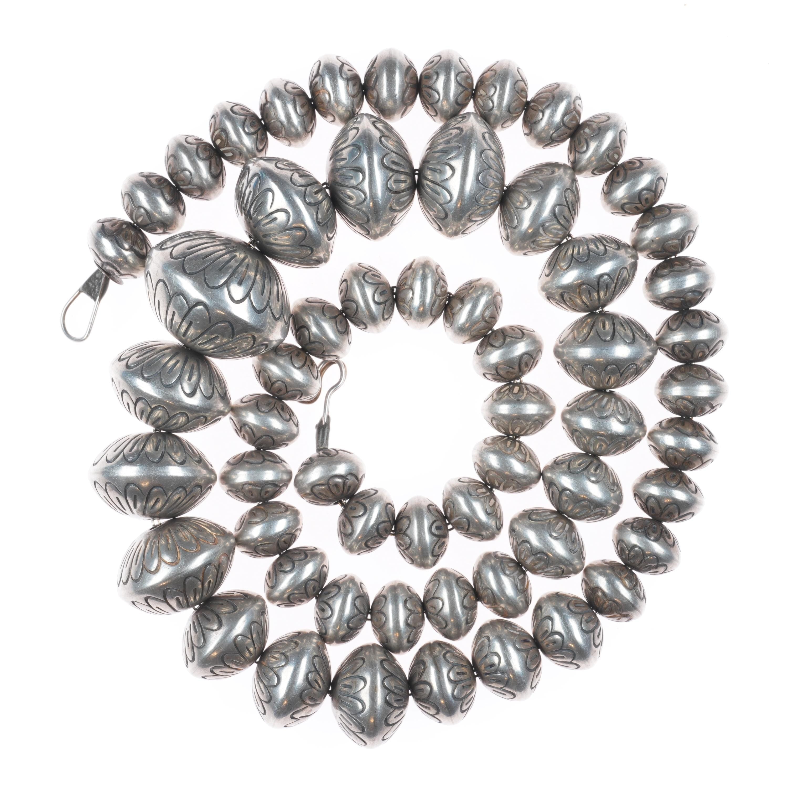 24" Heavy vintage SW Handmade/Hand stamped Navajo pearl beaded necklace, circa last quarter of the 20th century. Selling the Navajo pearl necklace shown in good condition with measurements in pictures. 24" long. Handmade beads, hand stamped. I've seen necklaces with this tag attributed to Selena Warner of the Acoma tribe, I cannot verify that.