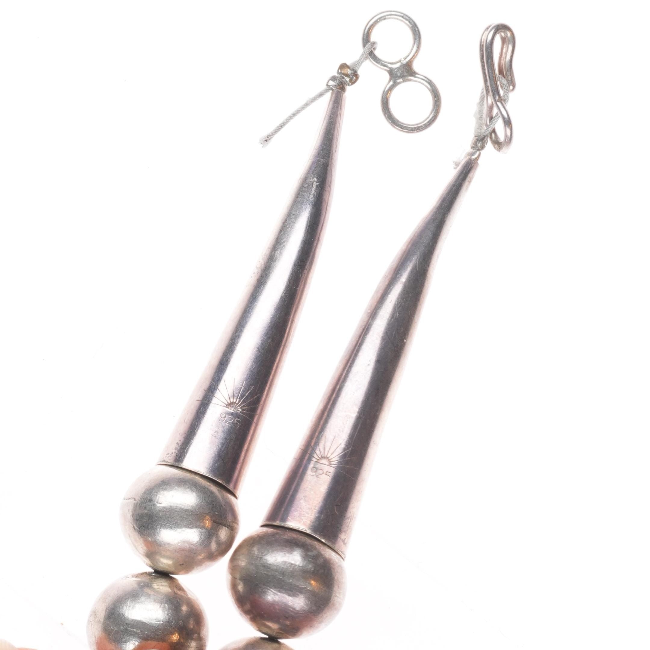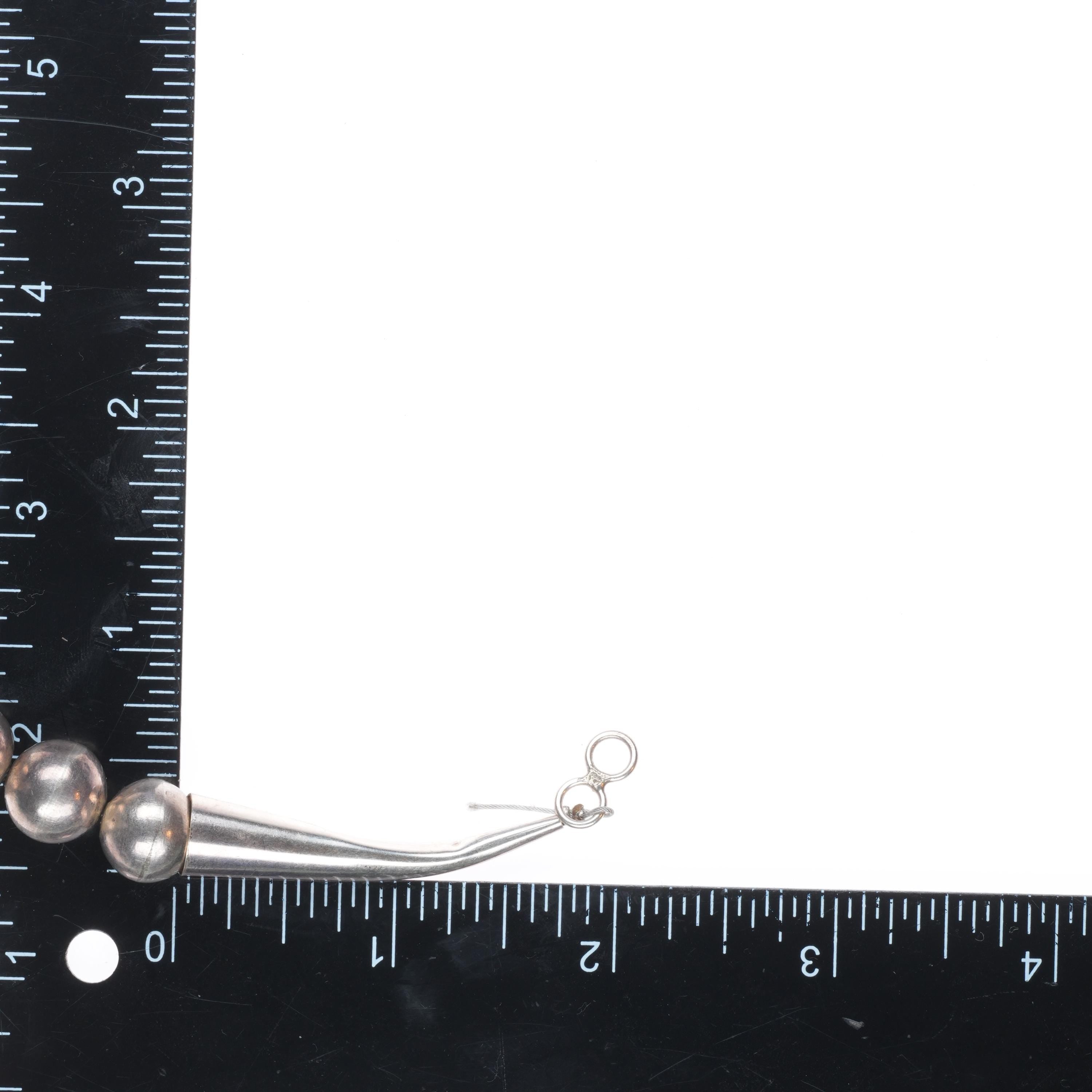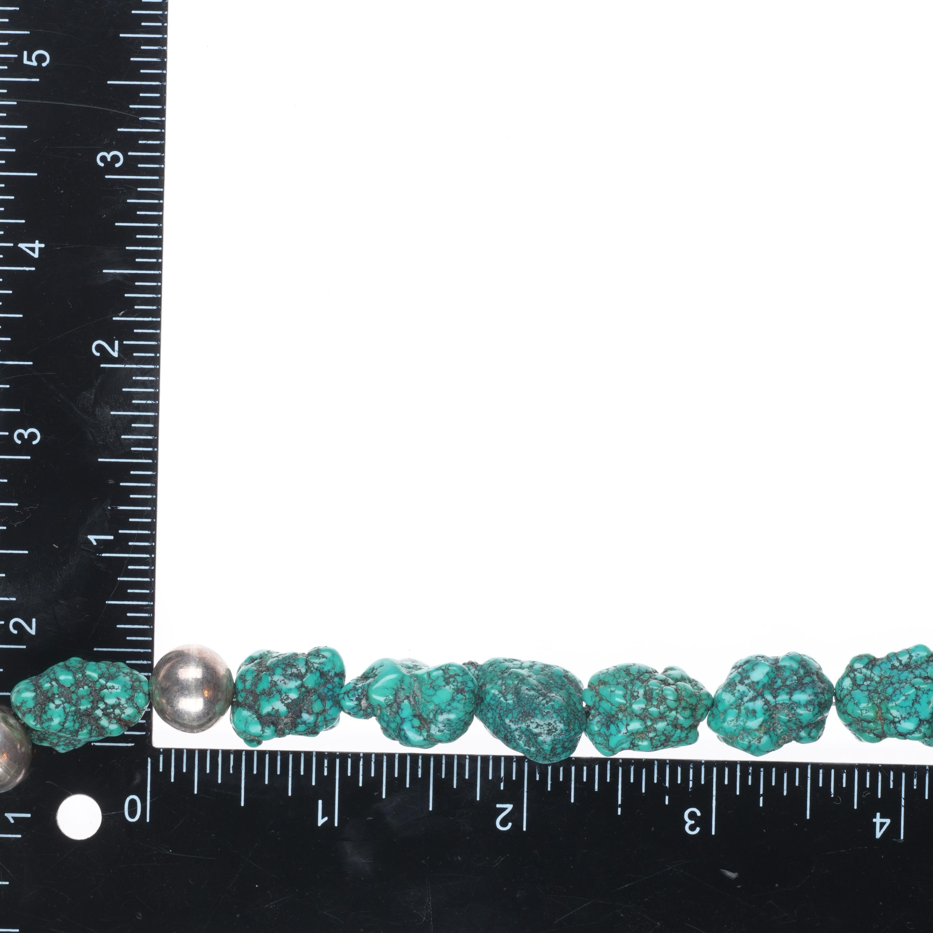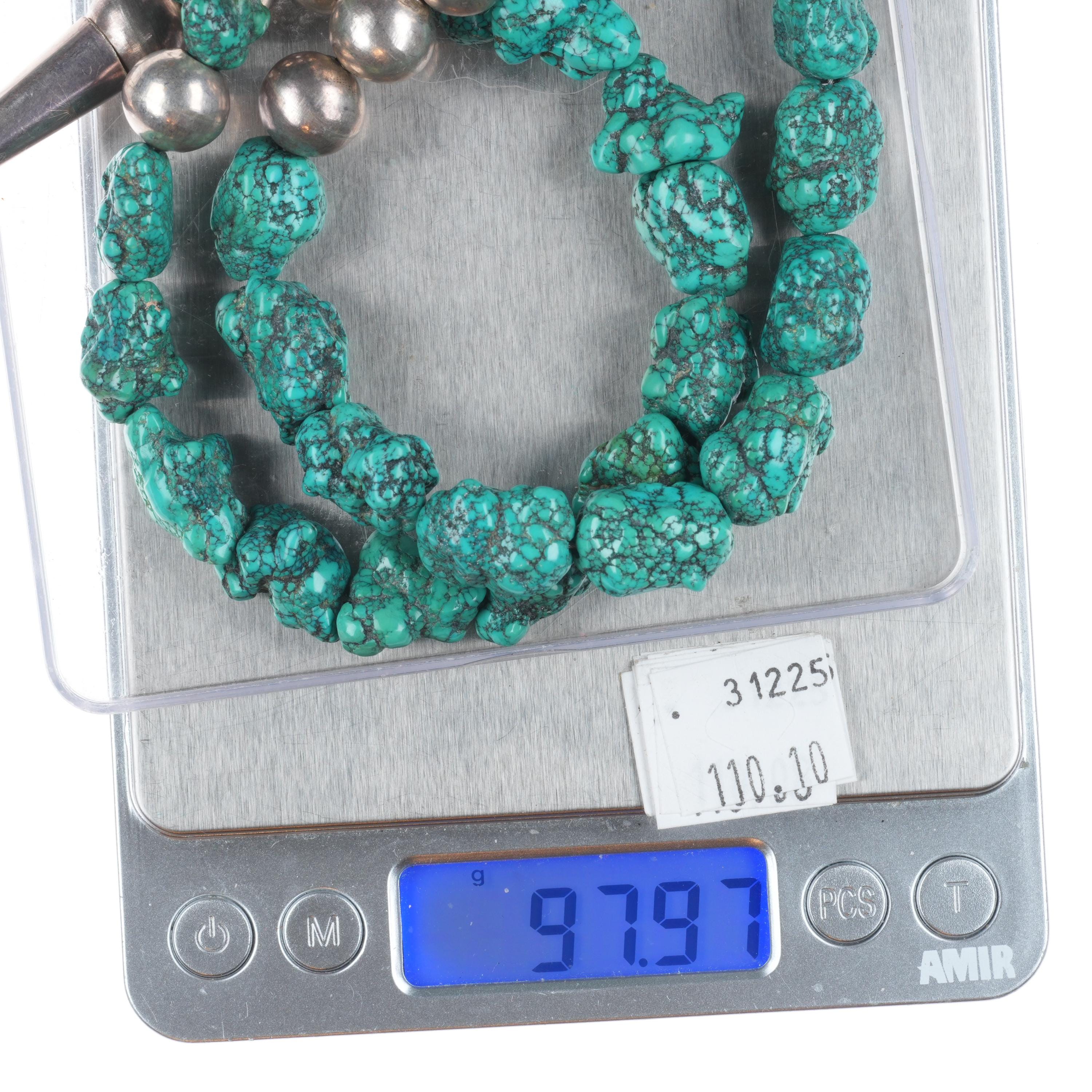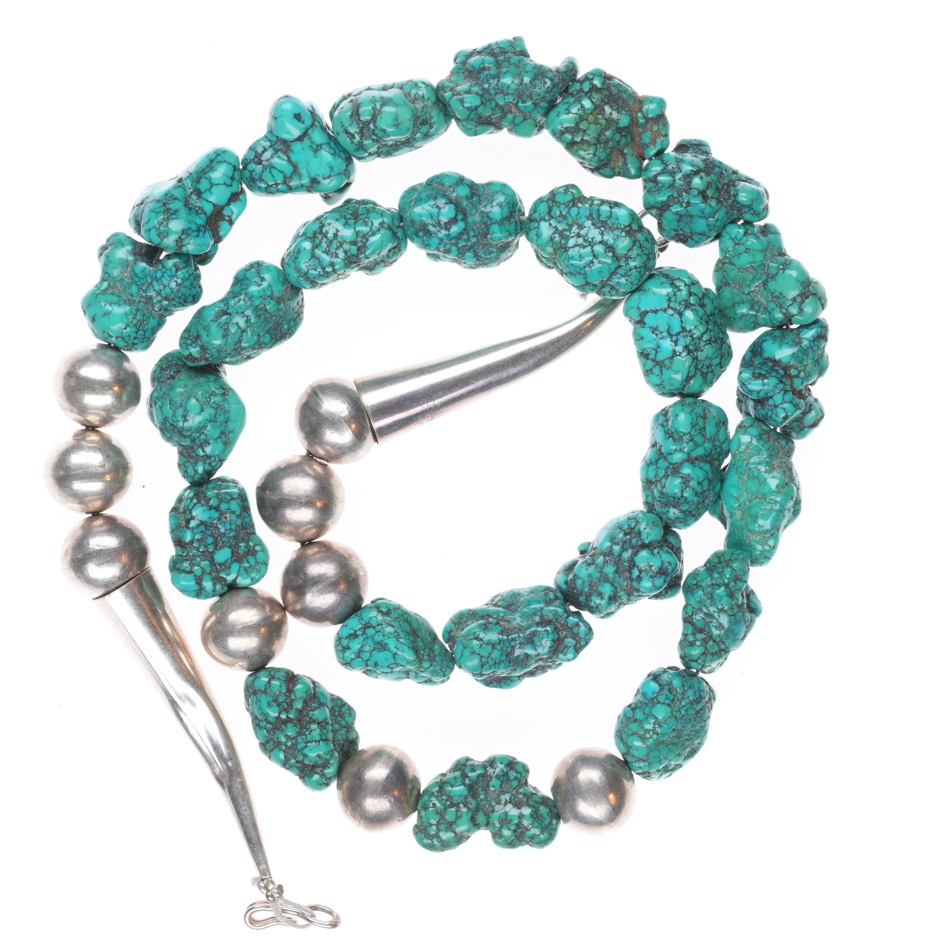 24" Vintage Navajo pearls/spiderweb turquoise beaded necklace handmade beads. Solid sterling silver tested and guaranteed with weight and measurements in the pictures. Circa third quarter of the 20th century. No apparent markings. High quality handmade Navajo pearl beads, turquoise looks nice to me. Dents to top cones.