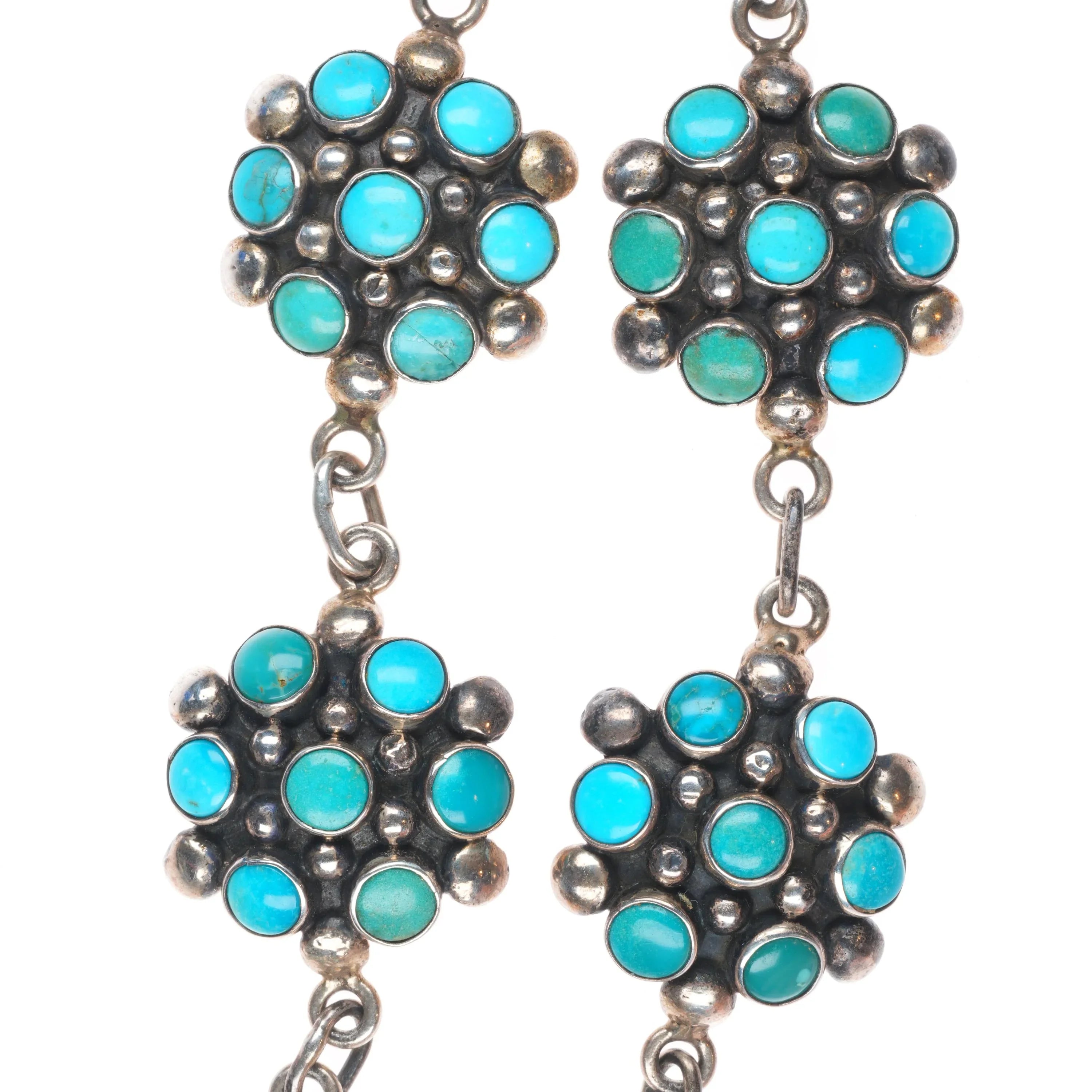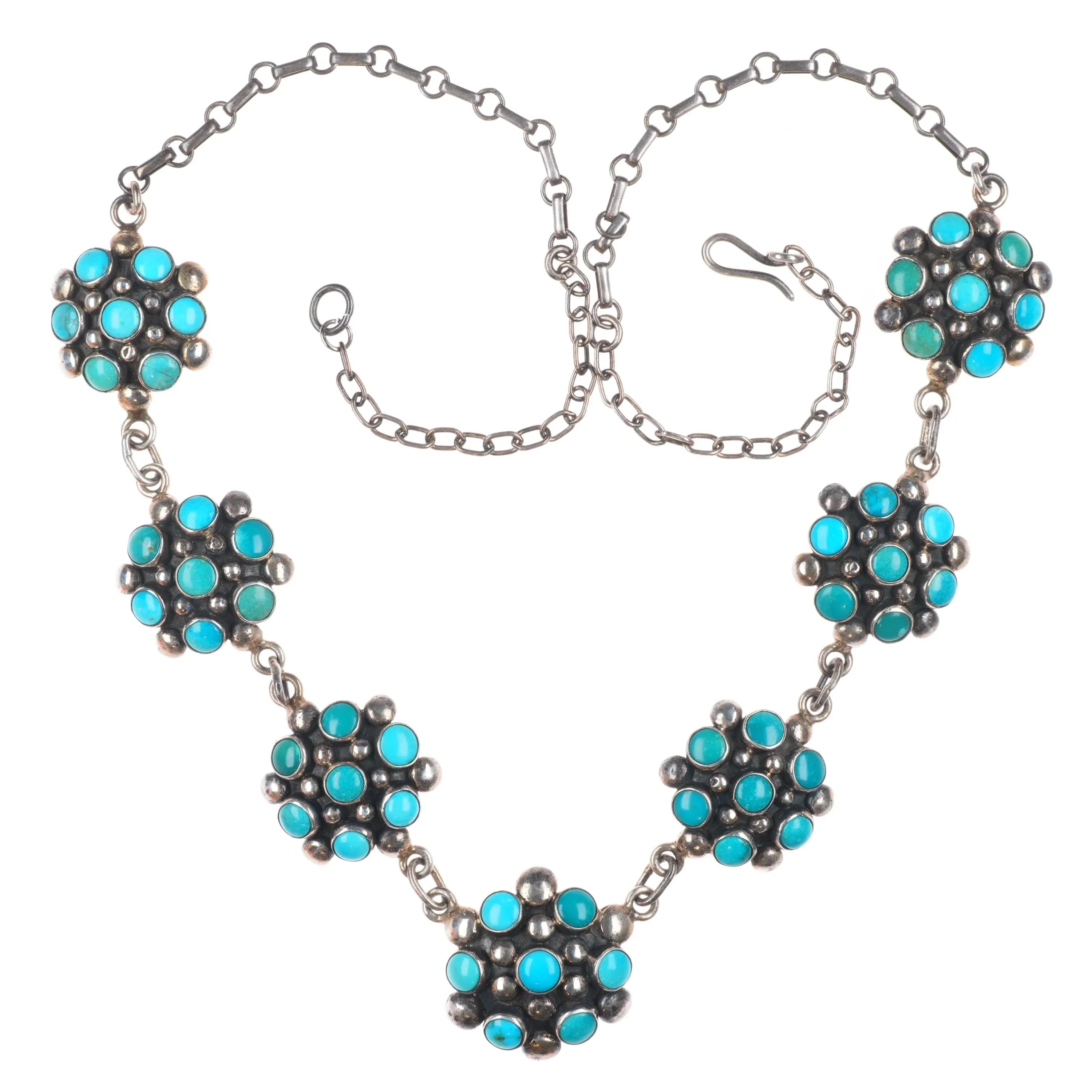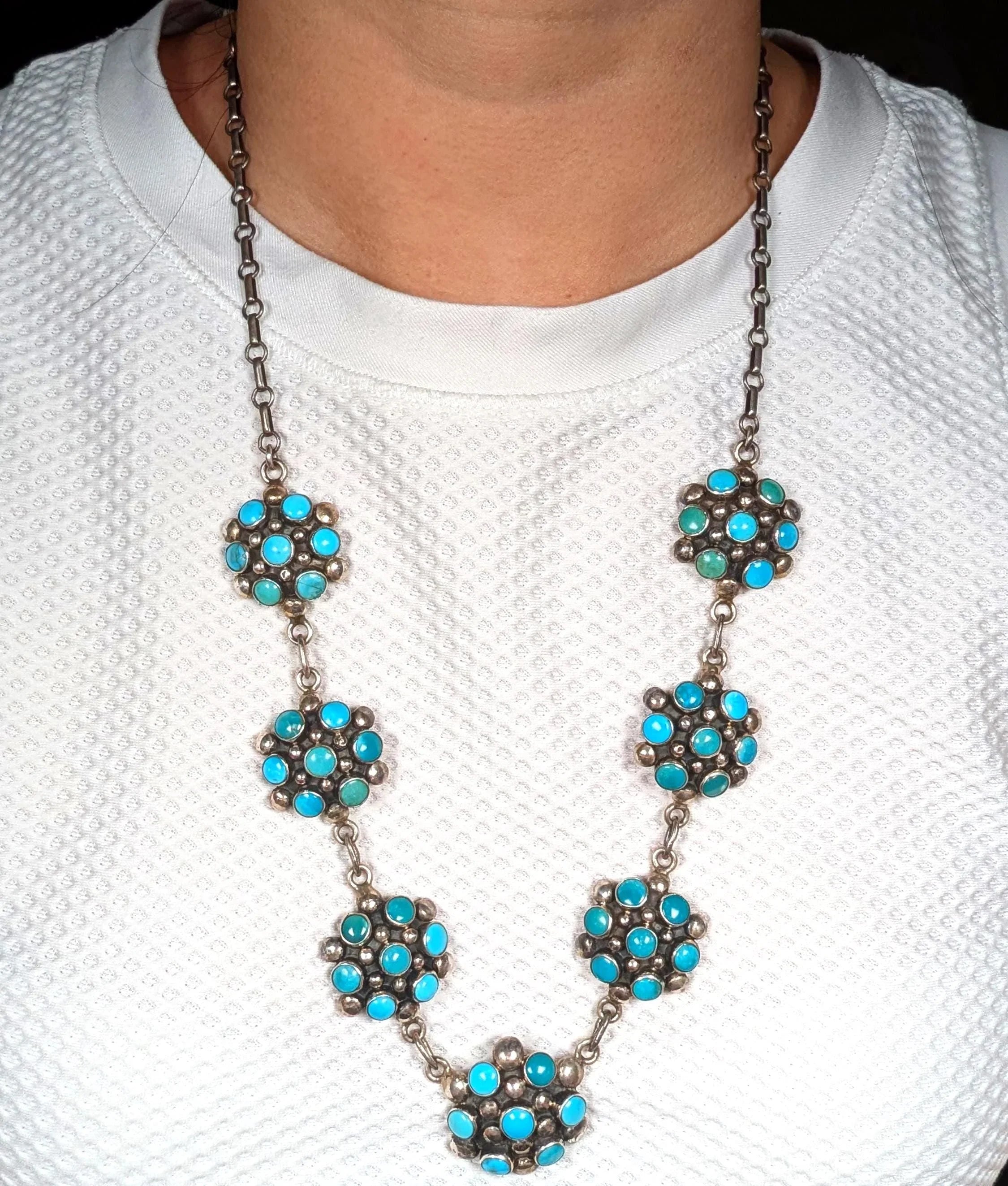 25.5" Zuni sterling silver Vintage Snake eye turquoise cluster necklace. Solid sterling silver tested and guaranteed with weight and measurements in the pictures. No issues, circa third quarter of the 20th century with no apparent markings. These balls are really heavy, I believe this was shorter and it was extended. The extra links could be removed easily to make it shorter.