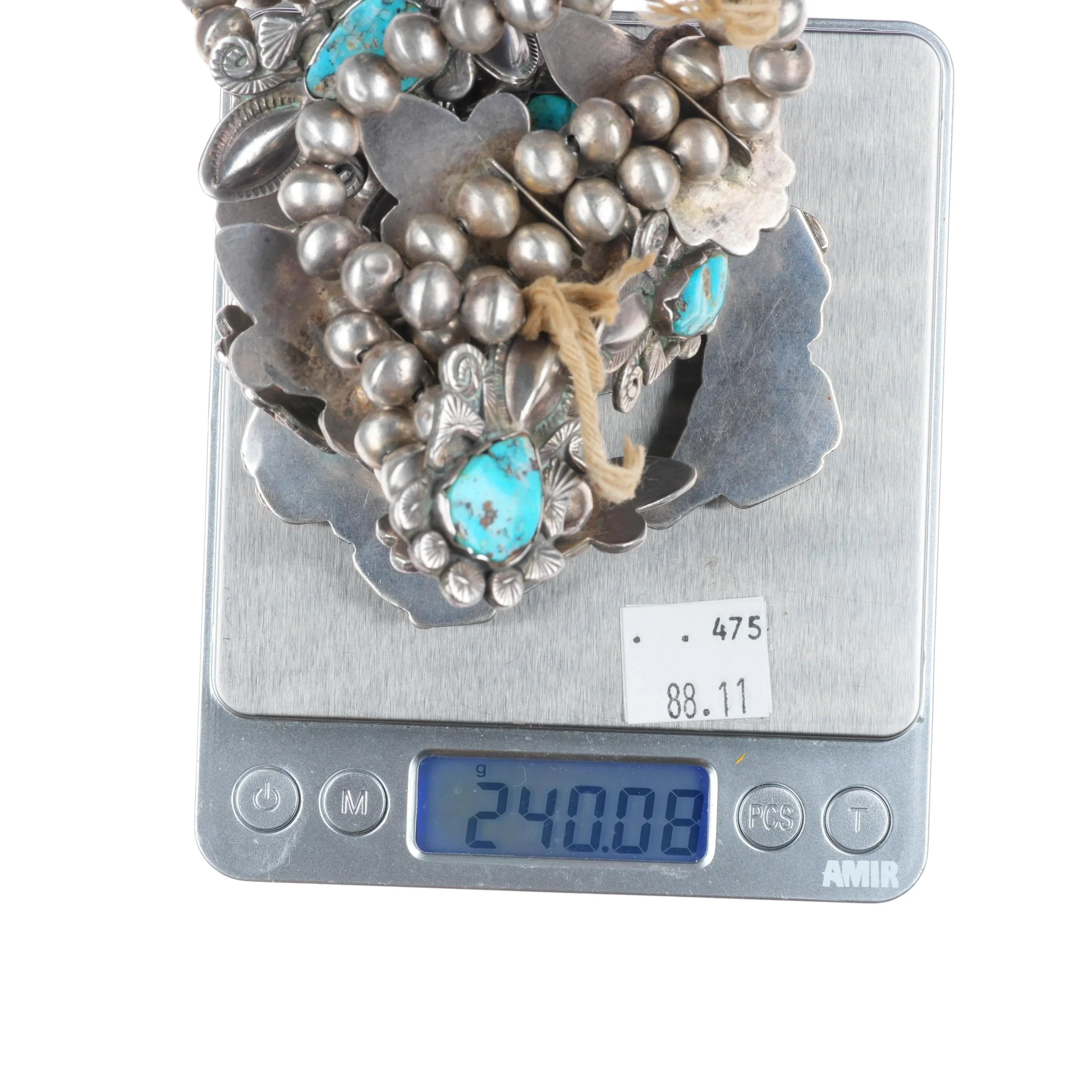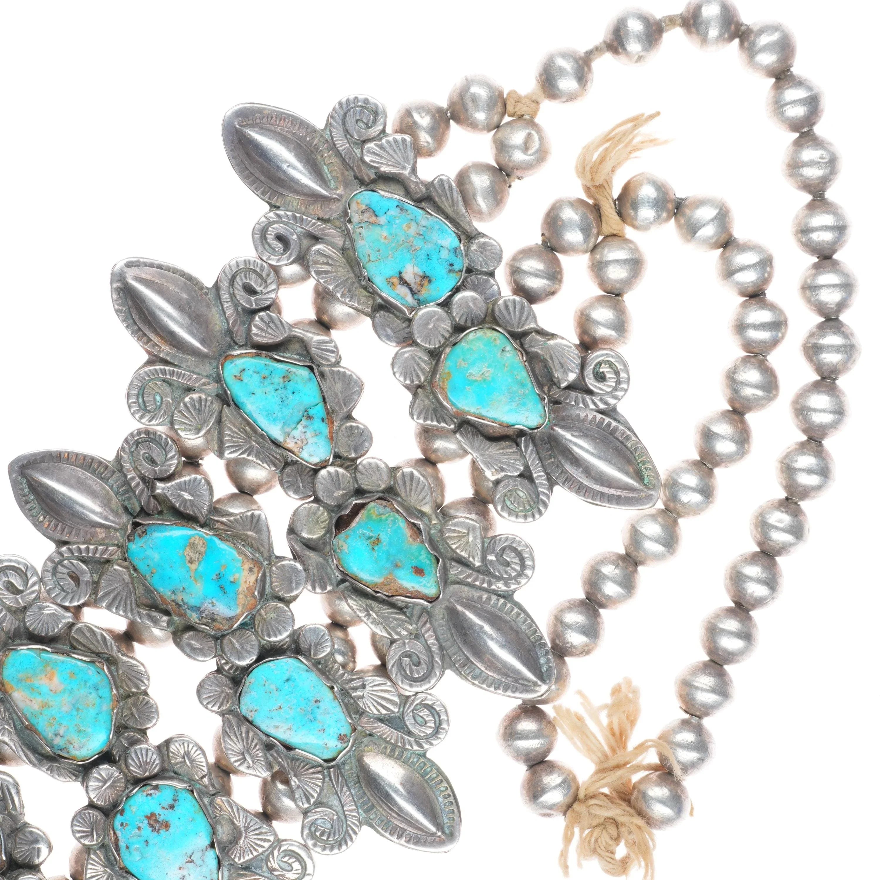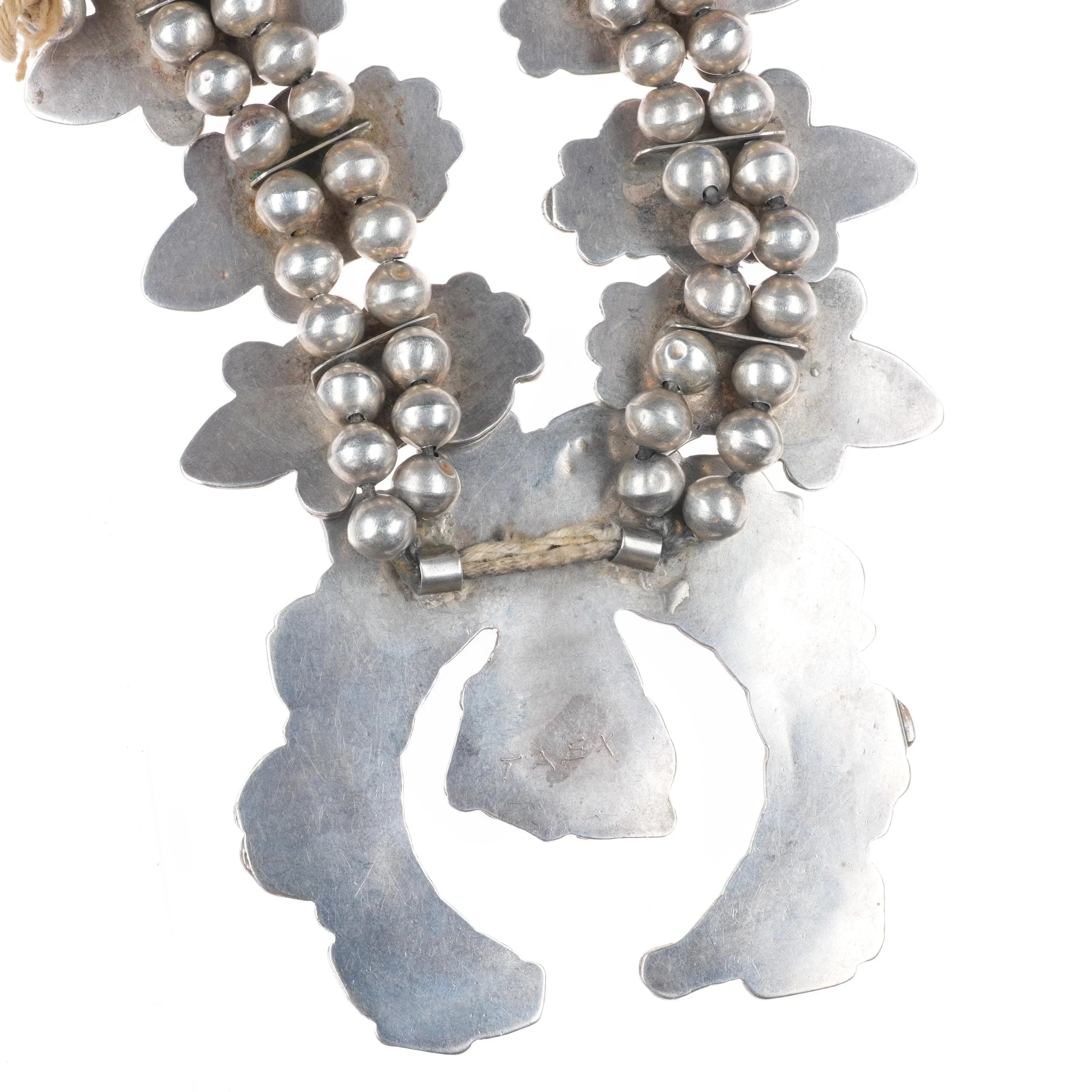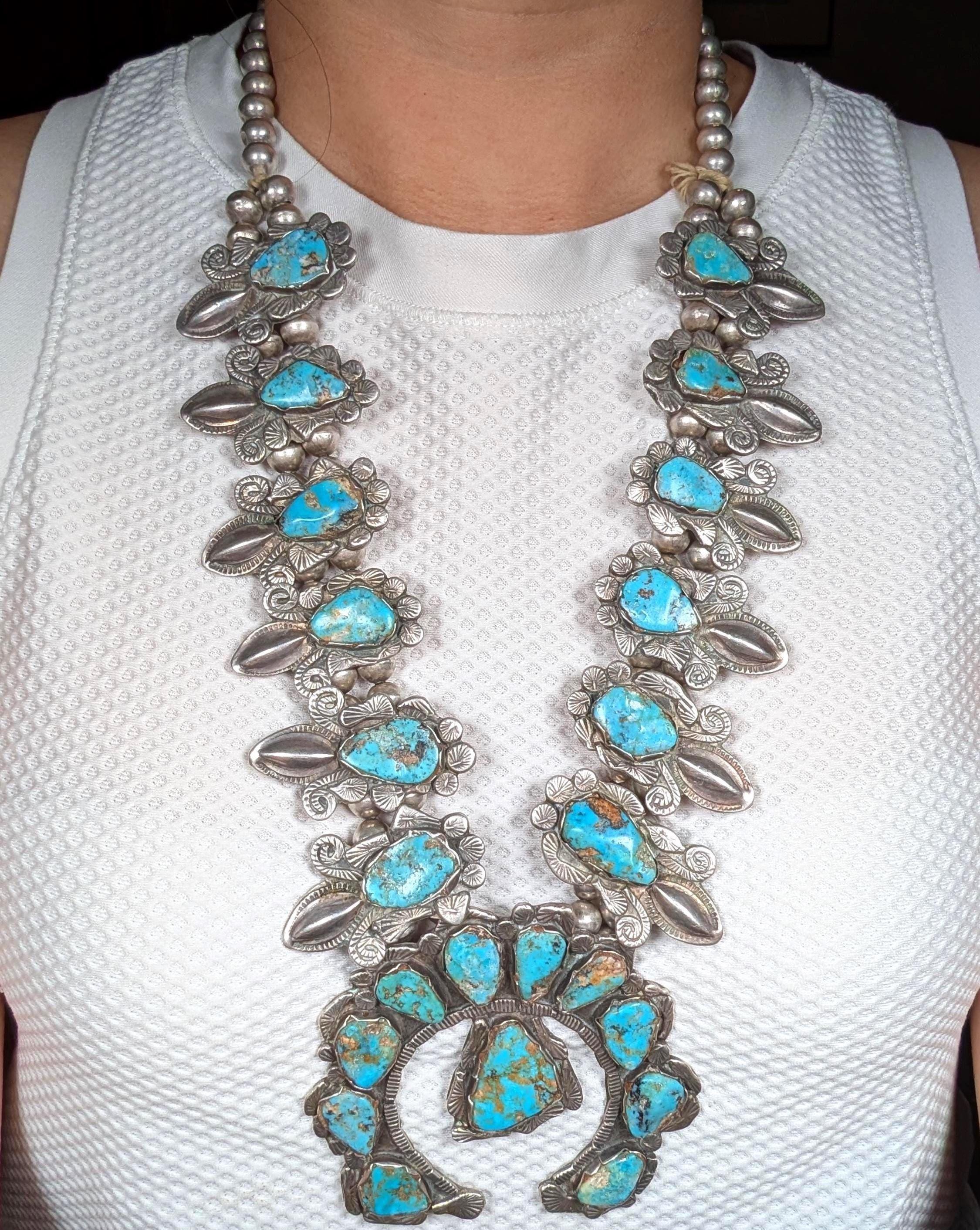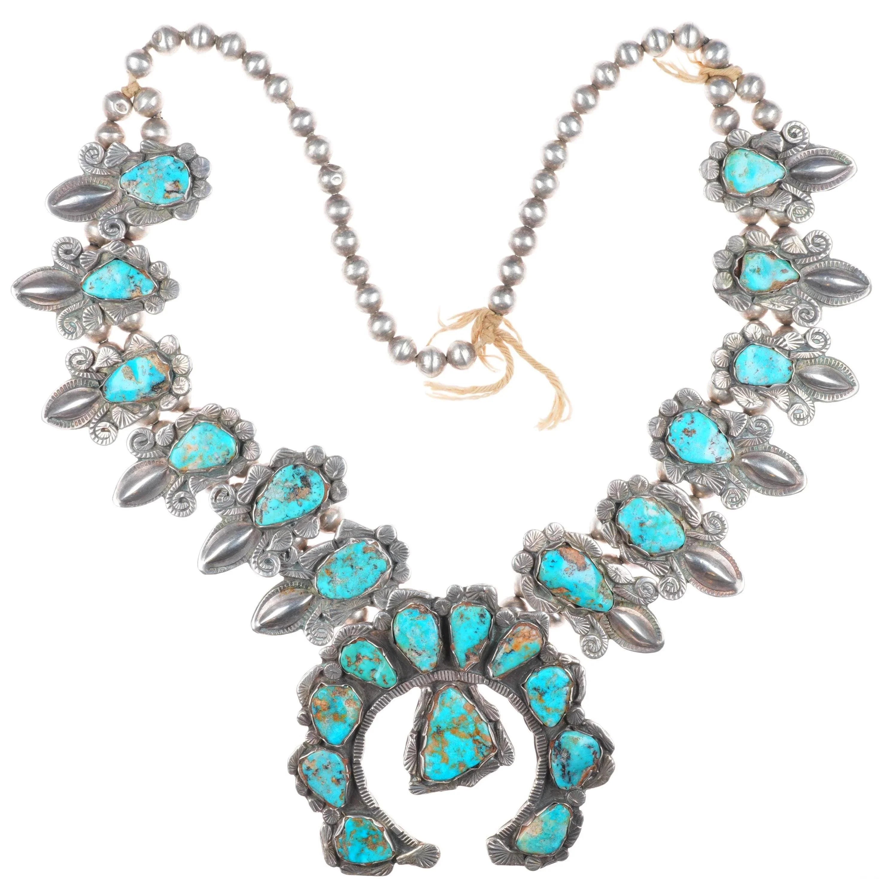 Large Dan Simplicio Zuni turquoise/sterling silver squash blossom necklace. Solid sterling silver tested and guaranteed with weight and measurements in the pictures. No issues, circa 1940‘s to mid 20th century. No detectable markings other than CG Wallace code on back of Naja, 26" long.
