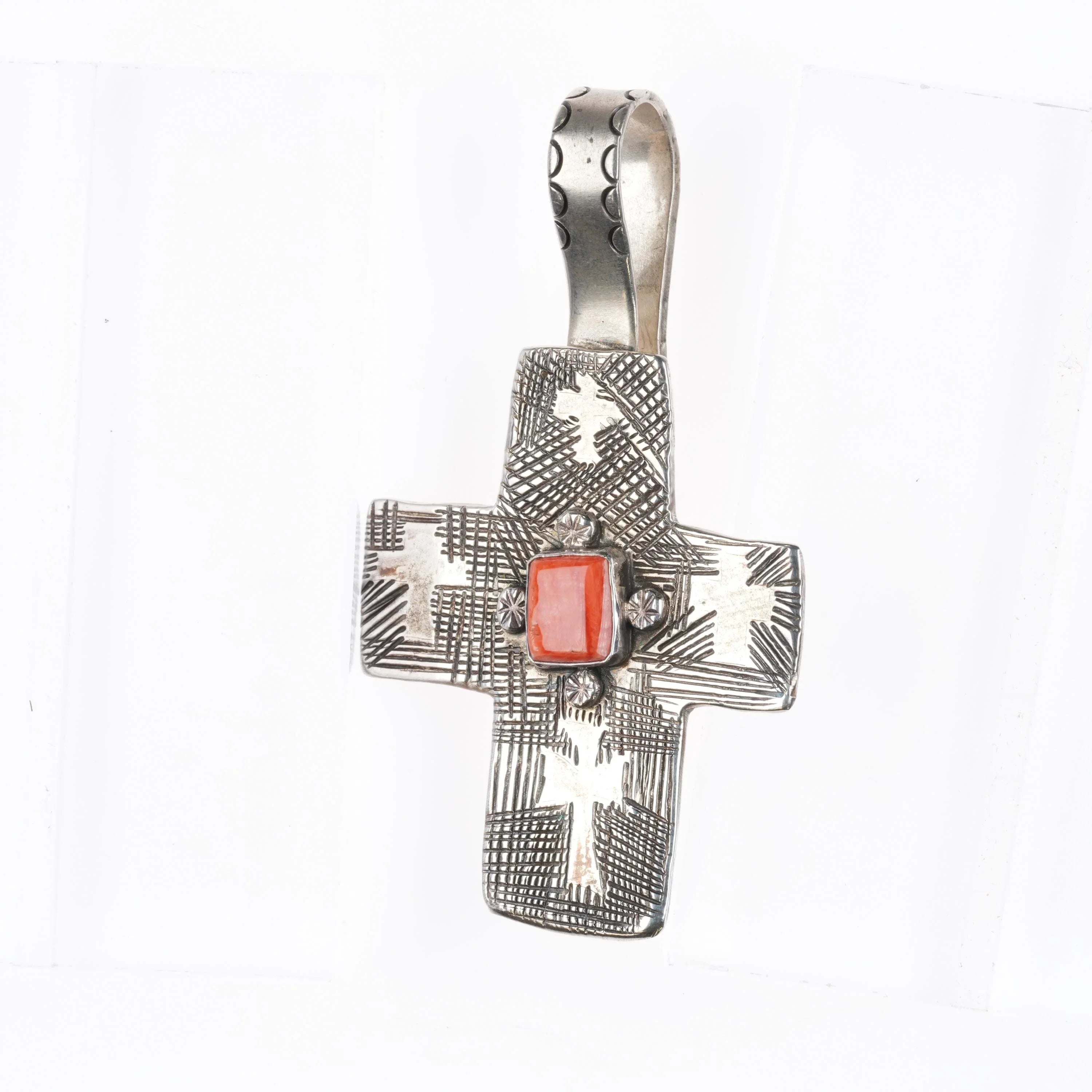 26" LB Southwestern sterling silver spiny oyster cross pendant/beaded necklace Tested and guaranteed solid sterling silver with weight and measurements in the pictures. Buying the Necklace and pendant shown with no damage, high quality workmanship with unknown signature. Purchased in Santa Fe in the 90‘s. Worn little if any.