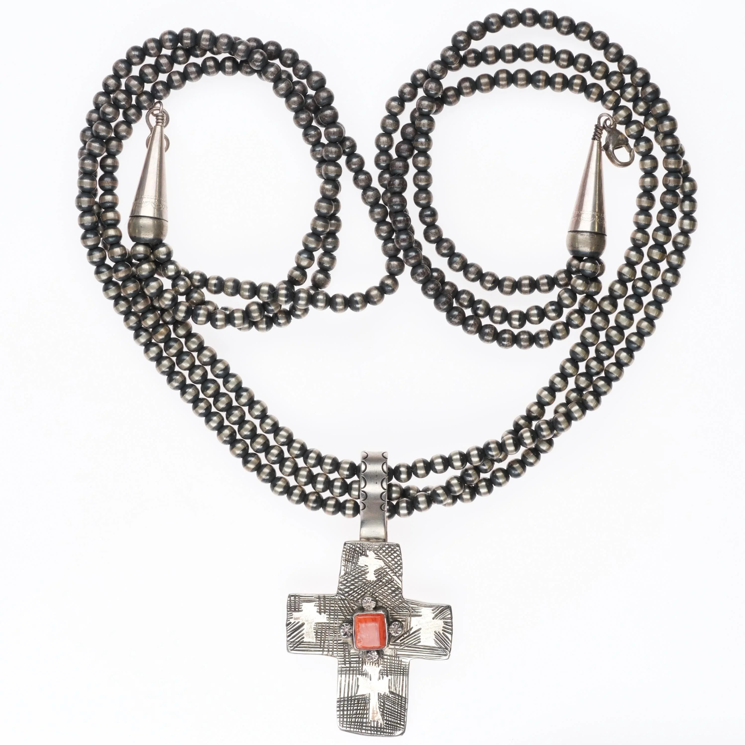 26" LB Southwestern sterling silver spiny oyster cross pendant/beaded necklace