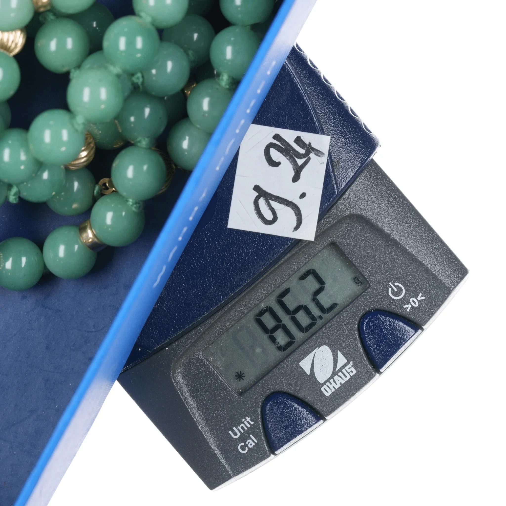 28" Vintage 14k/jade beaded necklace. 11mm beads. All the beads are solid 14k gold, clasp marked, beads tested. A few tiny dents on gold beads, no damage to Jade beads.