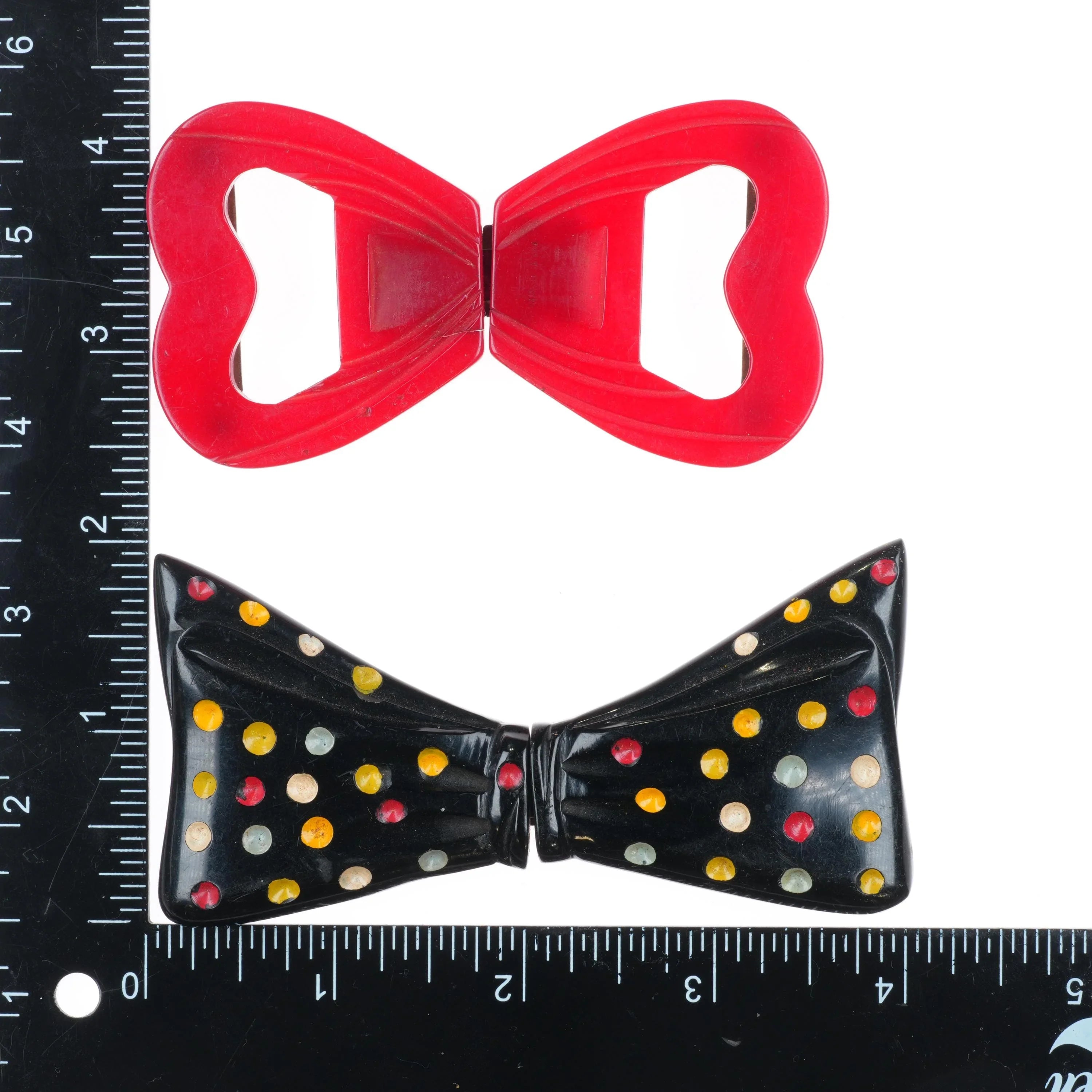 3 c1940‘s Bakelite 2pc Belt buckle sets Red Hearts, butterscotch, polka dot bow. Selling the three shown with no apparent damage from the seccond quarter of the 20th century. Looks like the bottom tow take 1" belt, the butterscotch a little smaller. Measurements in pictures.