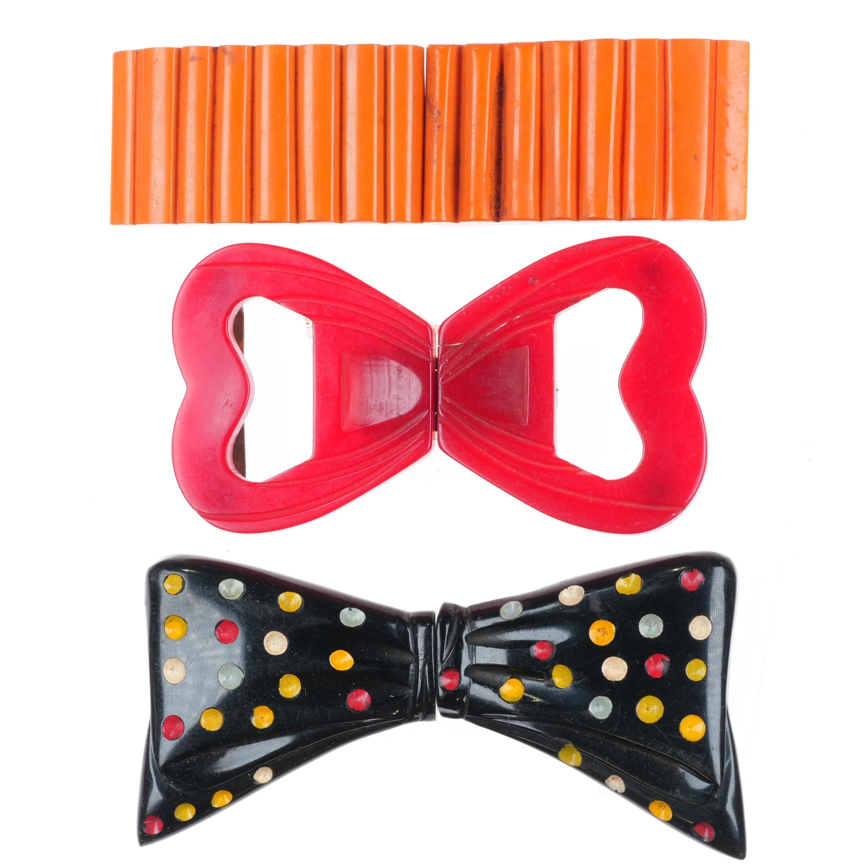 3 c1940's Bakelite 2pc Belt buckle sets Red Hearts, butterscotch, polka dot bow