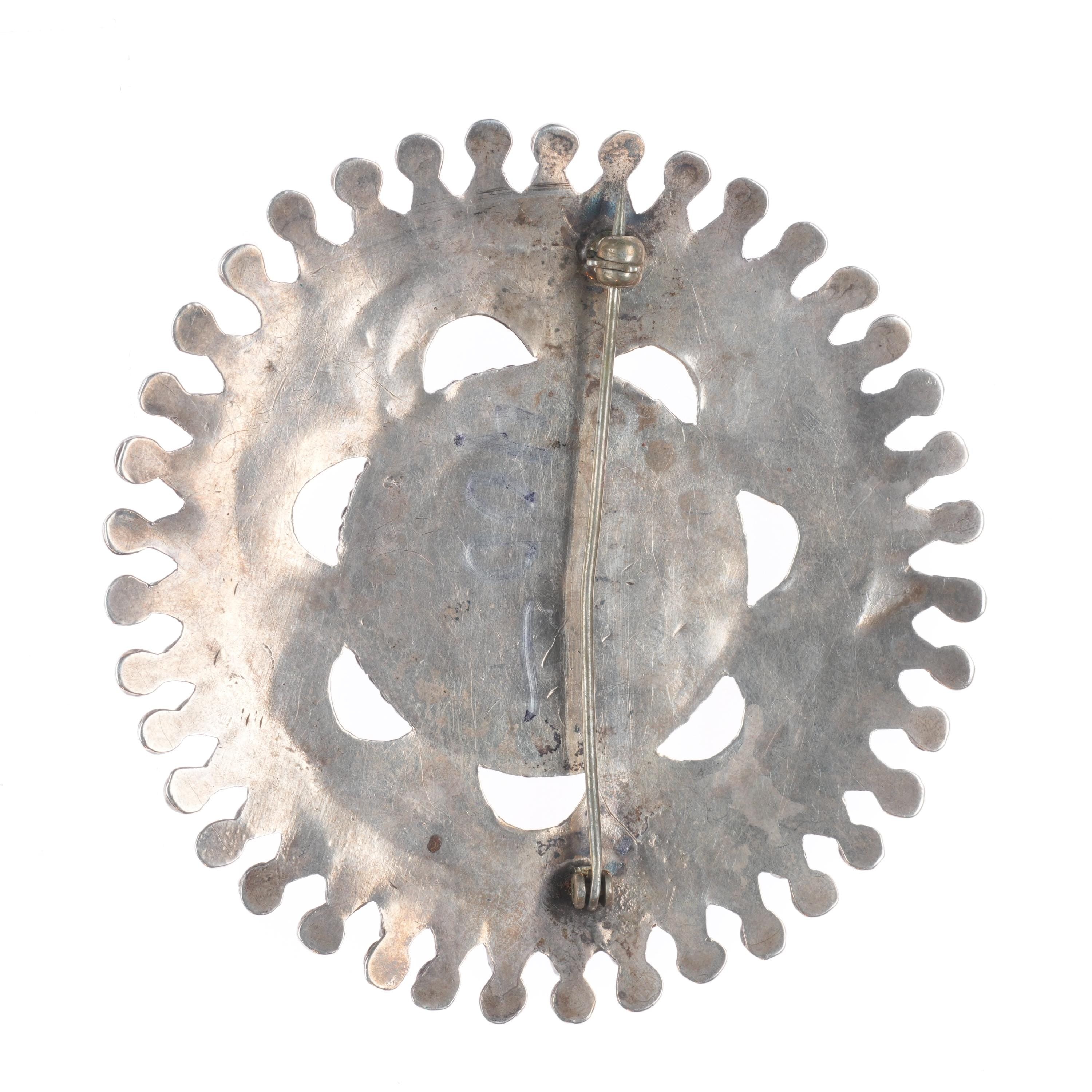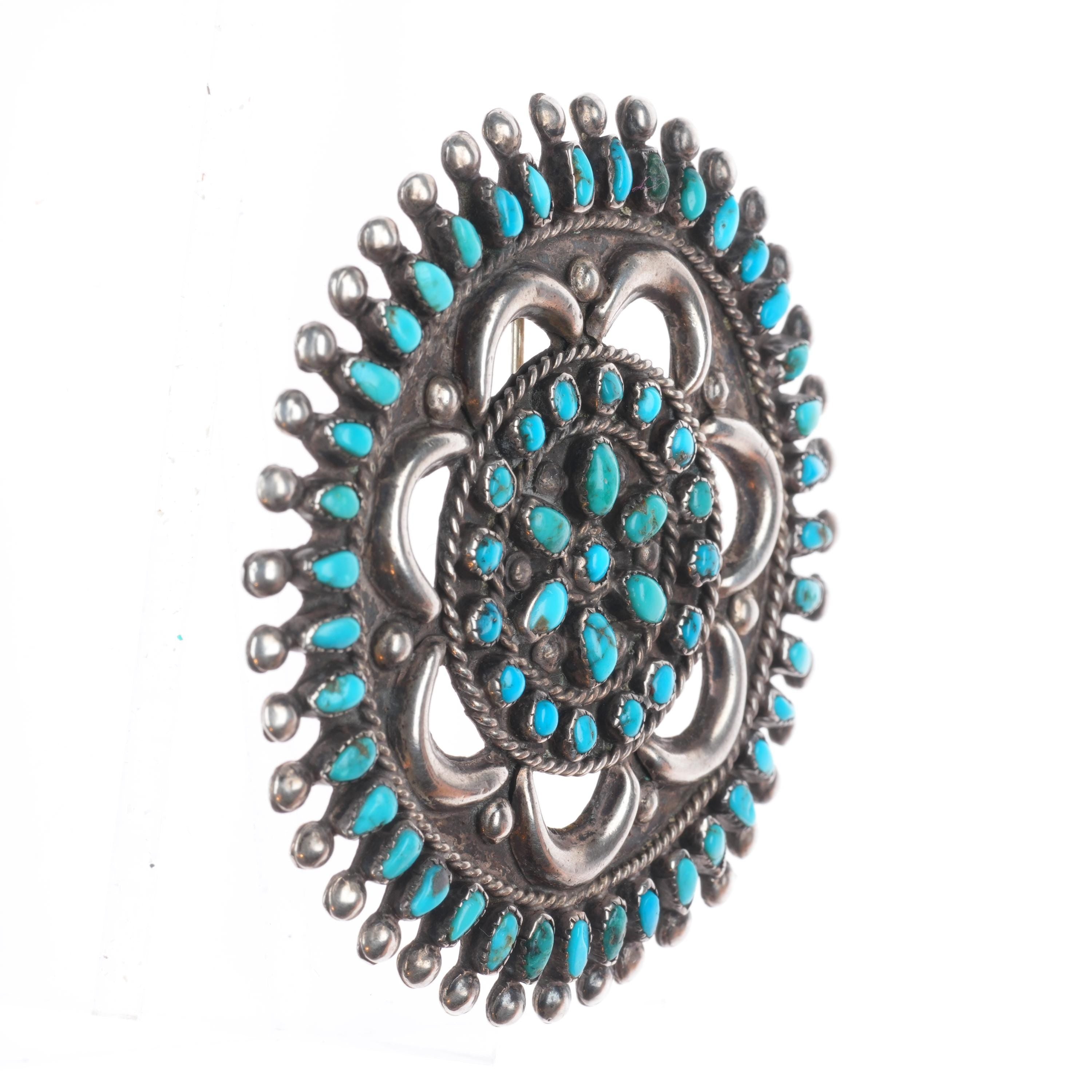 40's-50's Large Zuni needlepoint turquoise sterling silver repousse pin/brooch