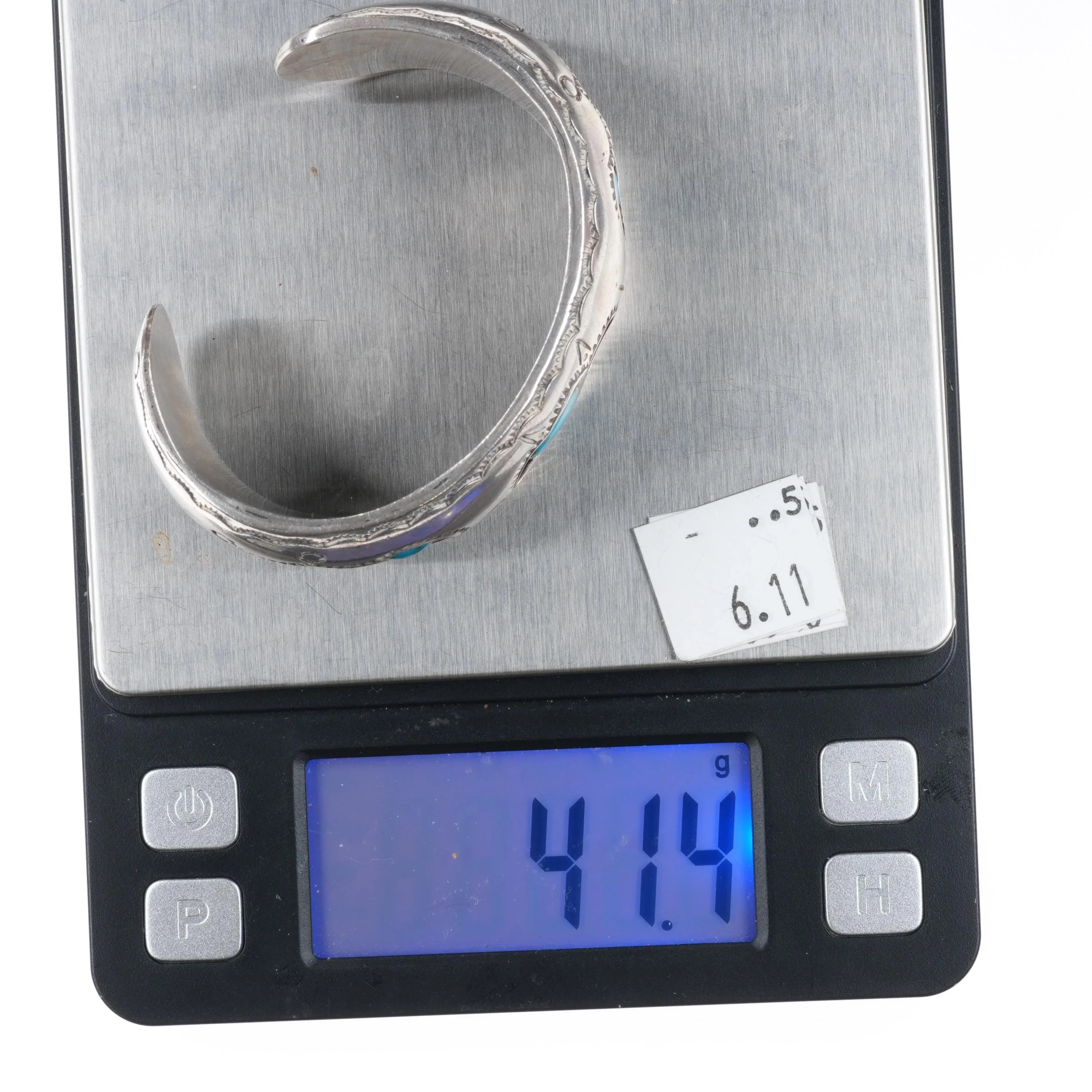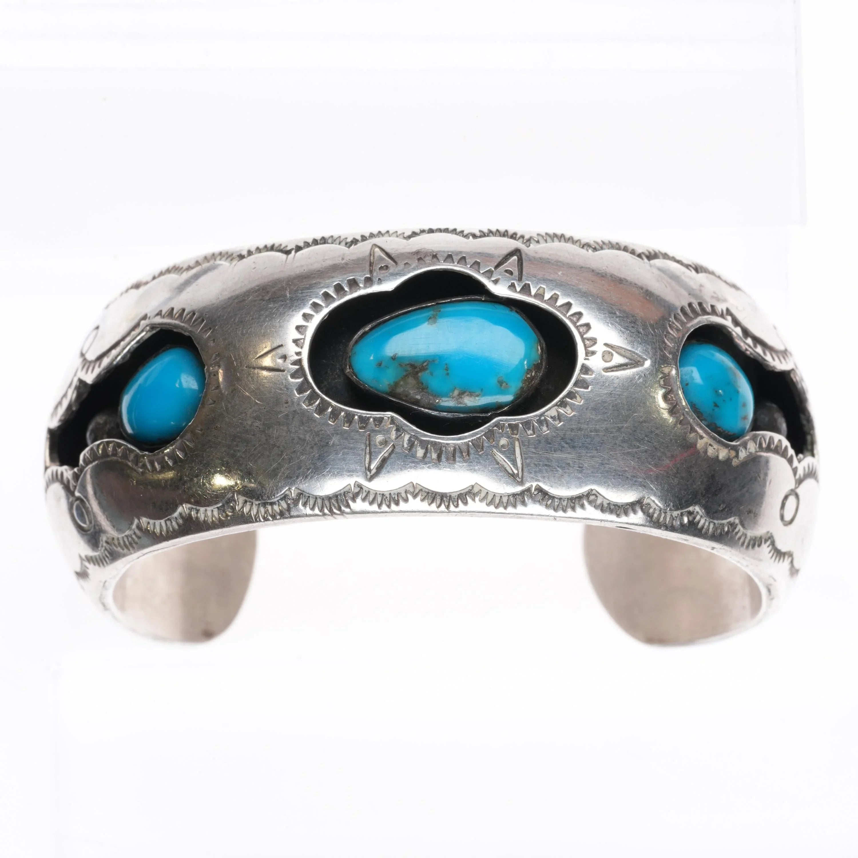 6.1" 1970's Navajo sterling silver turquoise shadowbox 3 stone cuff bracelet