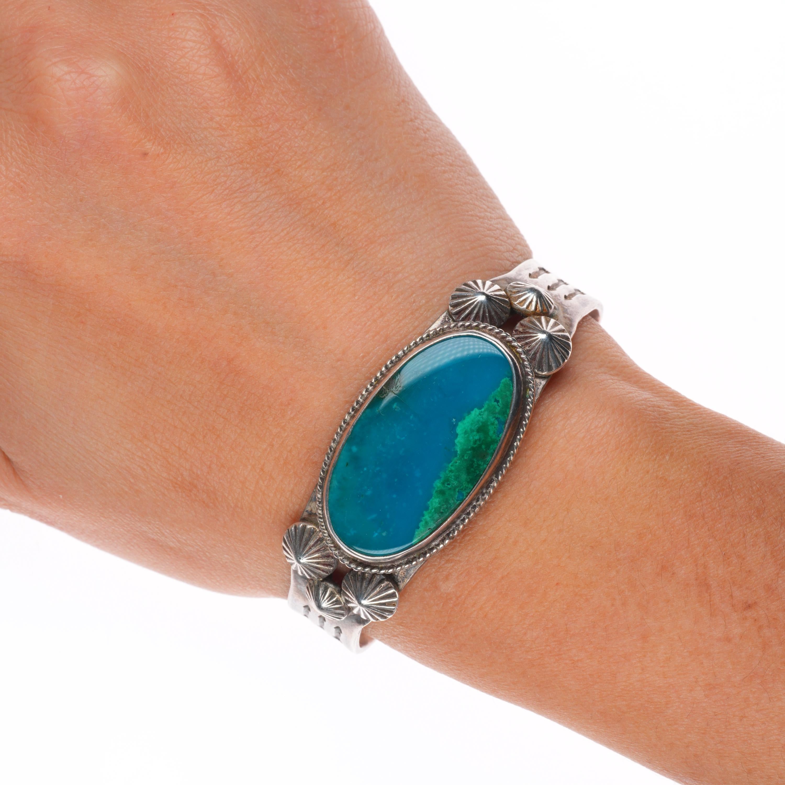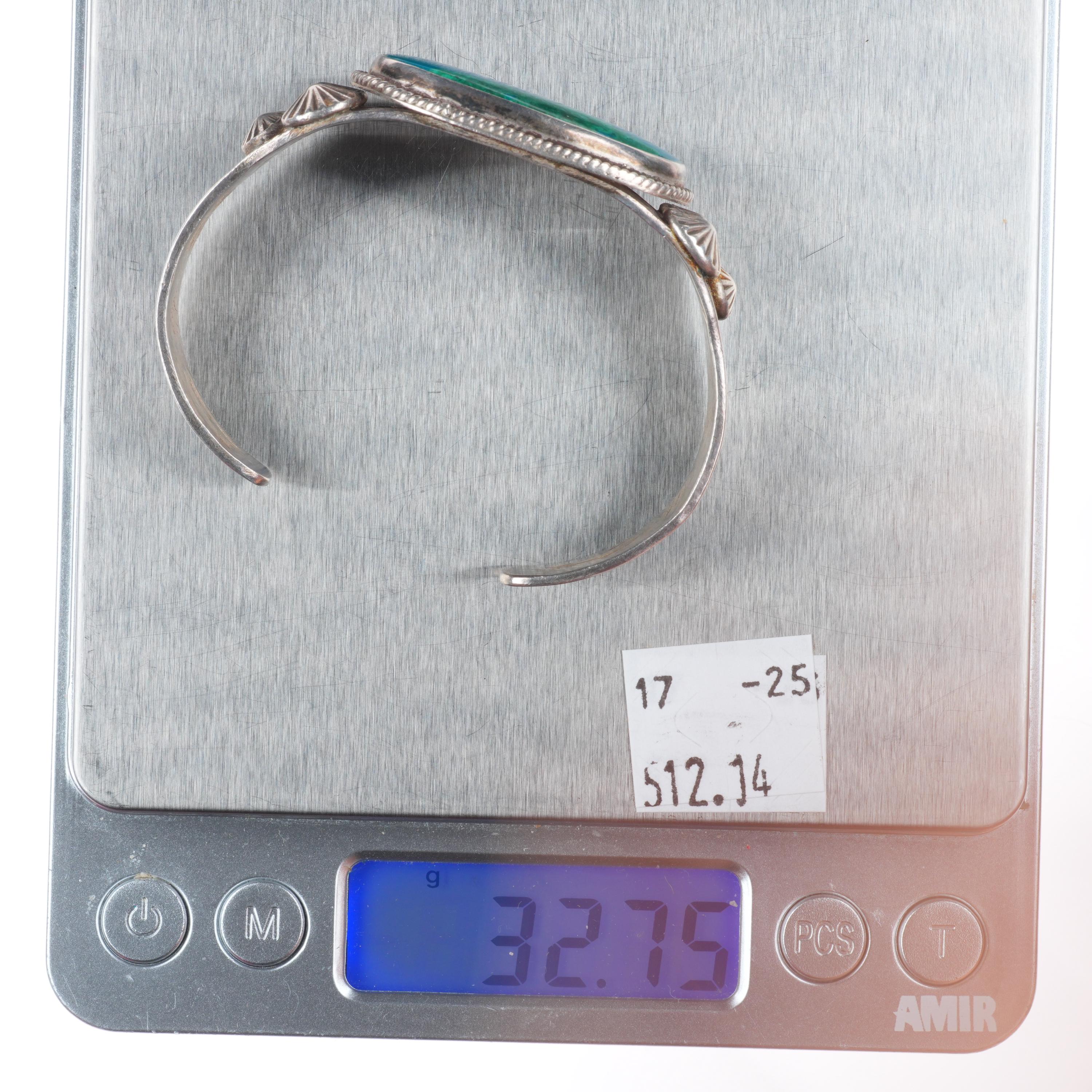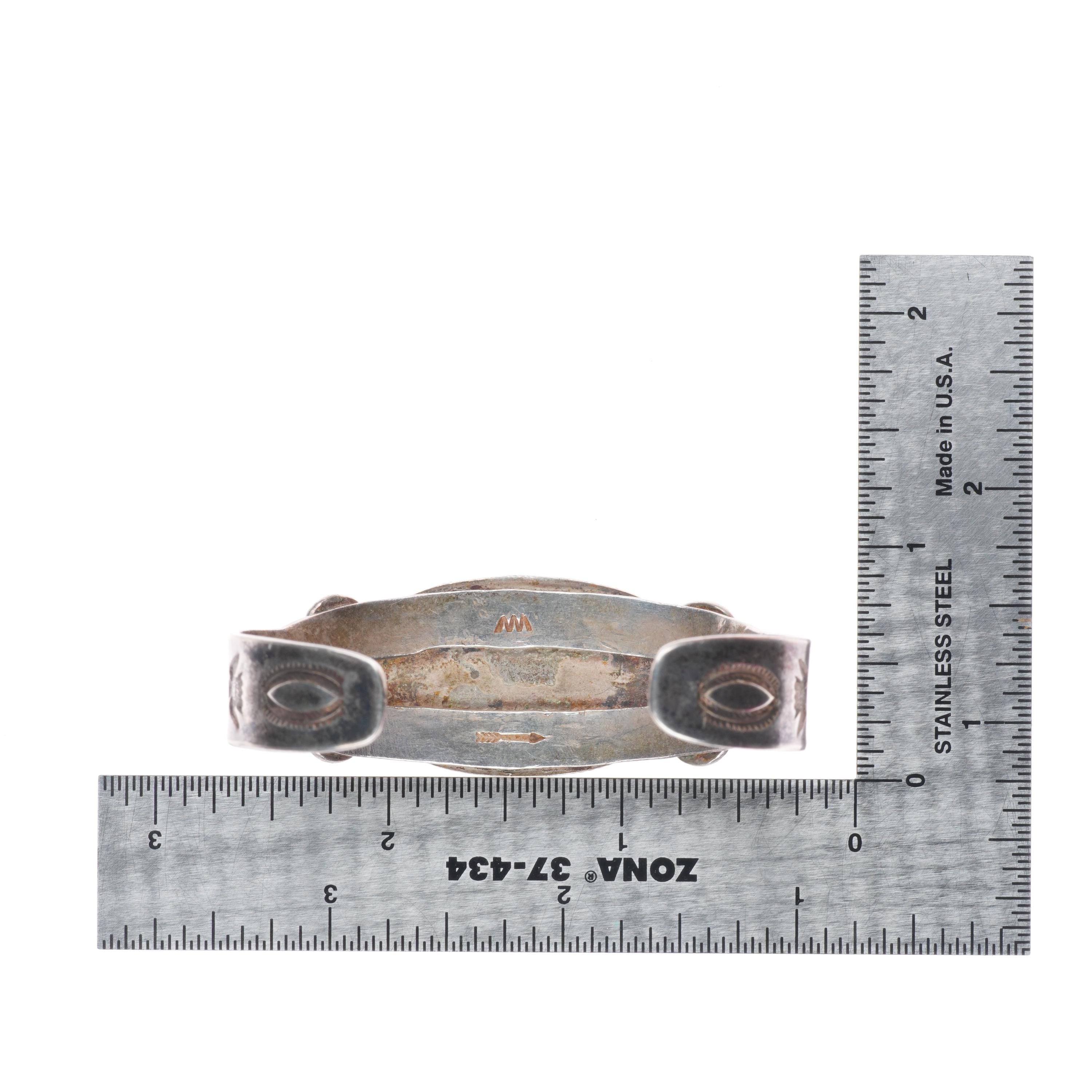 6.1" 30's-40's Navajo Gem Silica sterling silver stamped cuff bracelet. Tested and guaranteed solid sterling silver with weight and measurements in pictures. Great condition with age appropriate wear, circa second quarter of the 20th century. Unidentified by me hallmark. Tight/short/stable fissure or fracture coming out of brown matrix shown in pics.