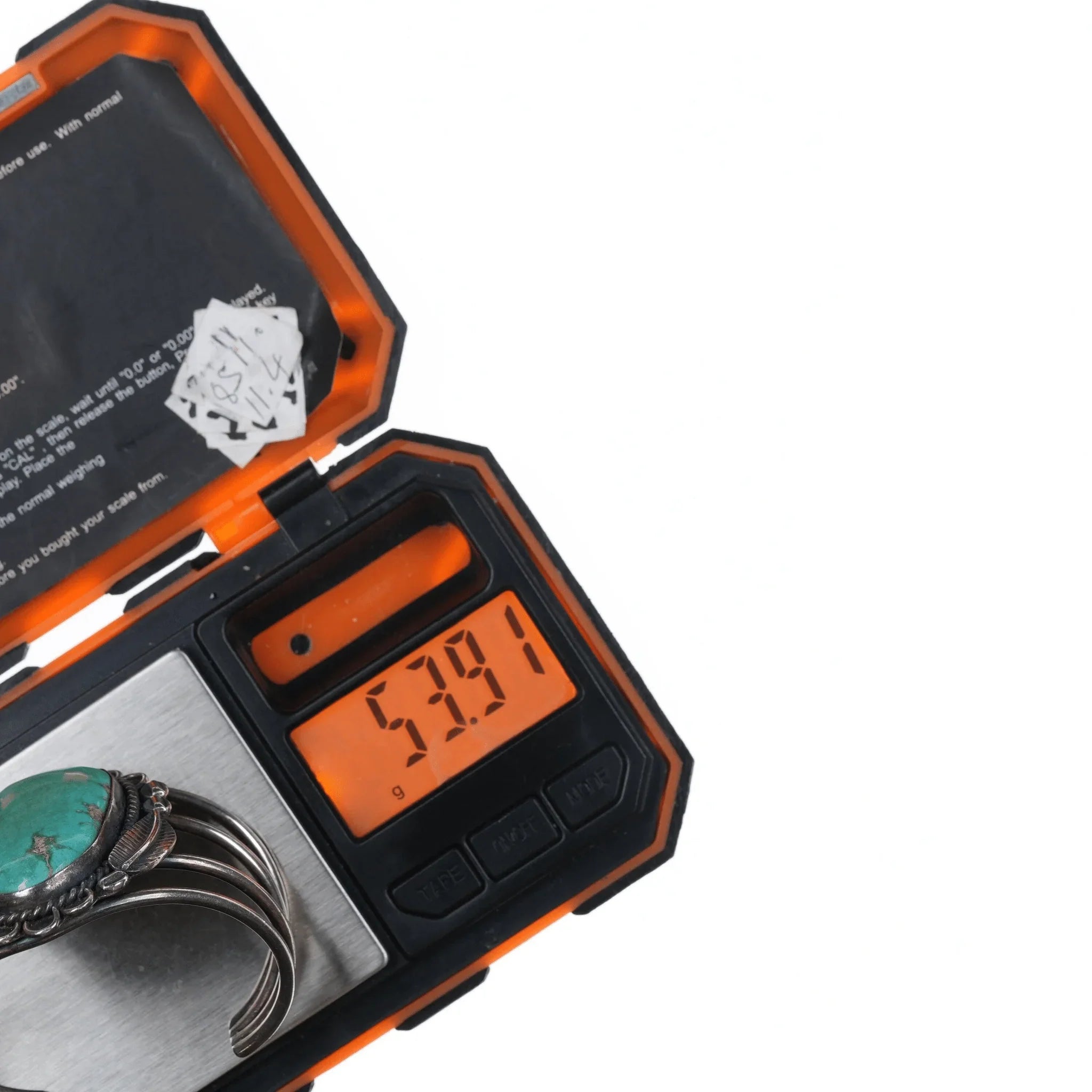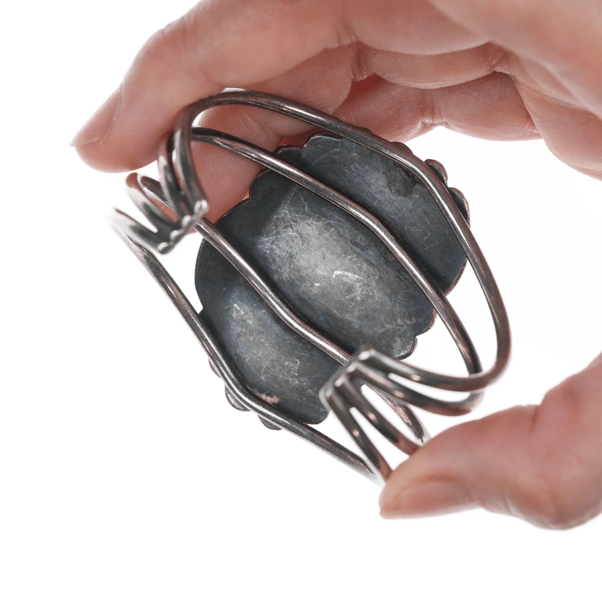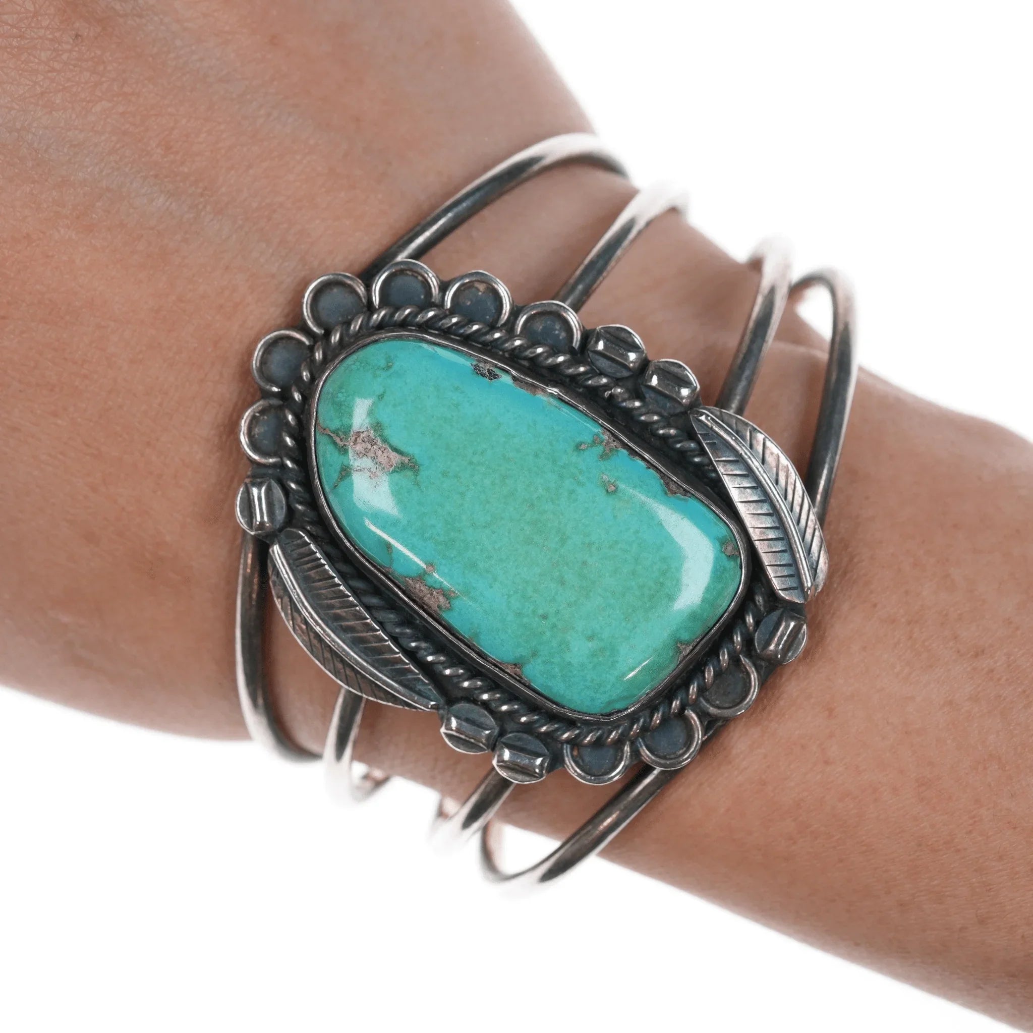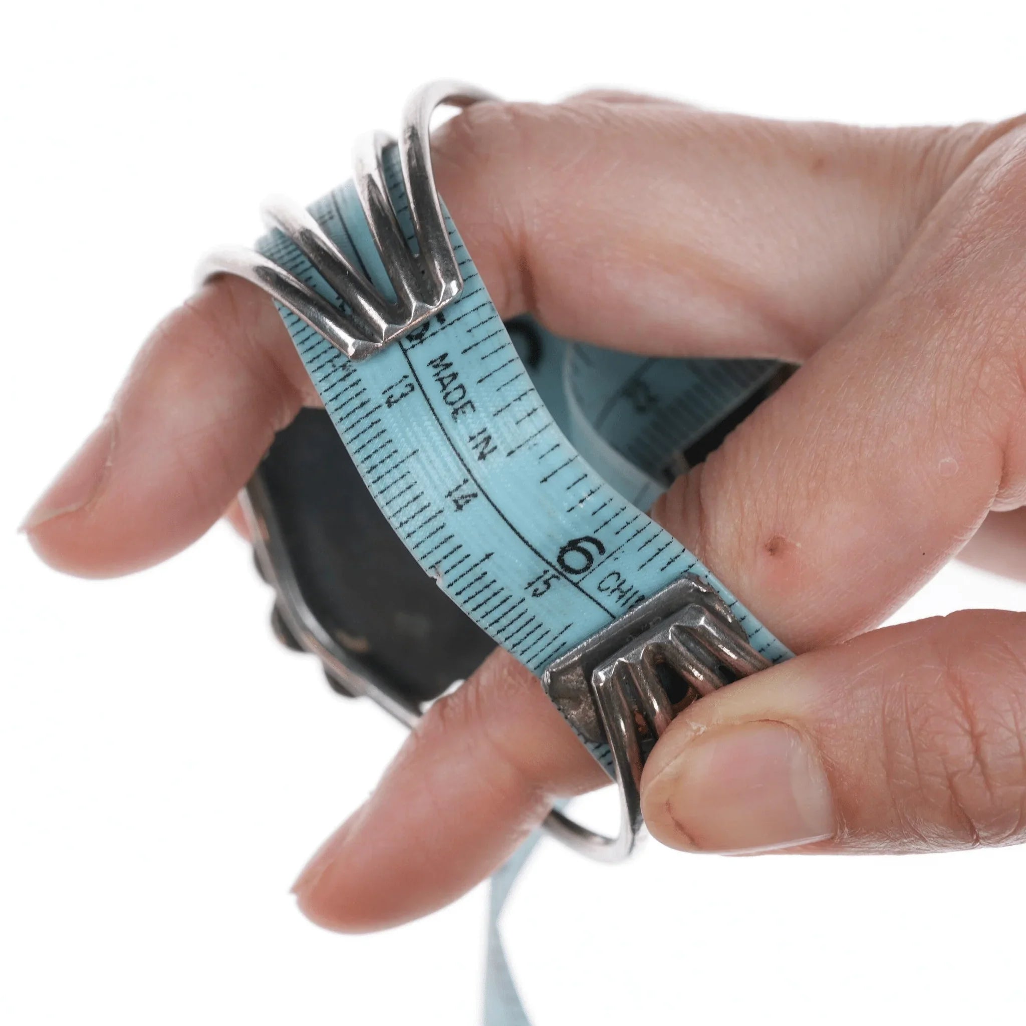 6 1/8" 60's Navajo silver cuff bracelet with turquoise<br><br> Marked or unmarked as shown in pics, weight and other measurements in pics. Sorry but my jewelry is stored in a secure location and cannot be accessed for more pictures,<br>videos, or measurements until sold. If you look at pictures/description your<br>question should be answered. Thank you so much for your time and consideration!<br><br>All precious metals are tested and guaranteed. A Native American jewelry piece referred to as "silver" or "ingot" is guaranteed to be at least 90% silver. Bracelets are photographed on a 6" women's wrist.