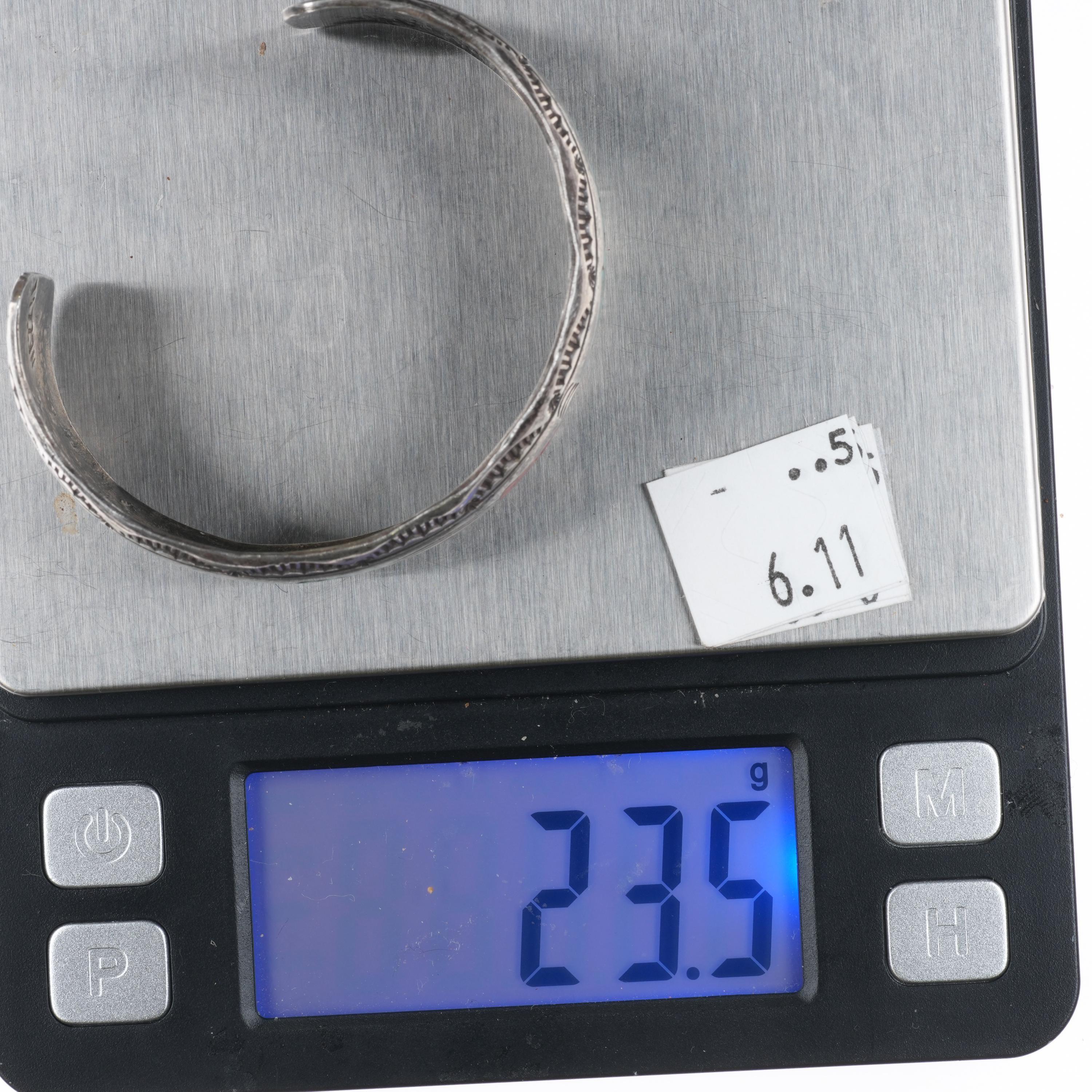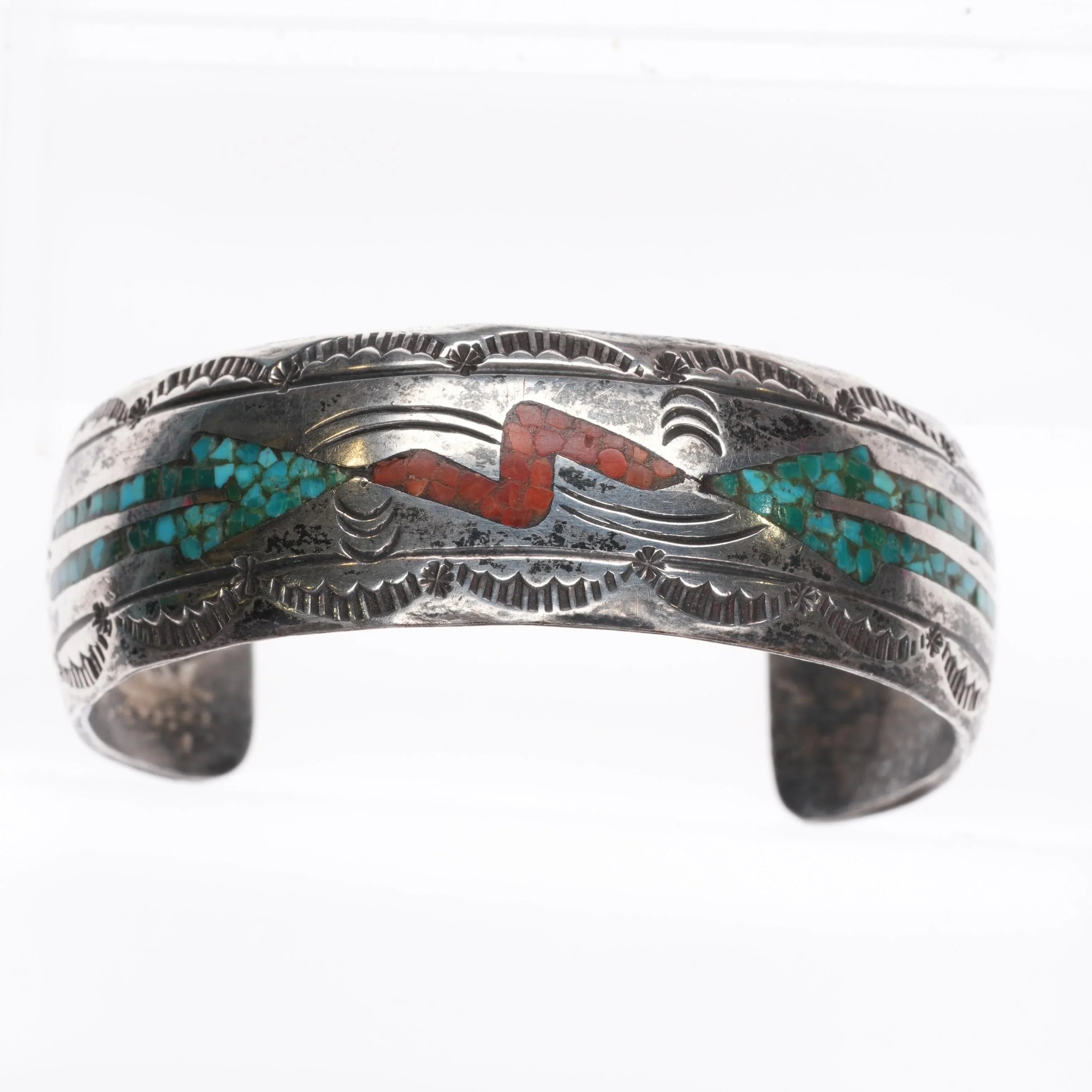 6.1" Nezzie Navajo sterling silver chip inlay cuff bracelet hand stamped edges. Tested and guaranteed solid sterling silver with artists but no purity markings. Weight and measurements in pictures. Some expected wear, no cracks or breaks. Circa 1970‘s.