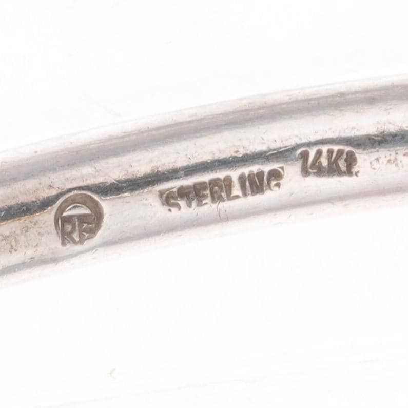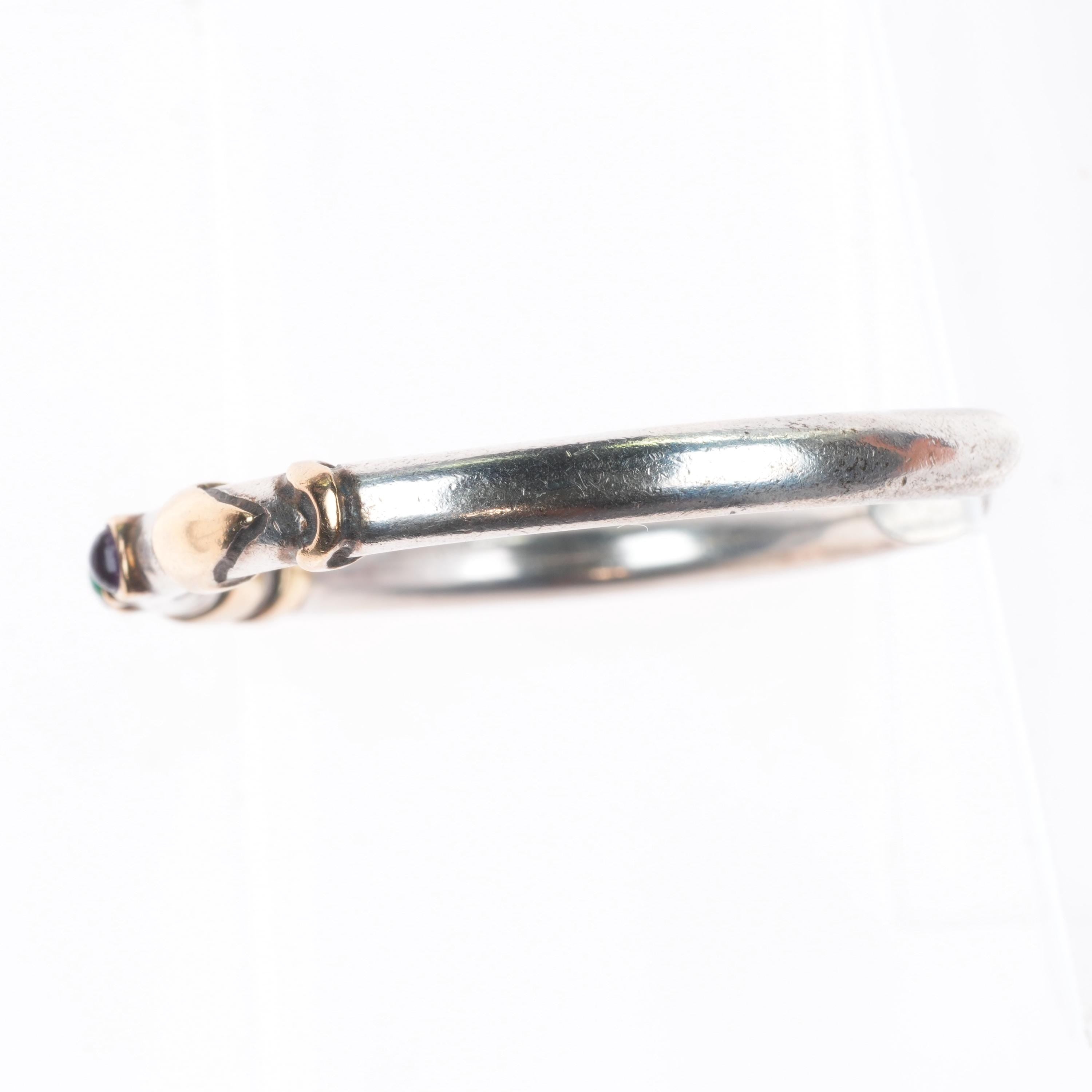 6.1" retro 14k gold/Sterling silver Emerald/Amethyst modernist cuff bracelet. Tested and guaranteed solid sterling silver, with weight and measurements in pictures, circa last quarter of the 20th century. Unknown artist.