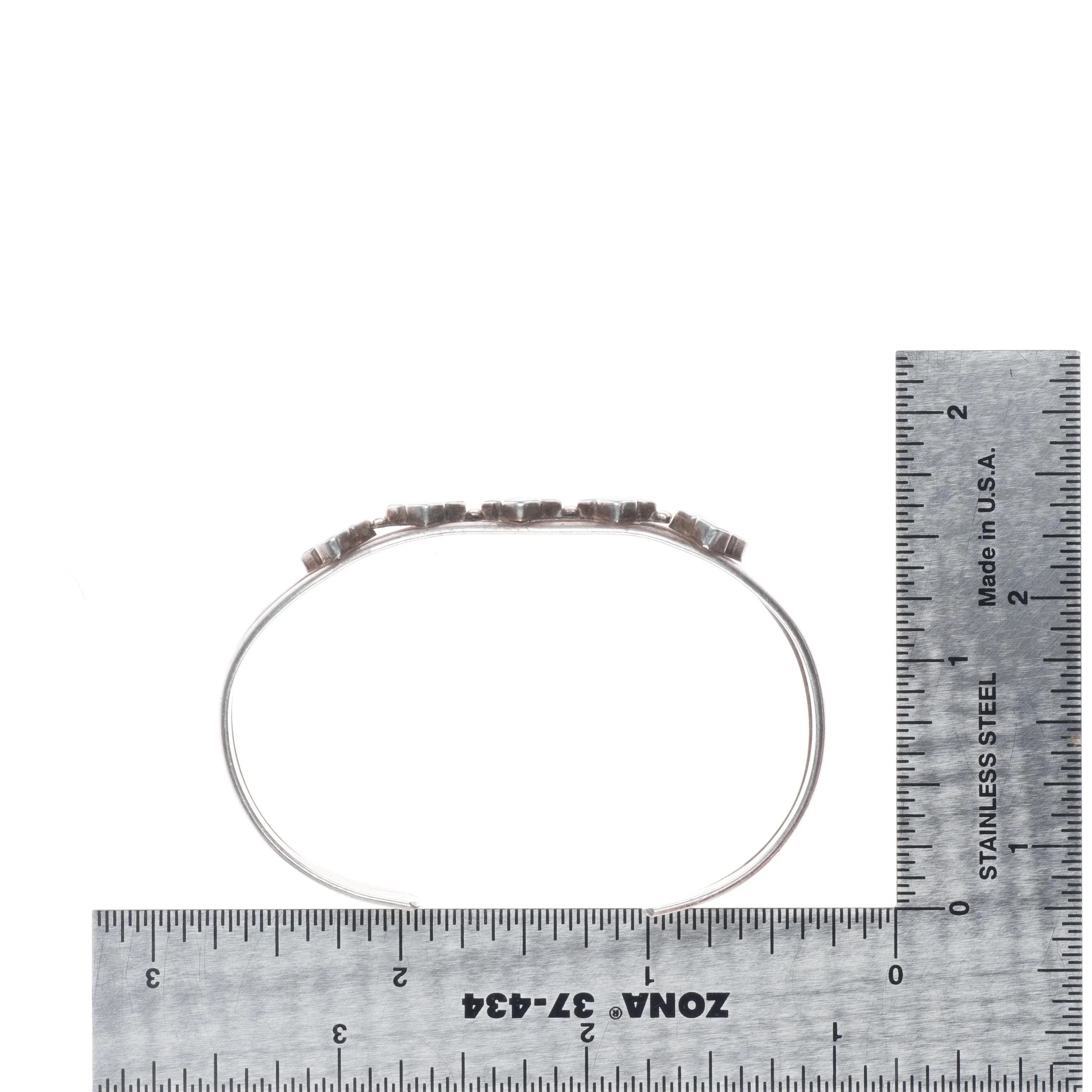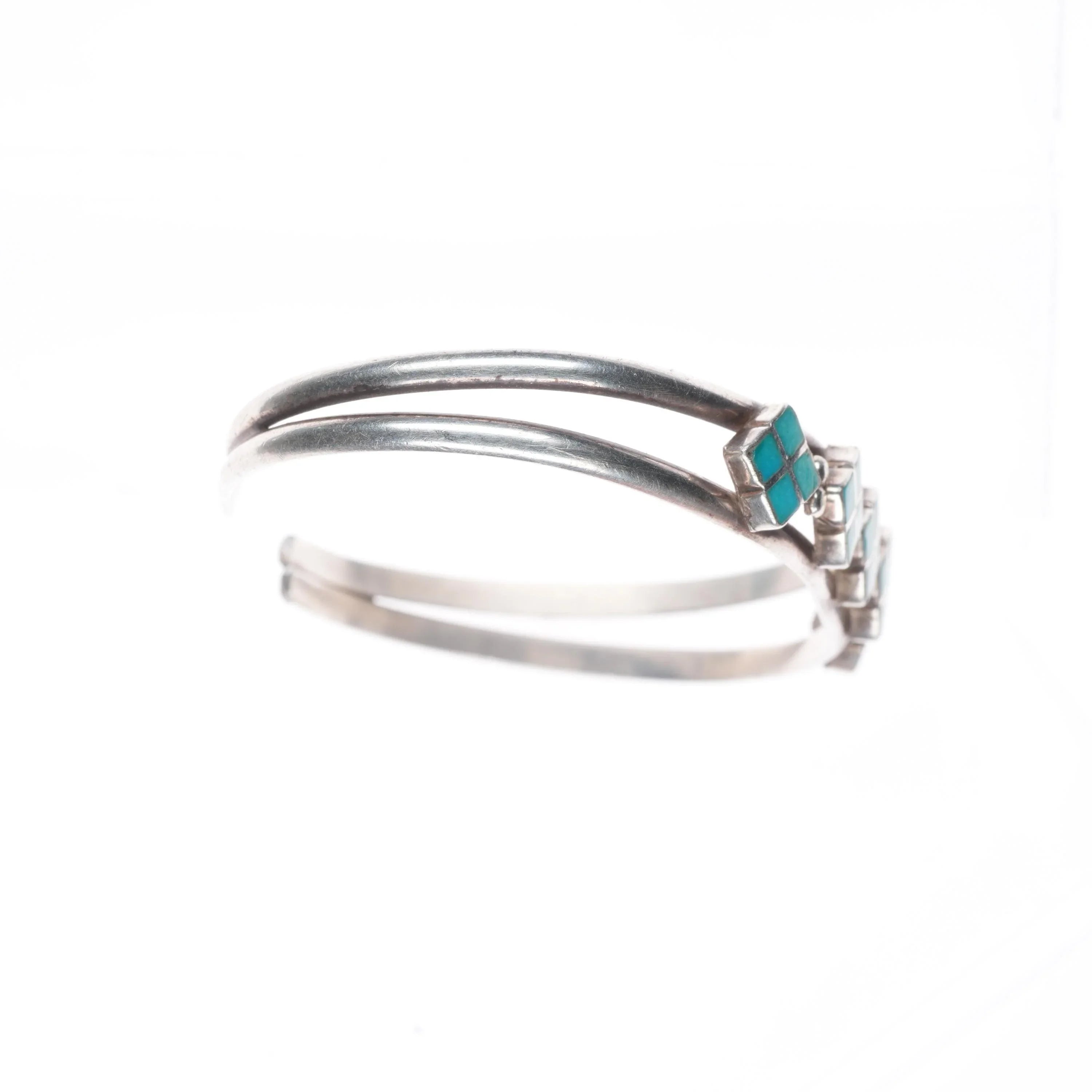 6.1" Vintage Dishta Zuni sterling silver flush inlay turquoise cuff bracelet. Tested and guaranteed solid sterling silver with weight and measurements in pictures. Good condition, circa third quarter of the 20th century with no issues. Unmarked.
