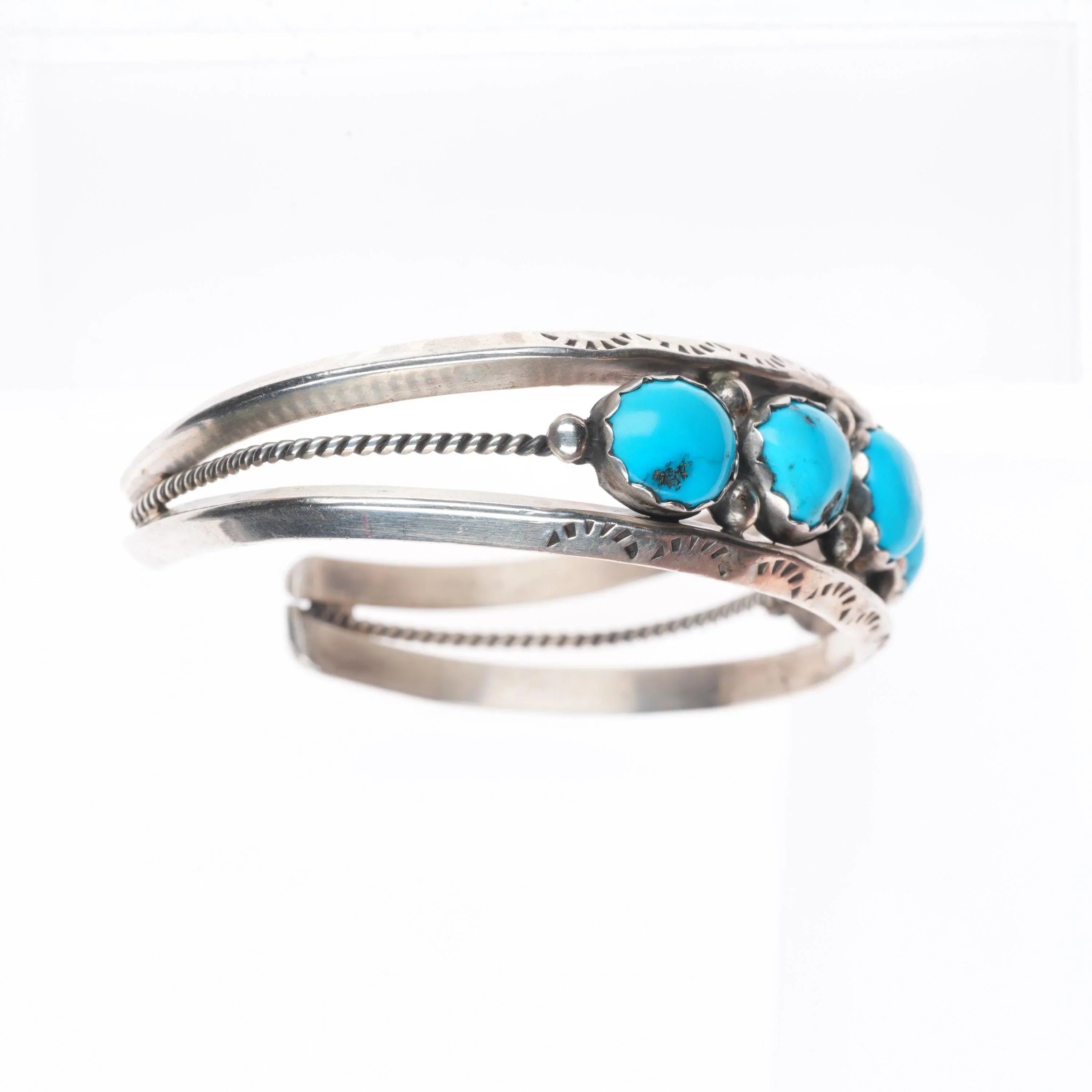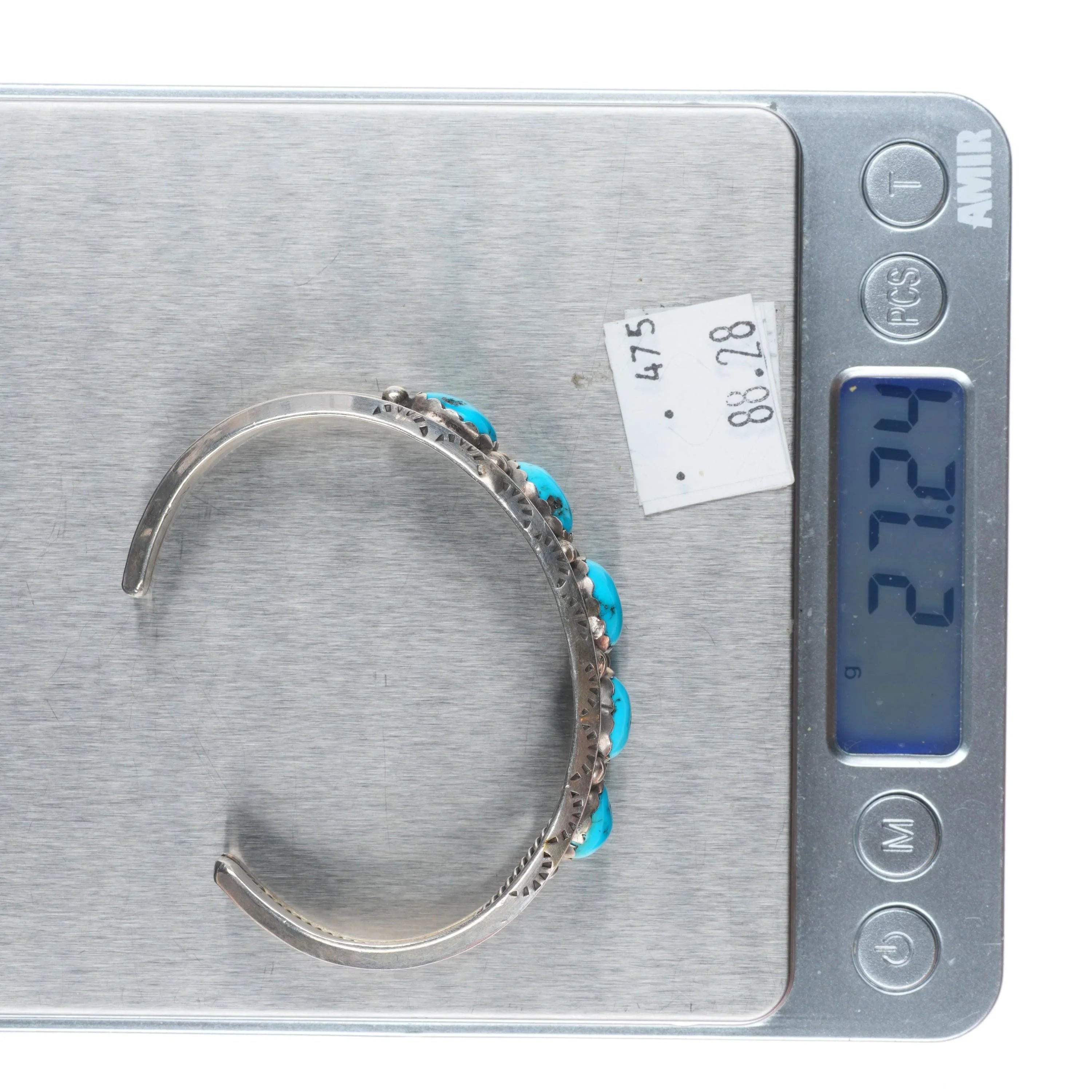 6.2" E Navajo sterling silver Kingman turquoise carinated row cuff bracelet. Tested and guaranteed solid sterling silver with weight and measurements in pictures. Circa last quarter of the 20th century with no issues.