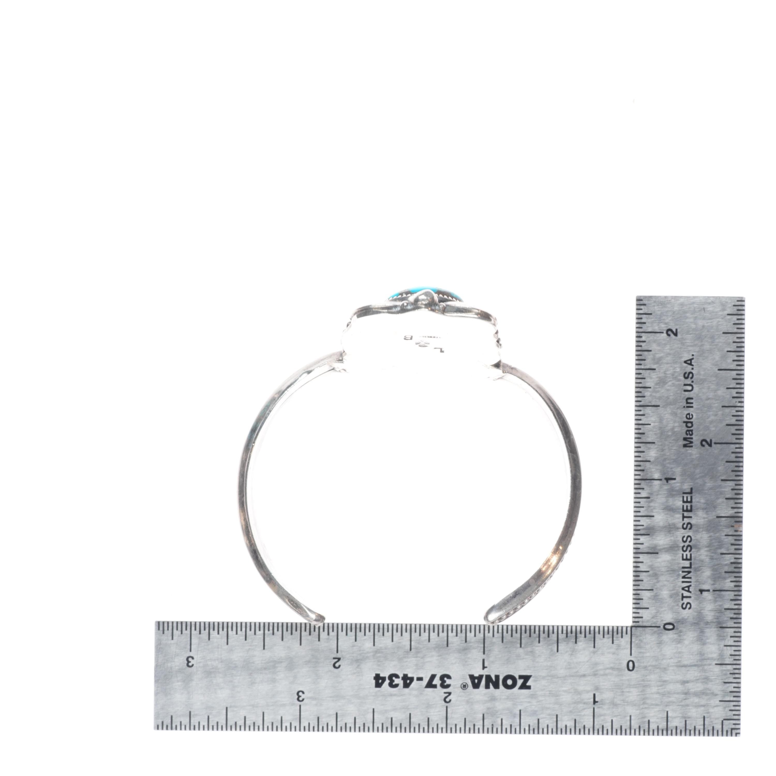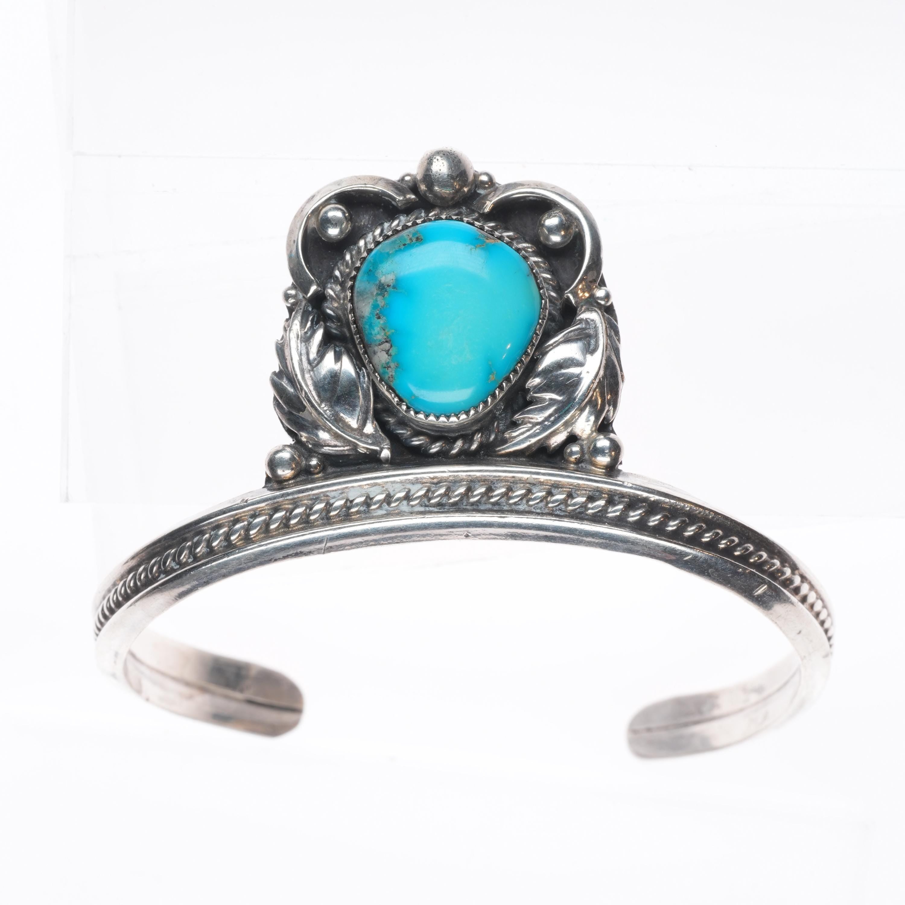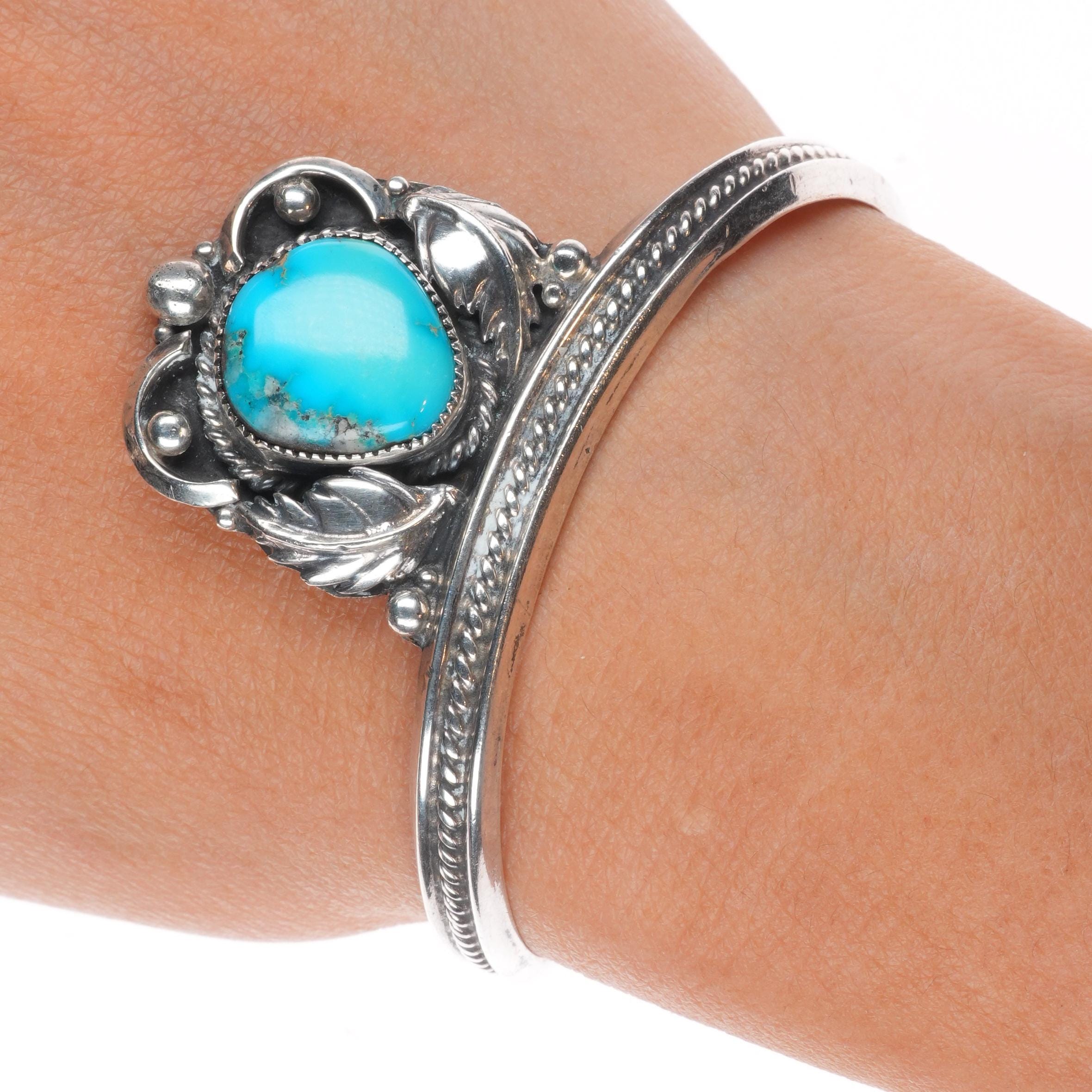 6.2" Les Baker southwestern sterling silver cuff bracelet with nice turquoise. Tested and guaranteed solid sterling silver with weight and measurements in pictures. Circa third quarter of the 20th century with age appropriate wear..