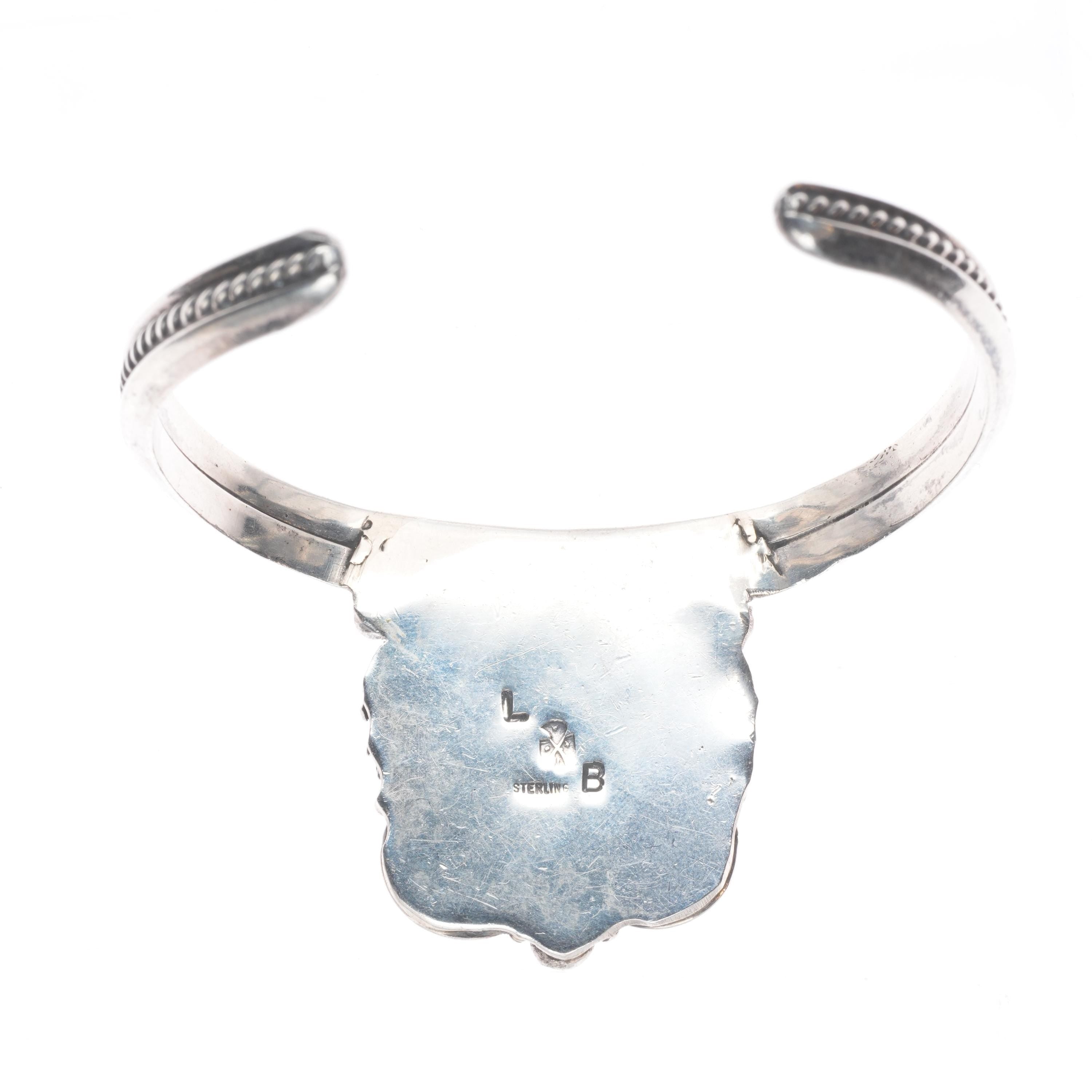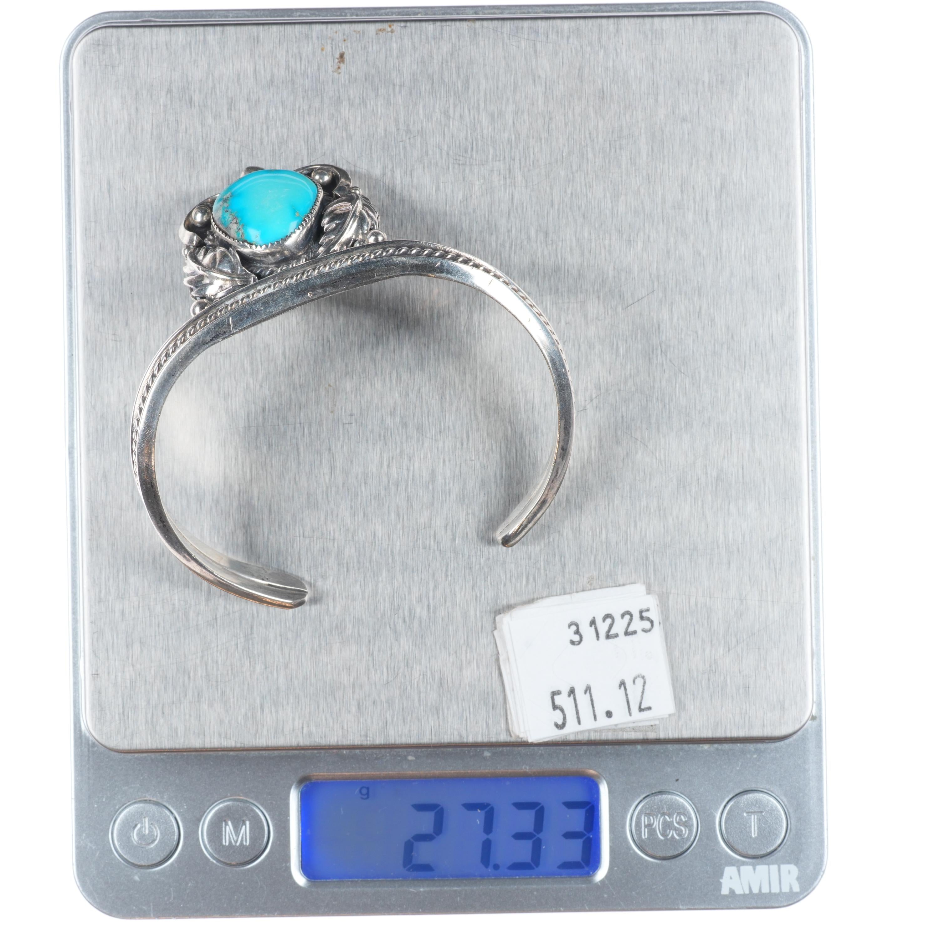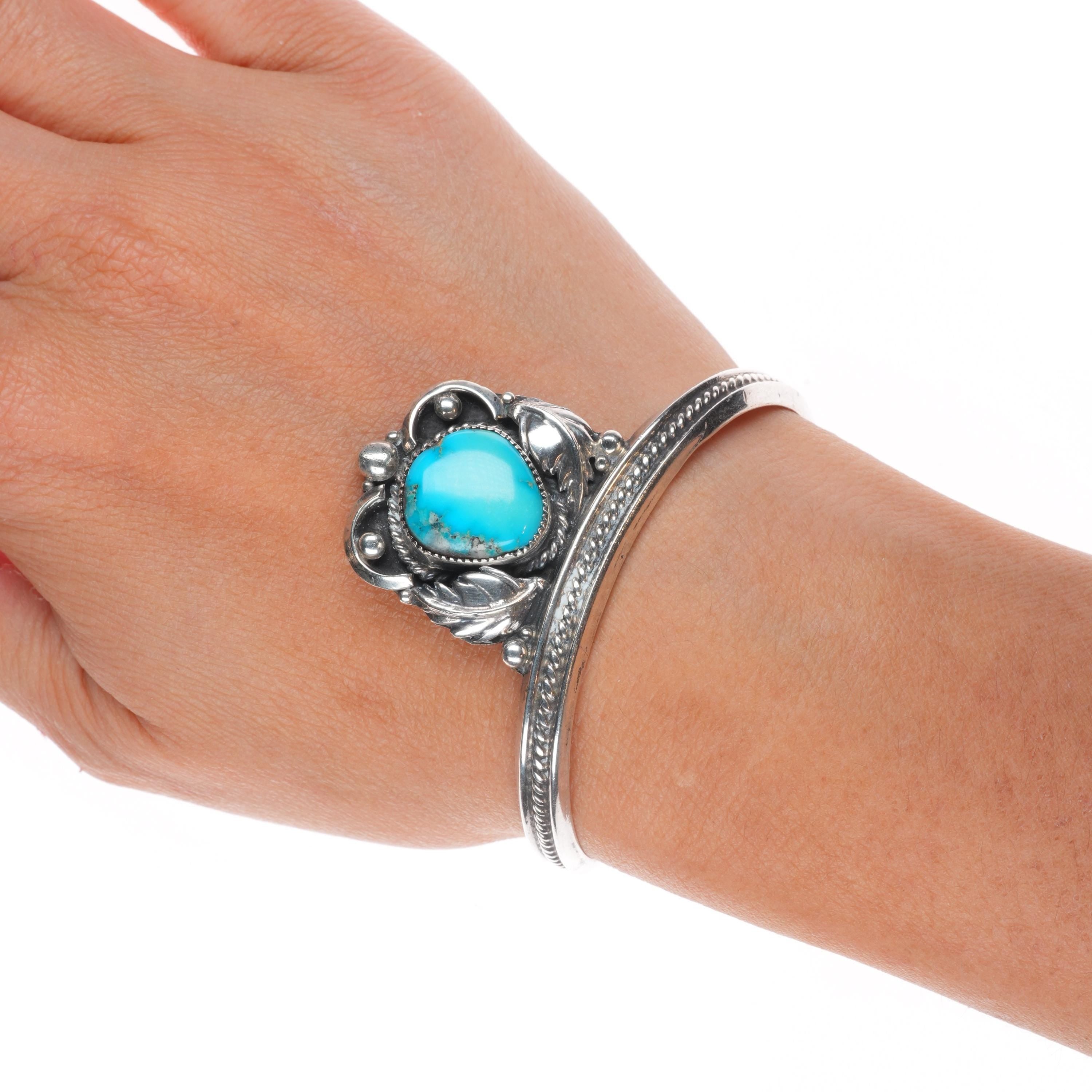 6.2" Les Baker southwestern sterling silver cuff bracelet with nice turquoise. Tested and guaranteed solid sterling silver with weight and measurements in pictures. Circa third quarter of the 20th century with age appropriate wear..