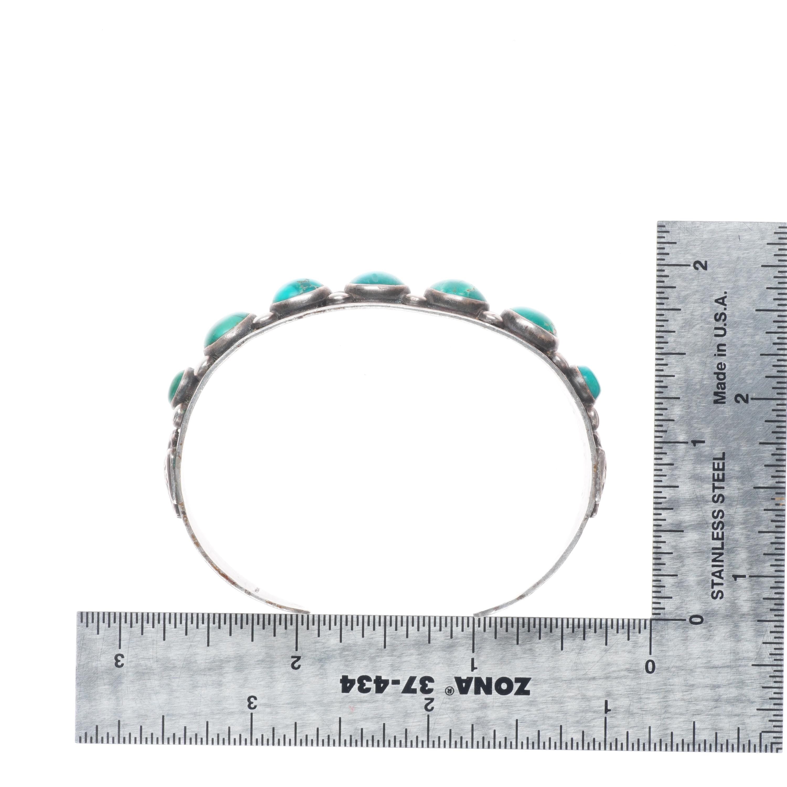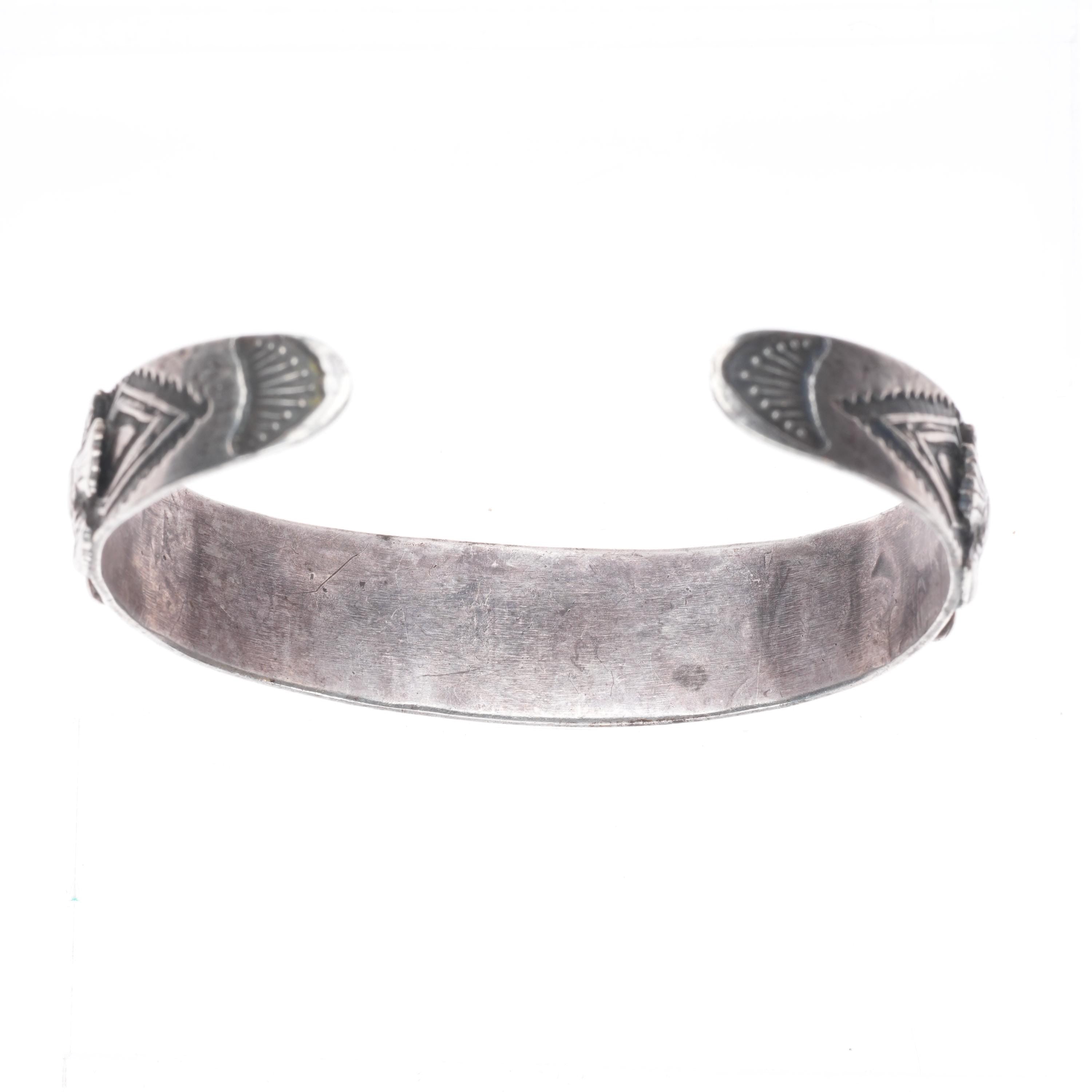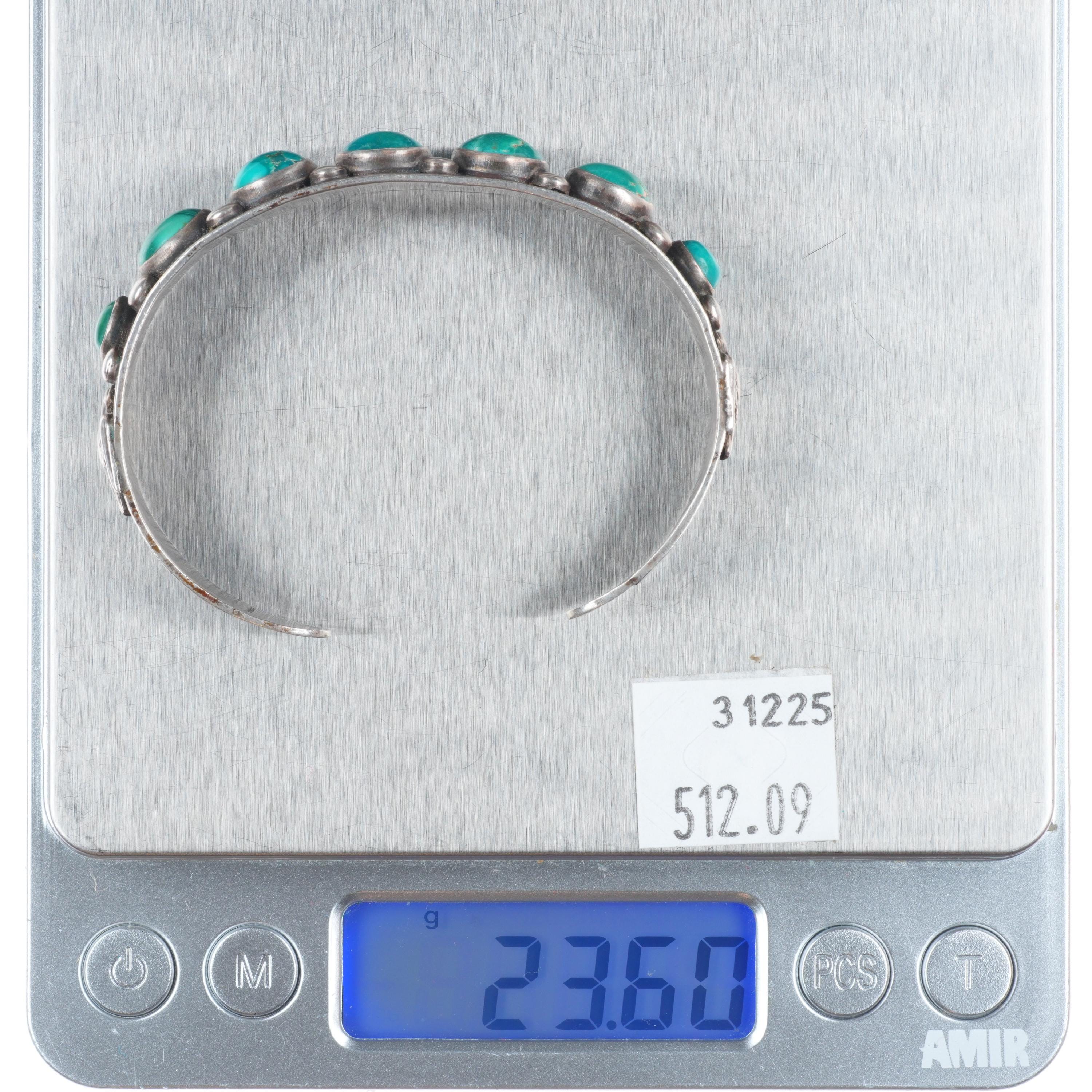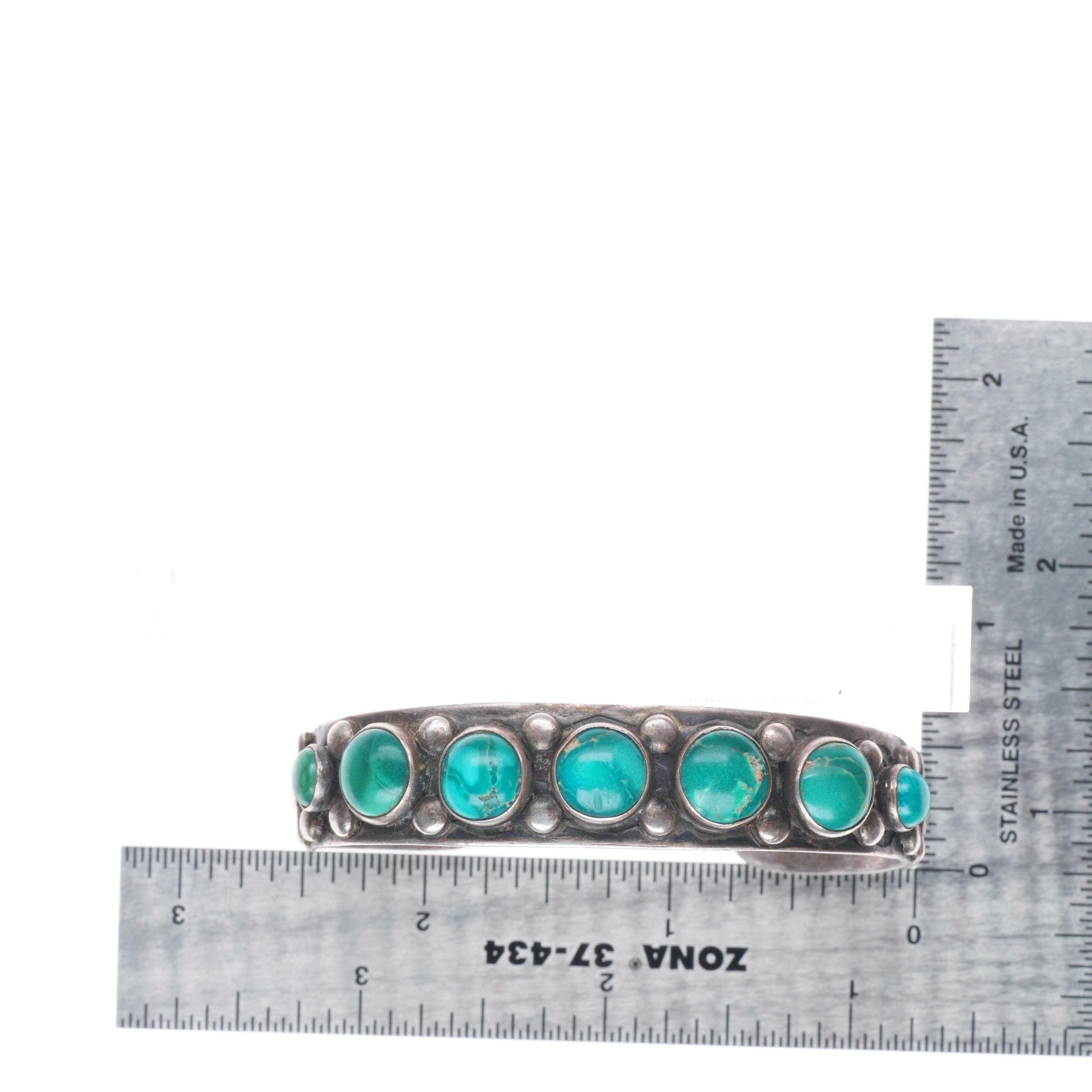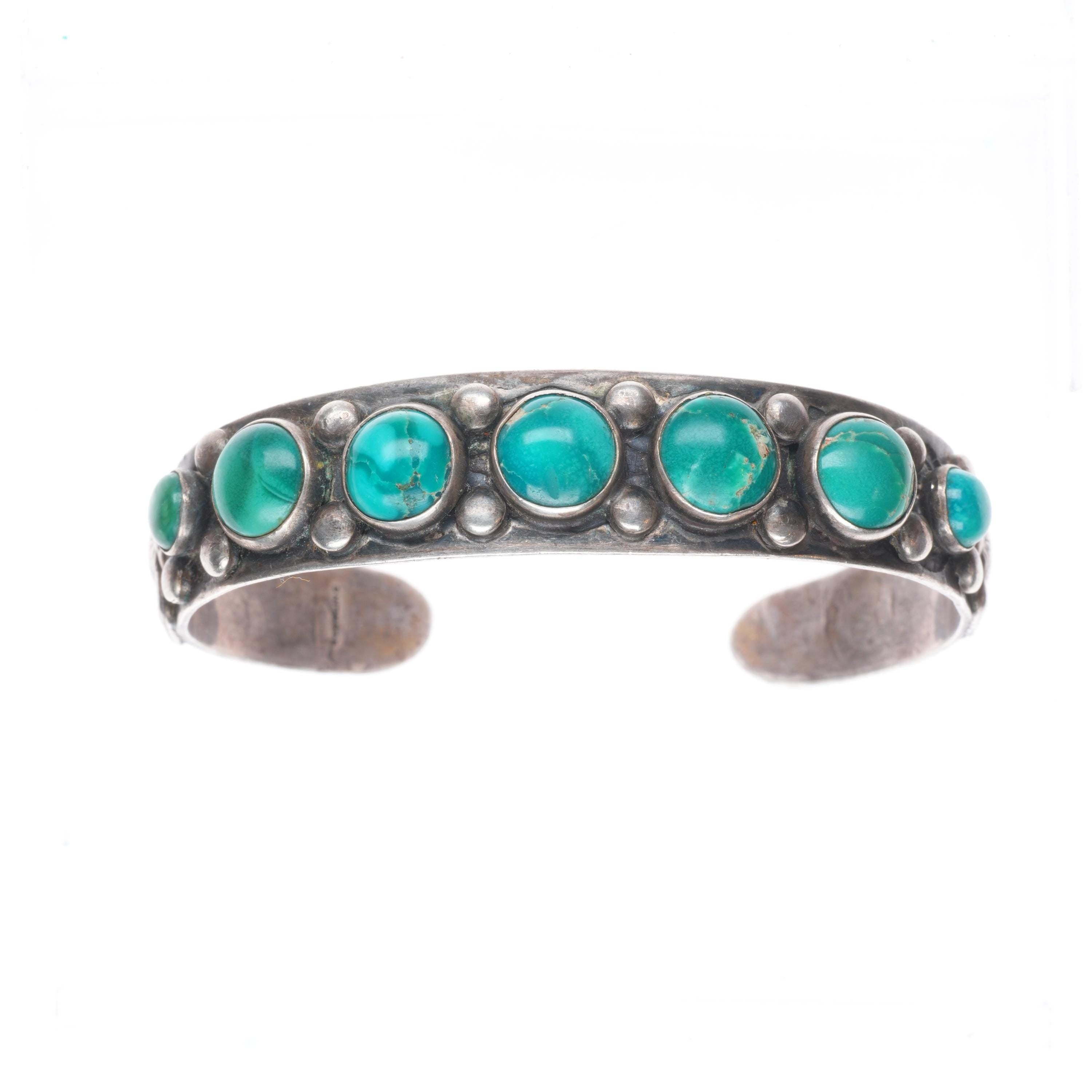 6.25" 1930's Navajo thunderbirds turquoise row cuff bracelet sterling silver. Tested and guaranteed solid sterling silver with weight and measurements in pictures. Overall expected wear with apparent circa second quarter of the 20th century with some expected overall wear but no damage..