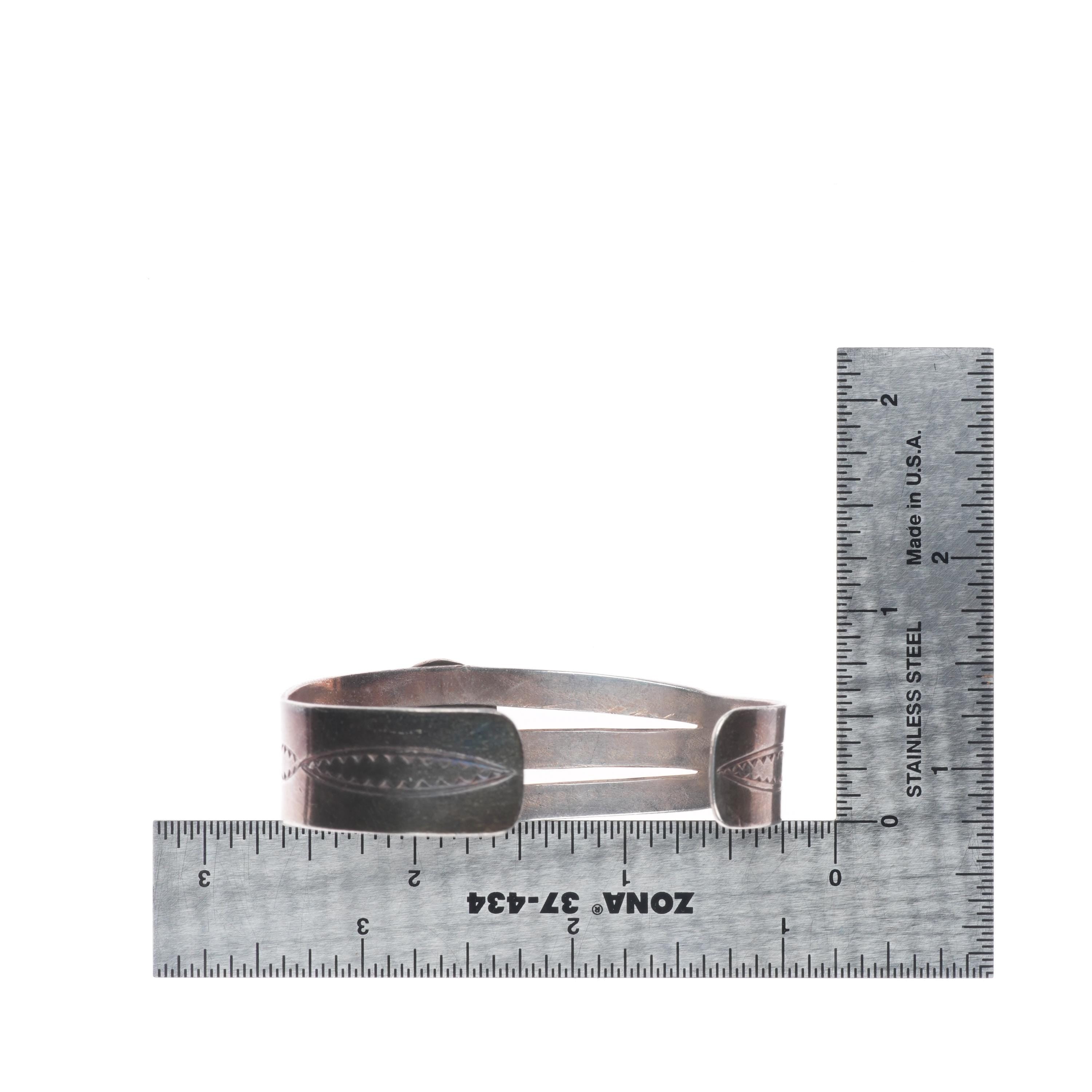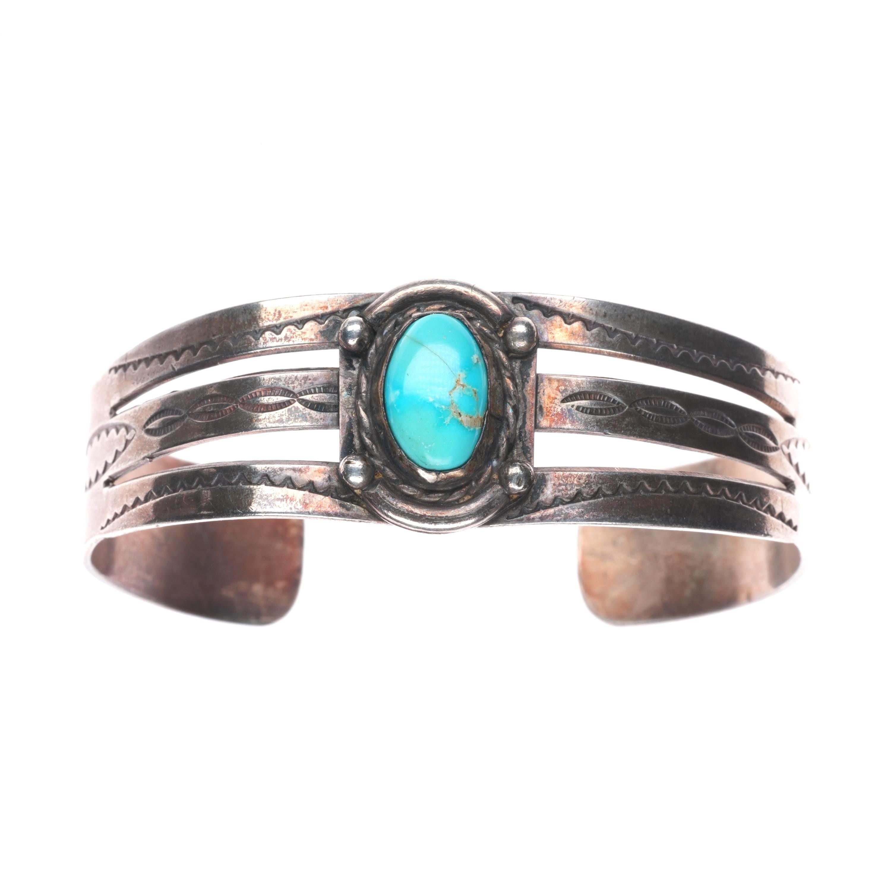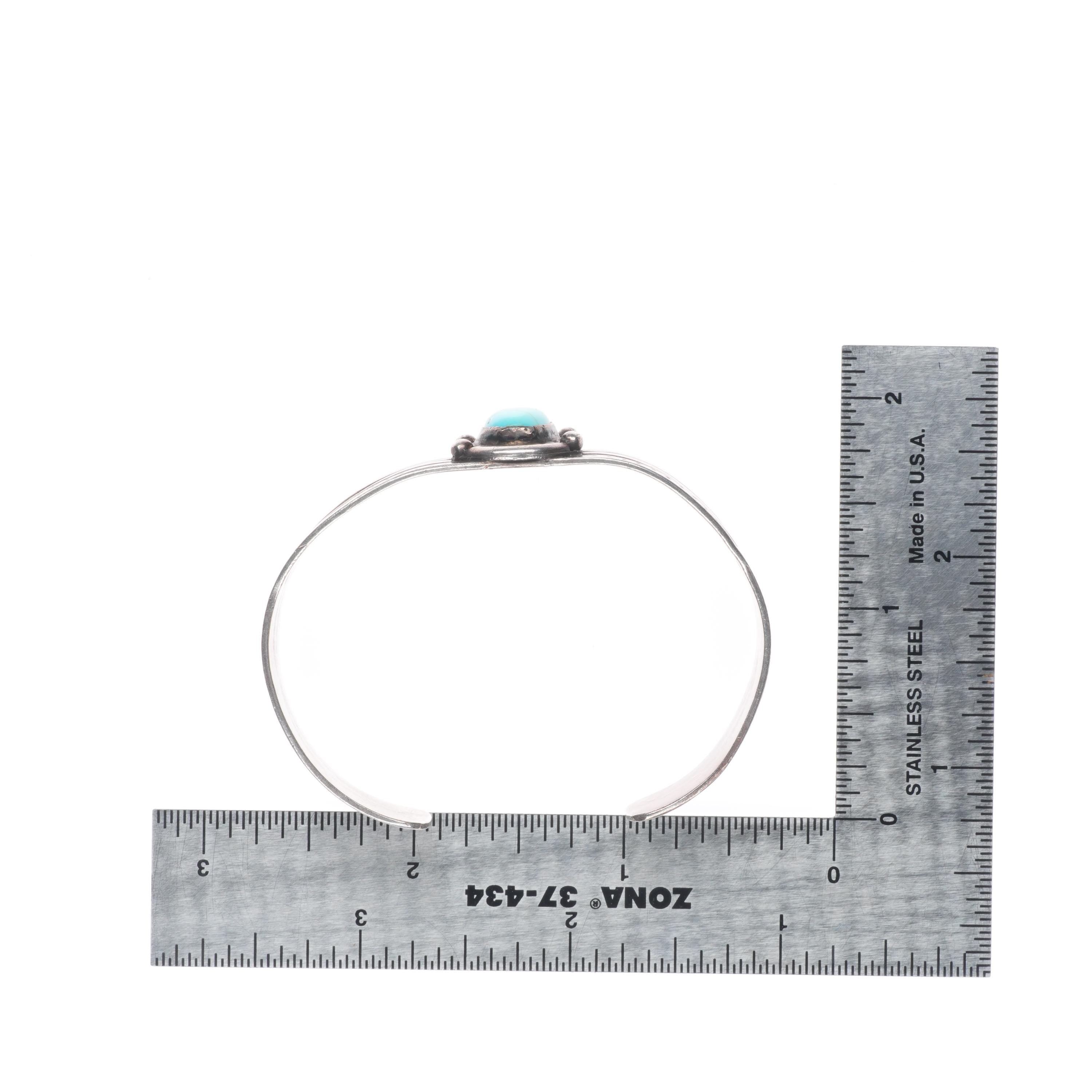 6.25" 1940‘s vintage Navajo sterling silver cuff bracelet with turquoise. Tested and guaranteed solid ingot/sterling silver with weight and measurements in pictures. Circa second quarter of the 20th century with age appropriate wear..