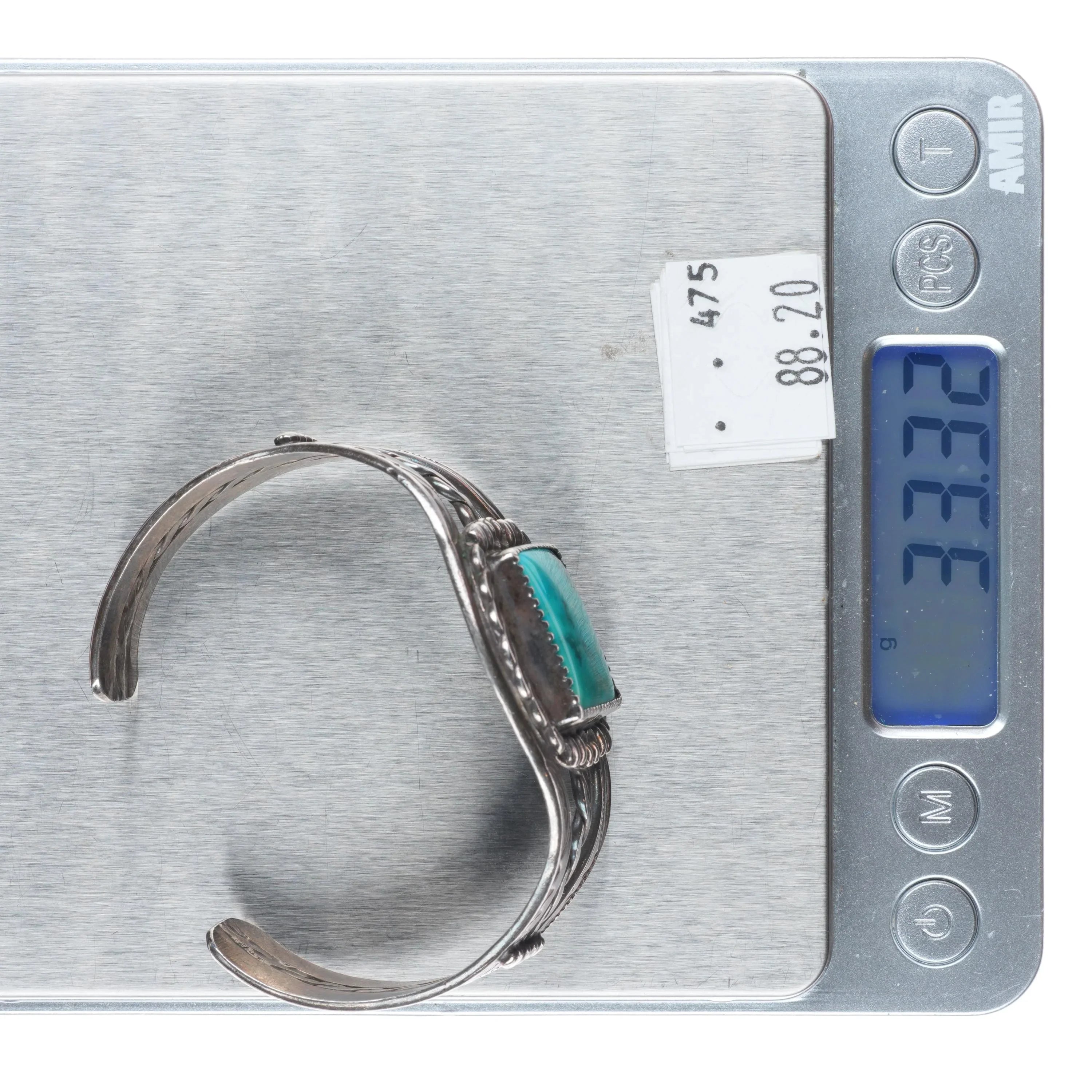 6.25" 40‘s-50‘s Navajo sterling silver stamped cuff bracelet with nice turquoise . Tested and guaranteed solid sterling silver with weight and measurements in pictures. No damage or significant wear, circa mid 20th century.