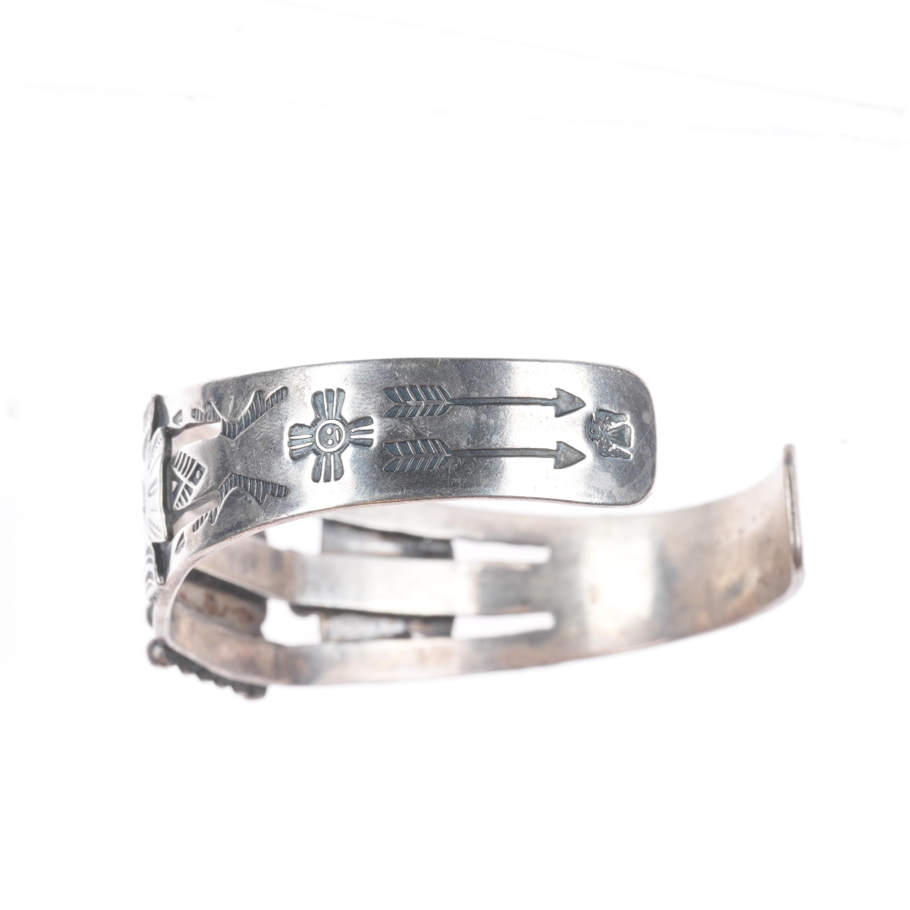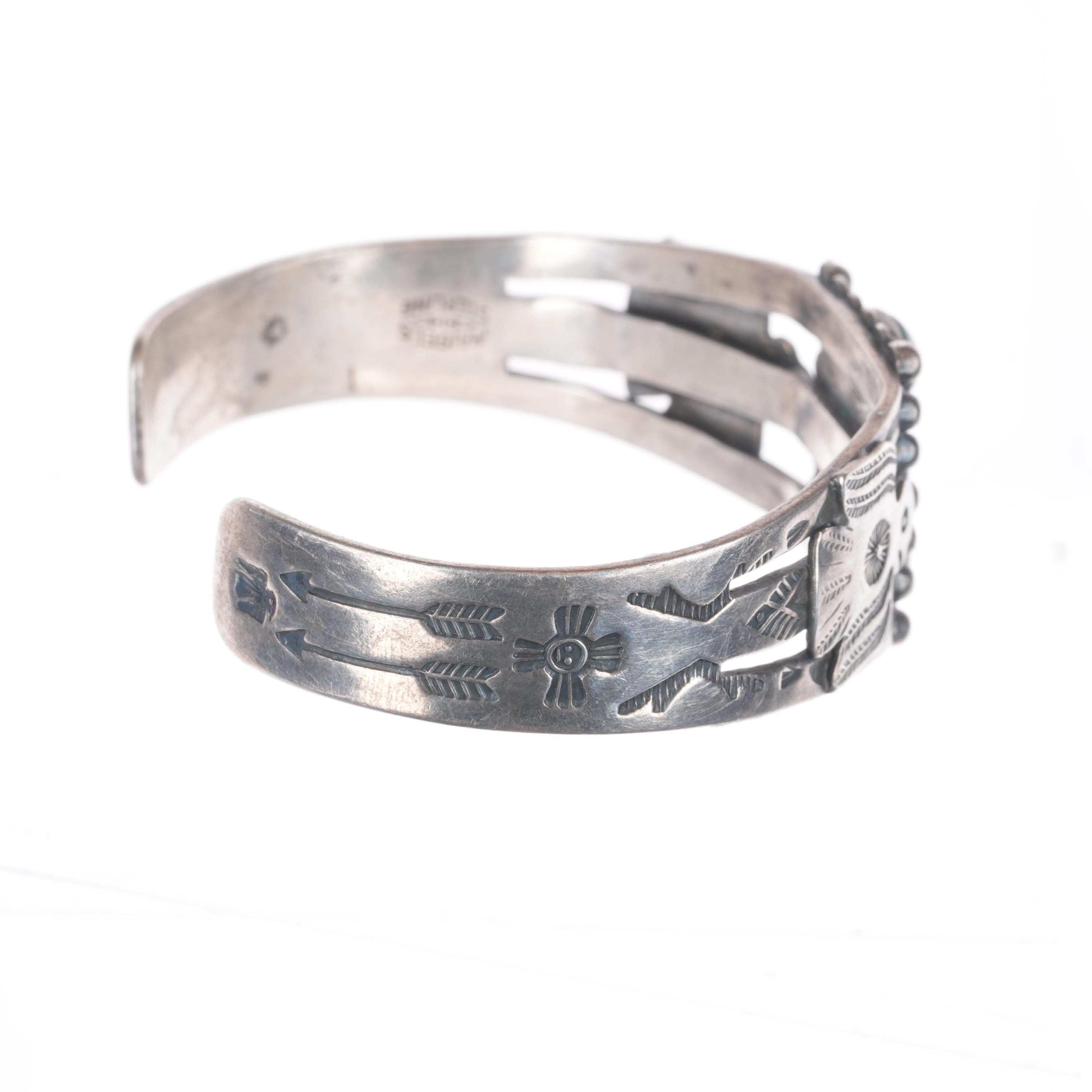 6.25" c1940 Maisels/Fred Harvey Thunderbirds Cerrillos turquoise cuff bracelet. Tested and guaranteed solid sterling silver with weight and measurements in pictures. Fits up to a 6.25" wrist. Circa second quarter of the 20th century.