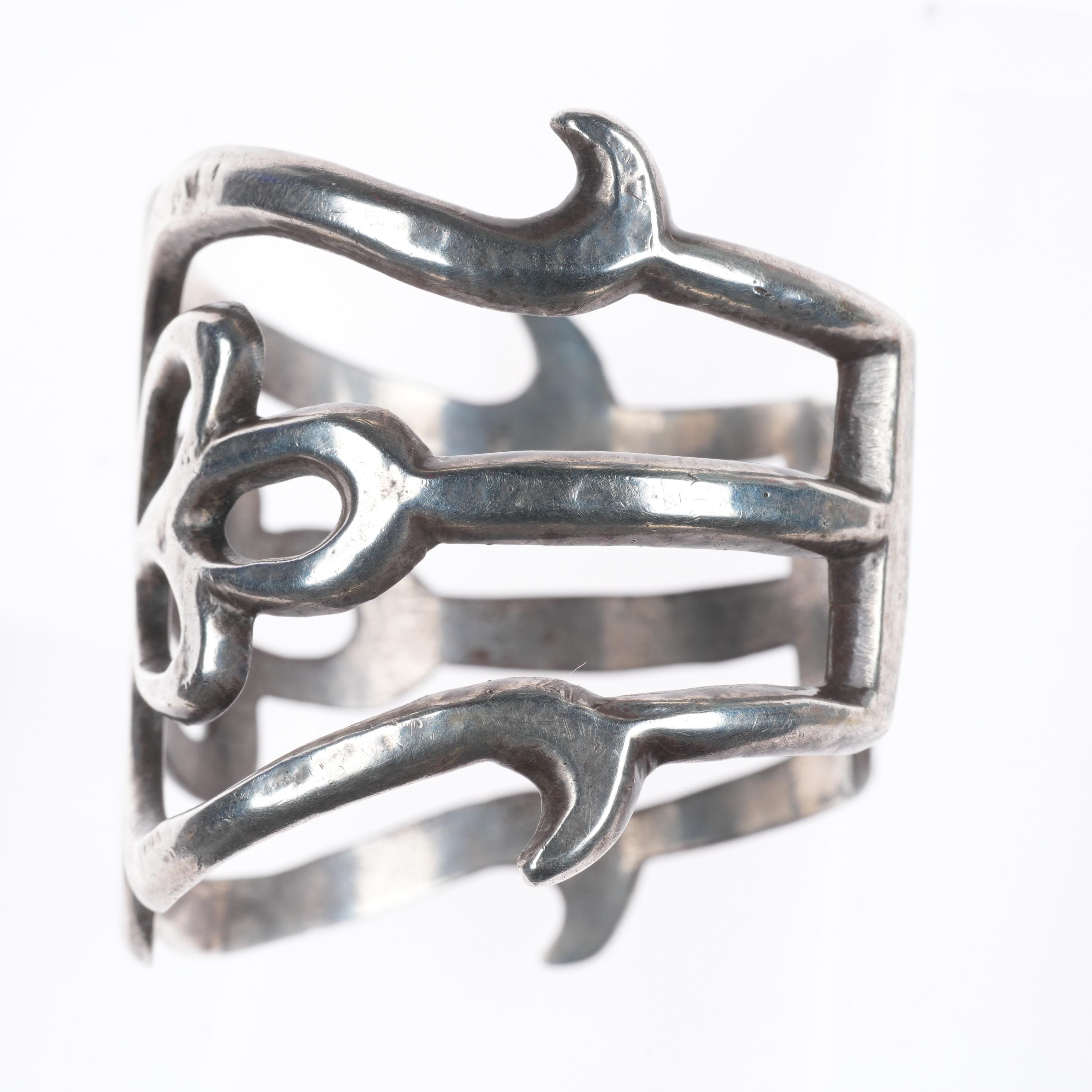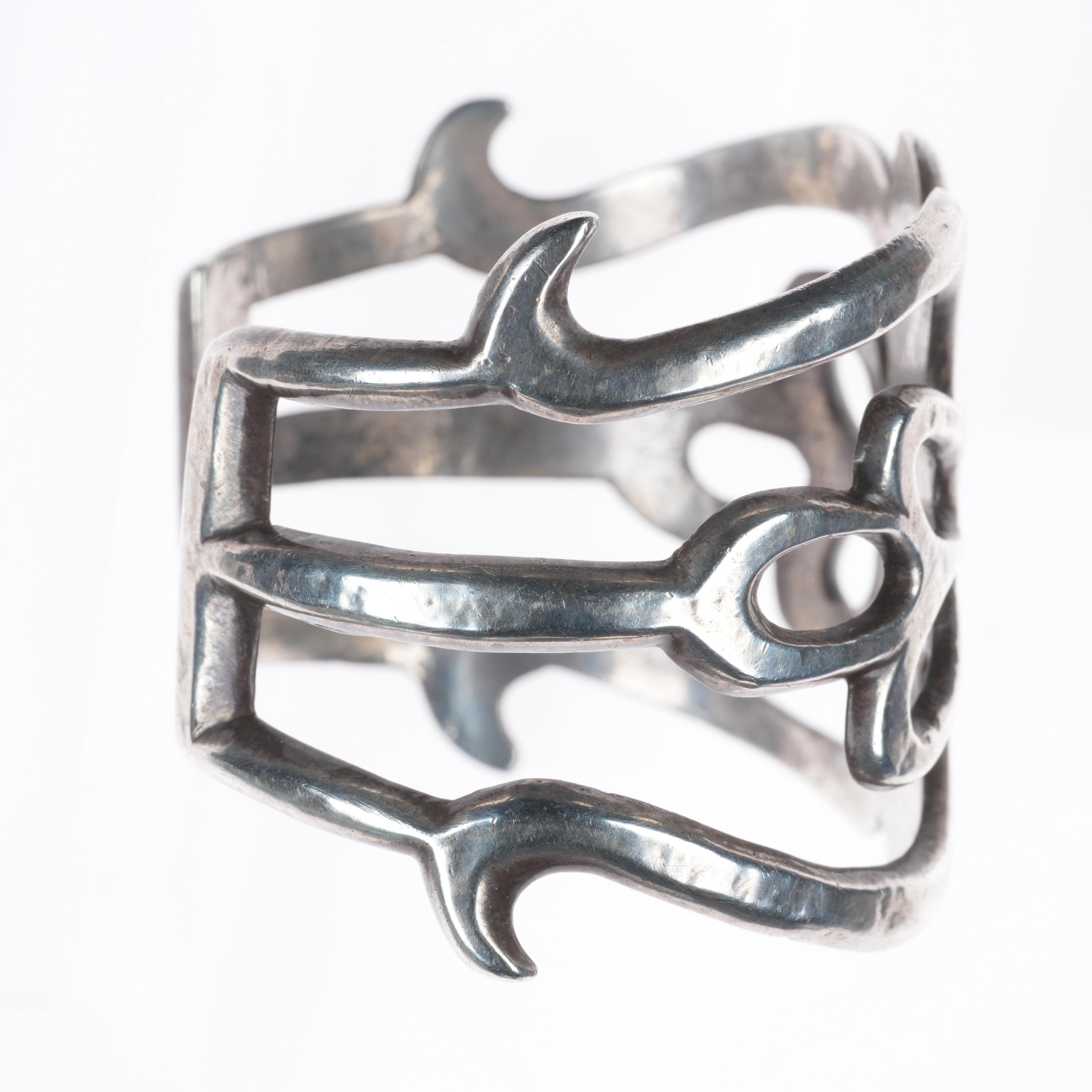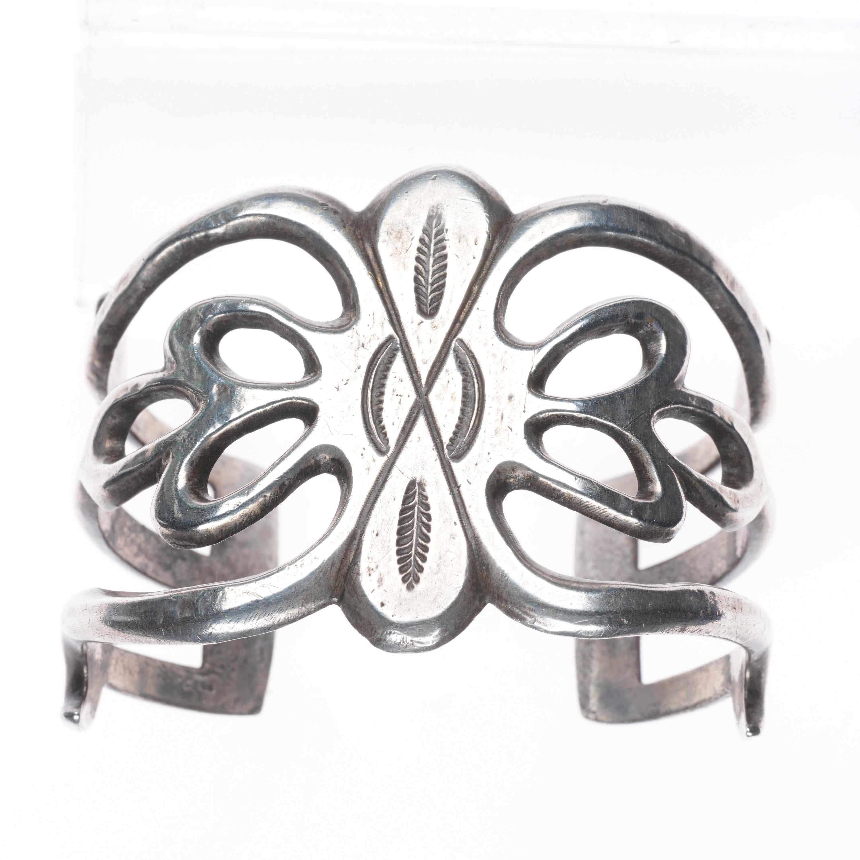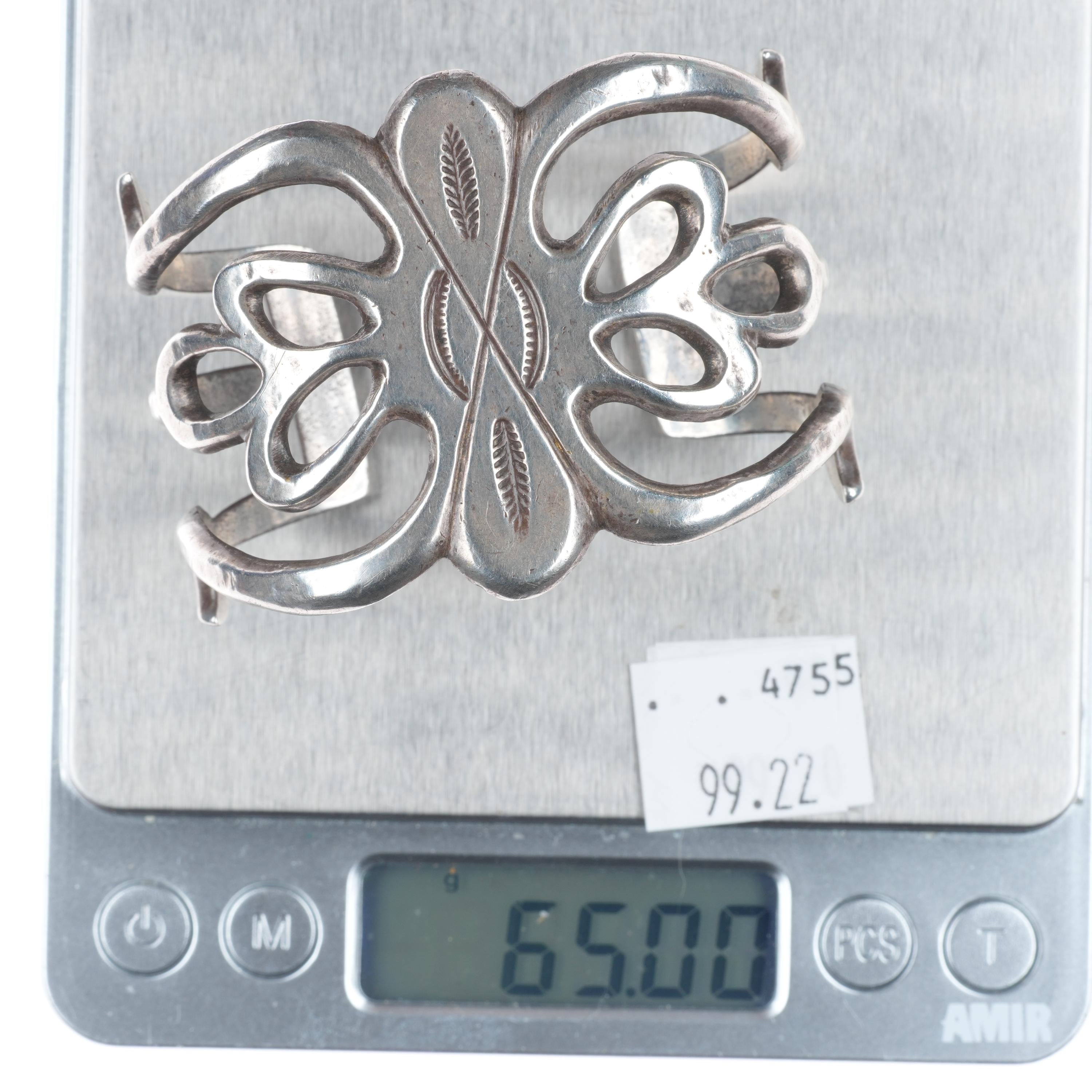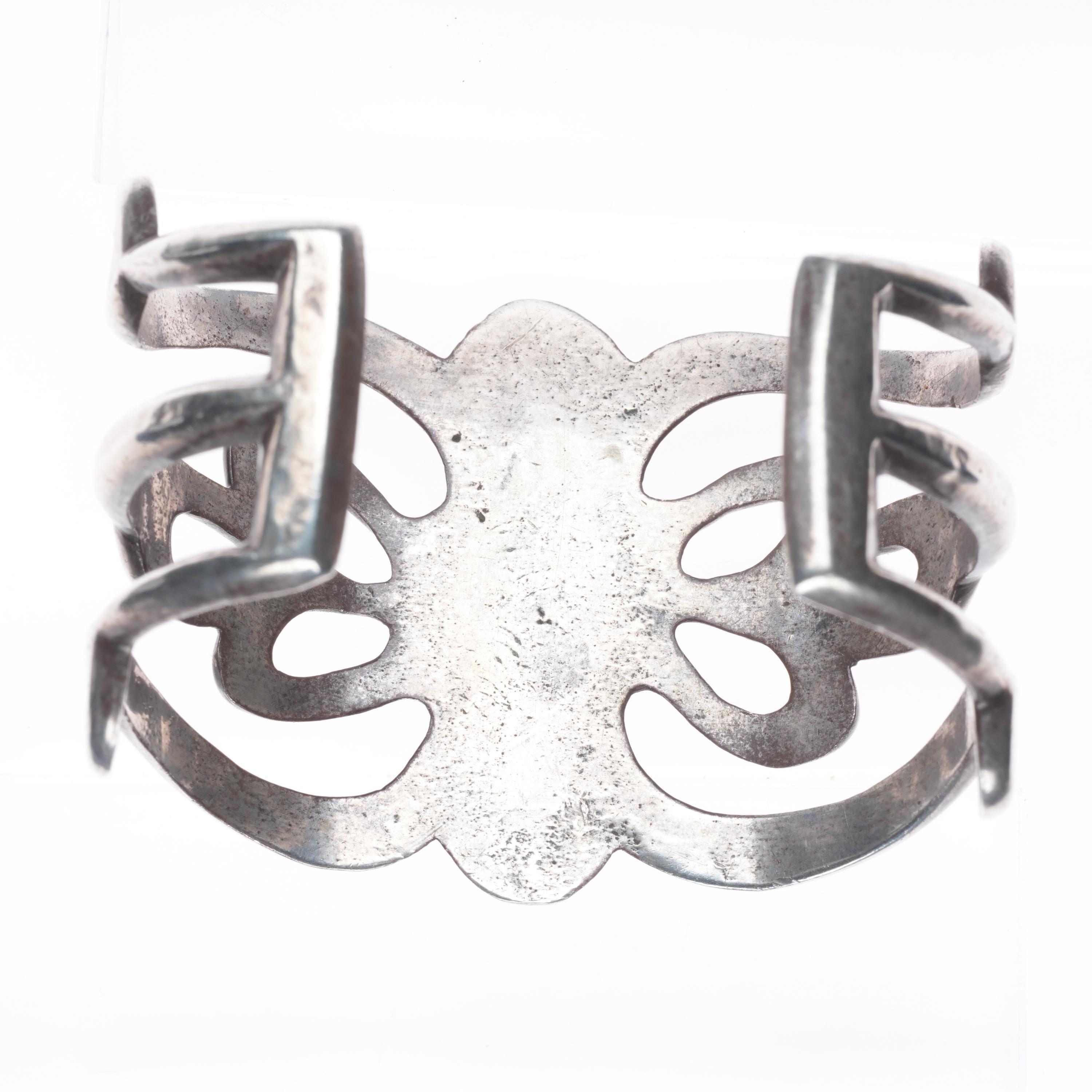 6.3" 30‘s-40‘s Navajo tufa cast sterling silver wide band cuff bracelet. Tested and guaranteed solid sterling silver with weight and measurements in pictures. Circa second quarter of the 20th century. Fits up to a 6.3" wrist.