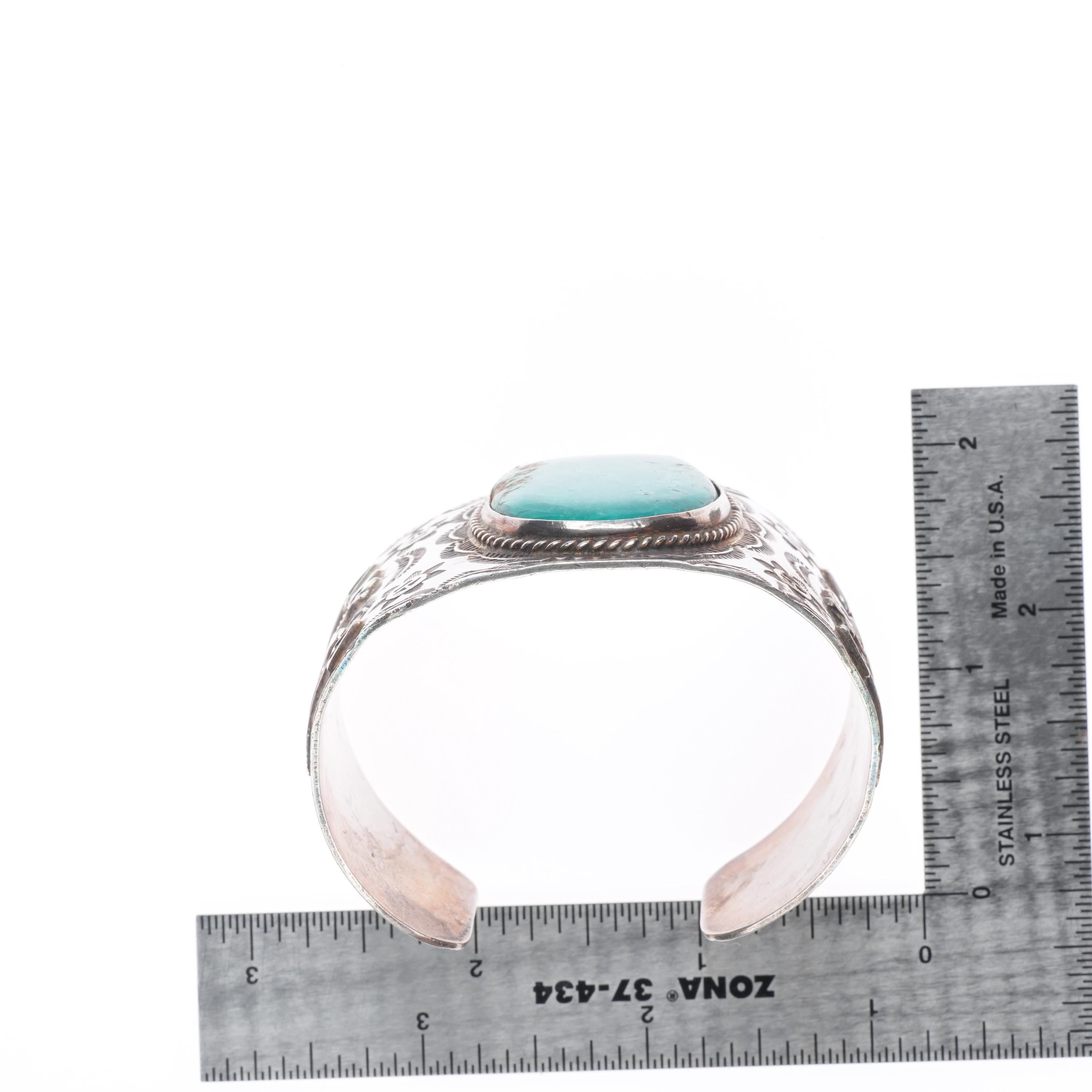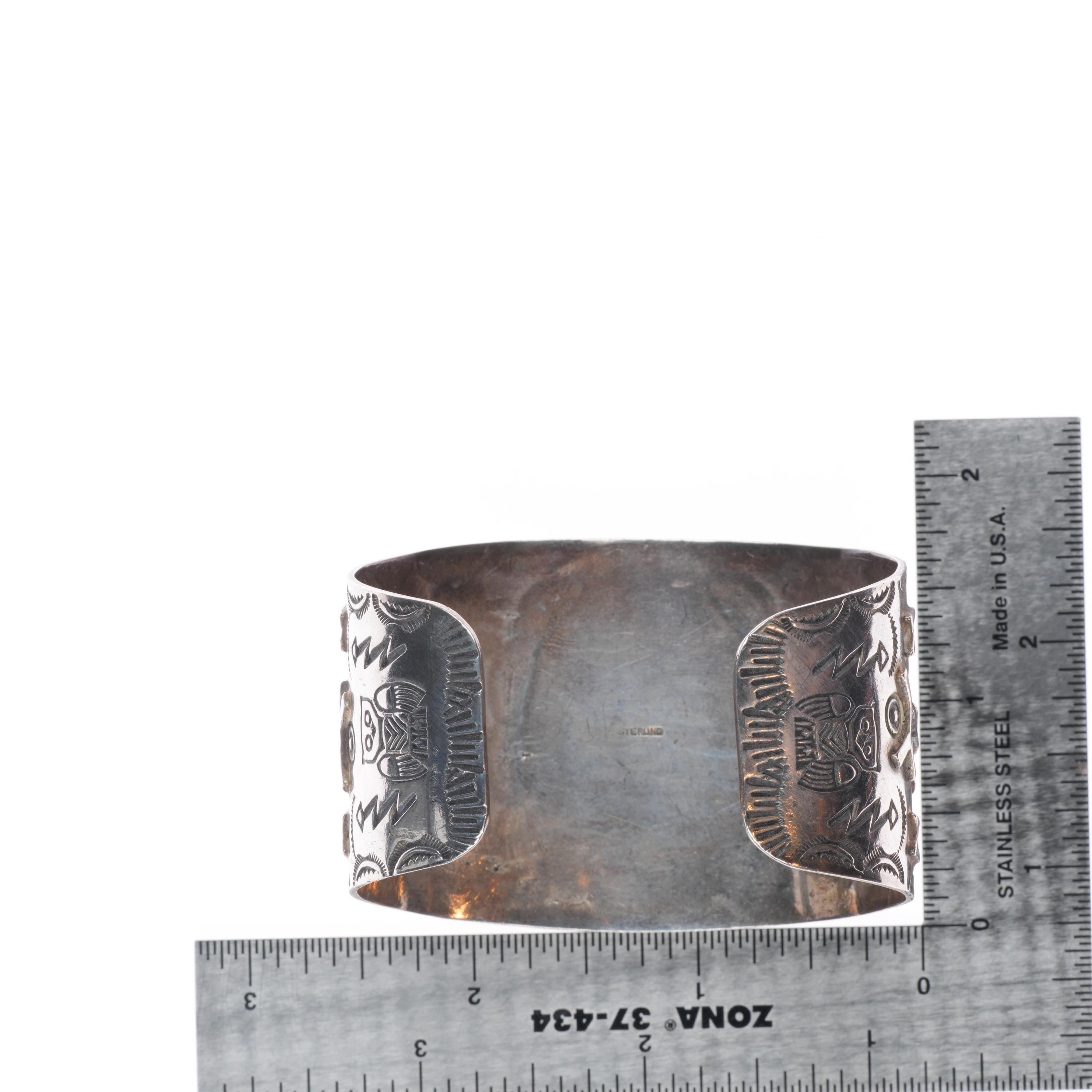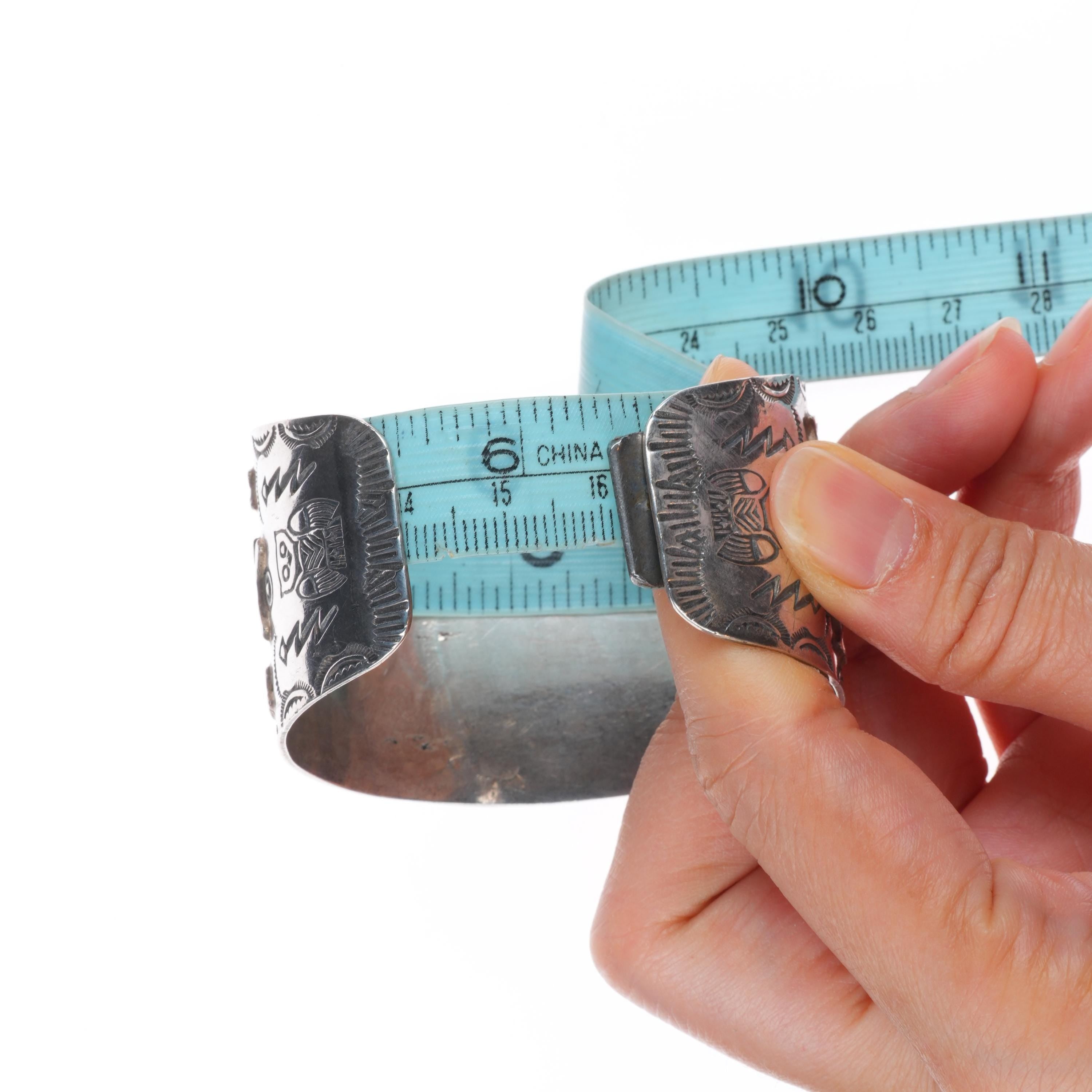 6.35" Vintage Navajo c1940‘s Fred Harvey sterling silver turquoise cuff bracelet. Tested and guaranteed solid sterling silver with weight and measurements in pictures. Circa second quarter of the 20th century. Fits up to a 6.35" wrist.