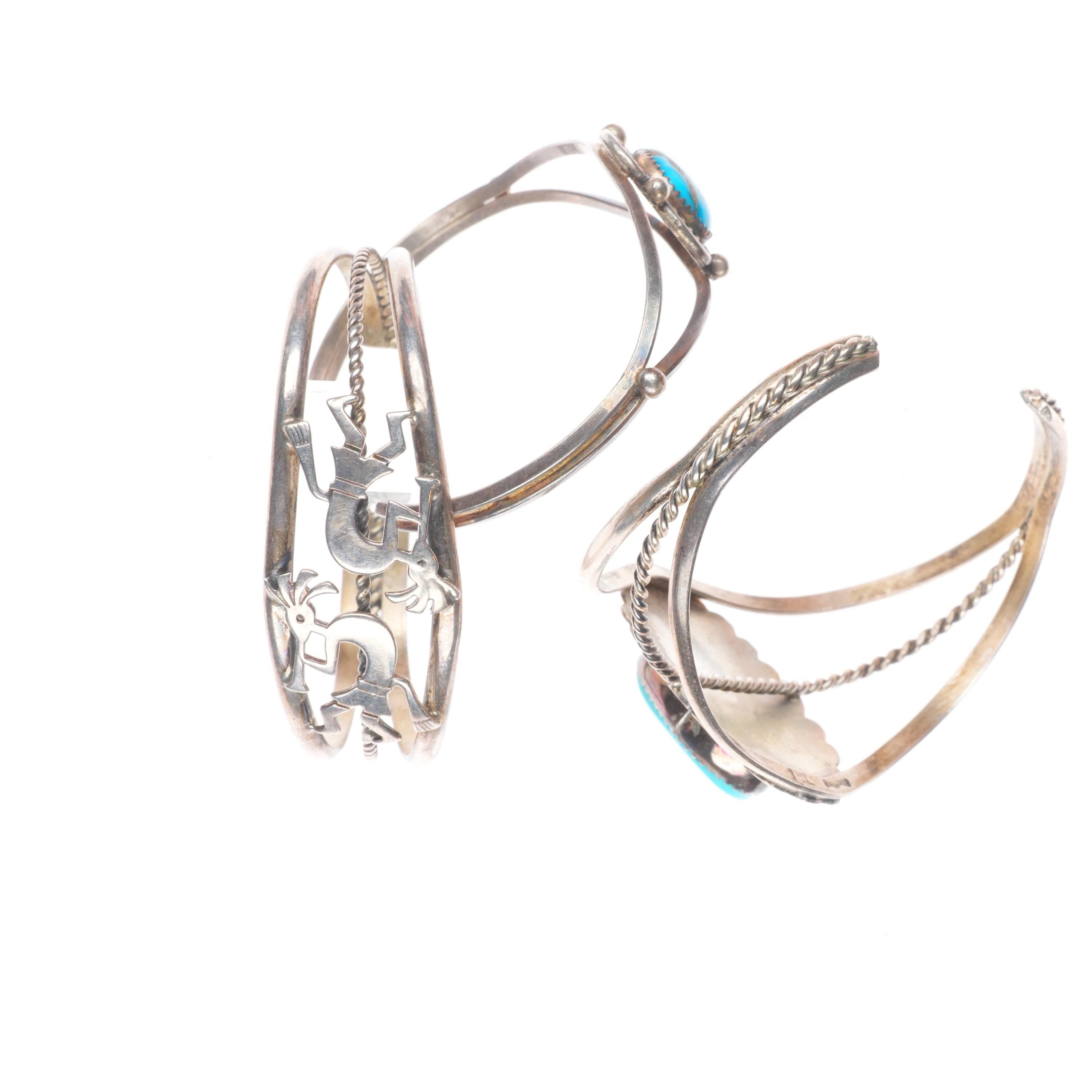 6.4"-6.7" Vintage Navajo sterling silver/turquoise/kokopelli cuff bracelet lot. Tested and guaranteed solid sterling silver with weight and measurements in pictures. Overall expected wear circa last half of the 20th century.