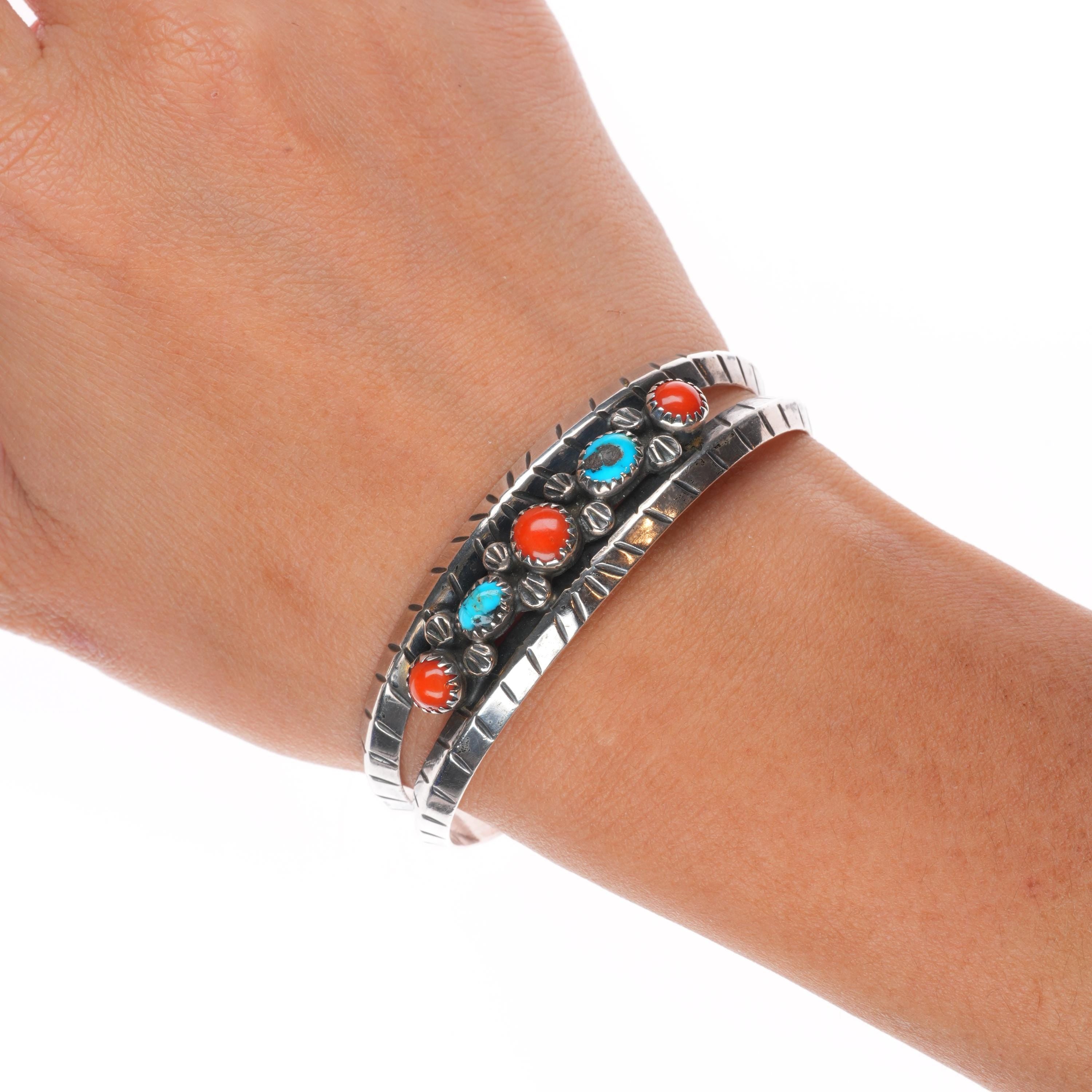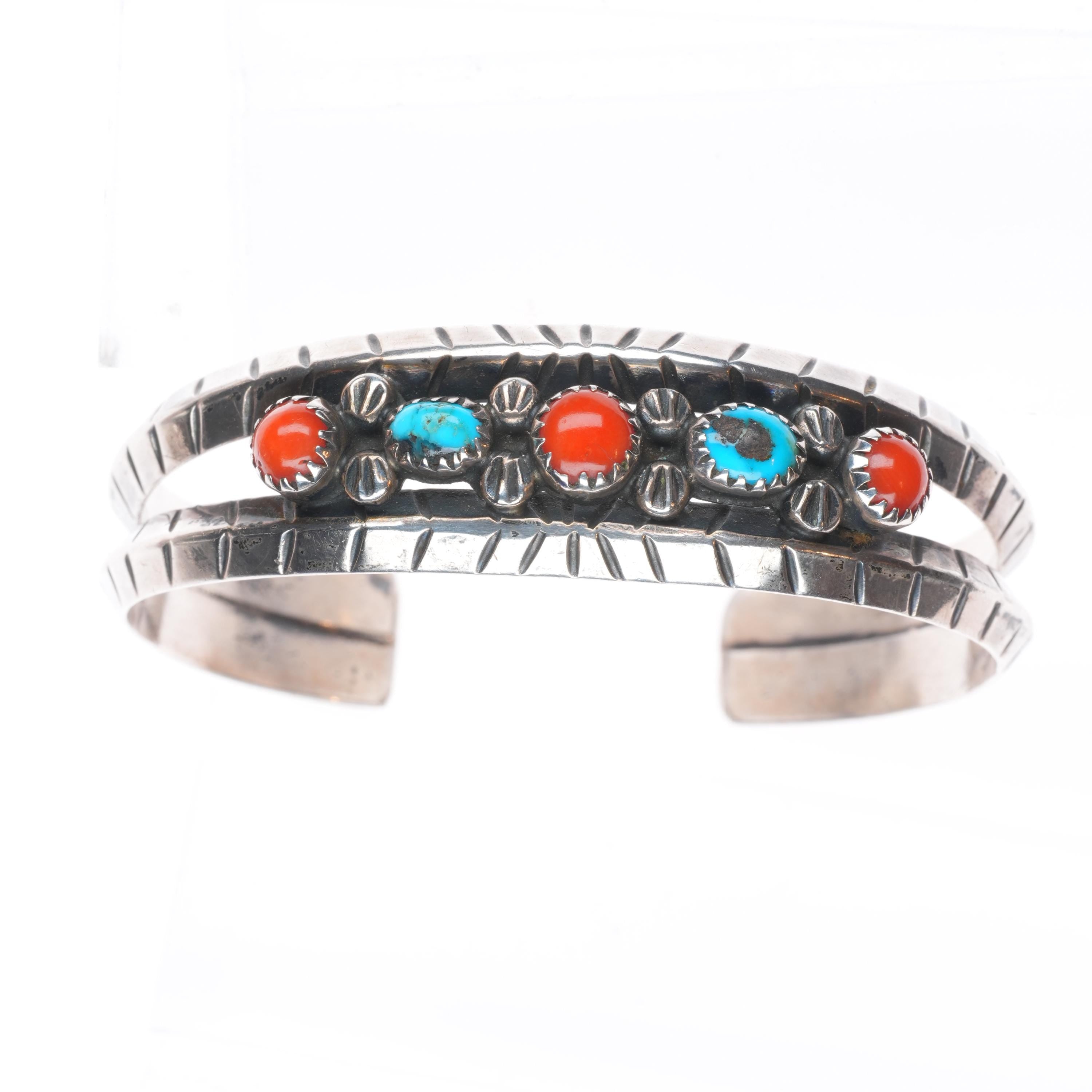 6.4" Eunice Claw Navajo for Atkinson trading post sterling silver, turquoise, coral cuff bracelet. Tested and guaranteed solid sterling silver with weight and measurements in pictures. Circa third quarter of the 20th century. Fits up to a 6.4" wrist.