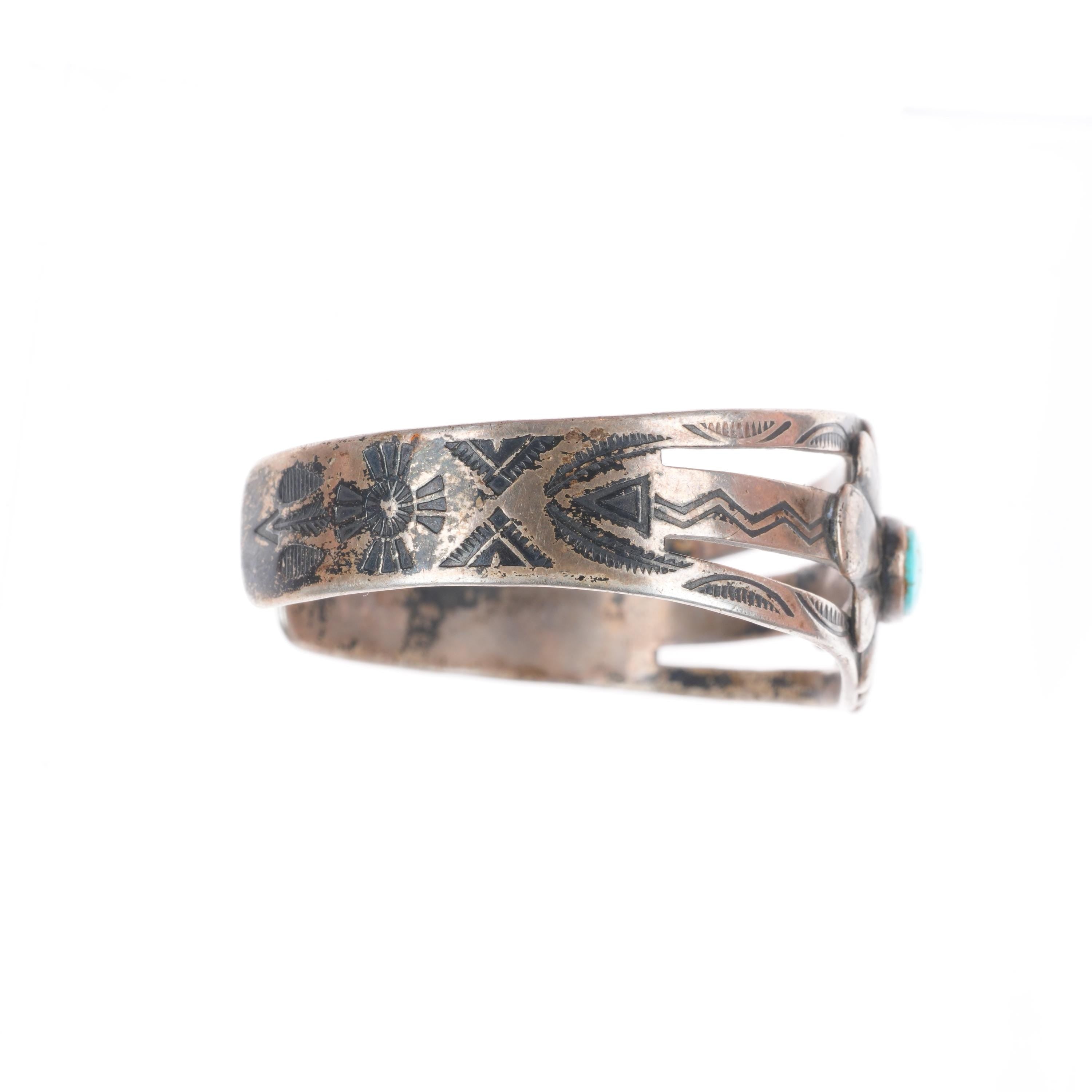 6.4" Fred Harvey #8 turquoise sterling silver rayed bezel cuff bracelet. Tested and guaranteed solid sterling silver with weight and measurements in pictures. Natural high grade #8 turquoise, circa second quarter of the 20th century. Center band with fracture/break, still wearable.
