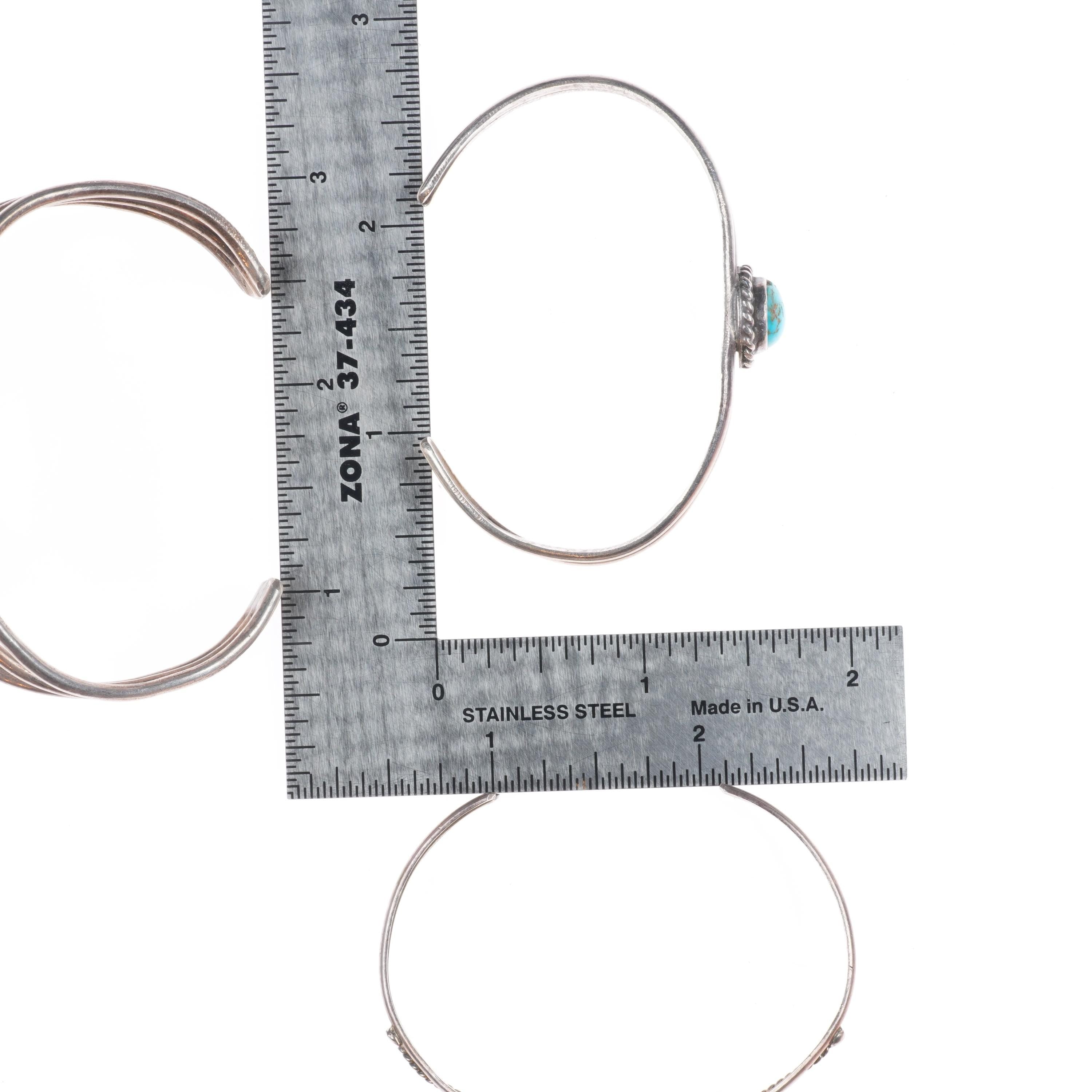 6.4" Jefferson James/other Navajo sterling silver turquoise cuff bracelet lot. Tested and guaranteed solid sterling silver with weight and measurements in pictures. All right around 6.25"-6.5" and can be slightly adjusted. All circa last half of the 20th century, selling all three.