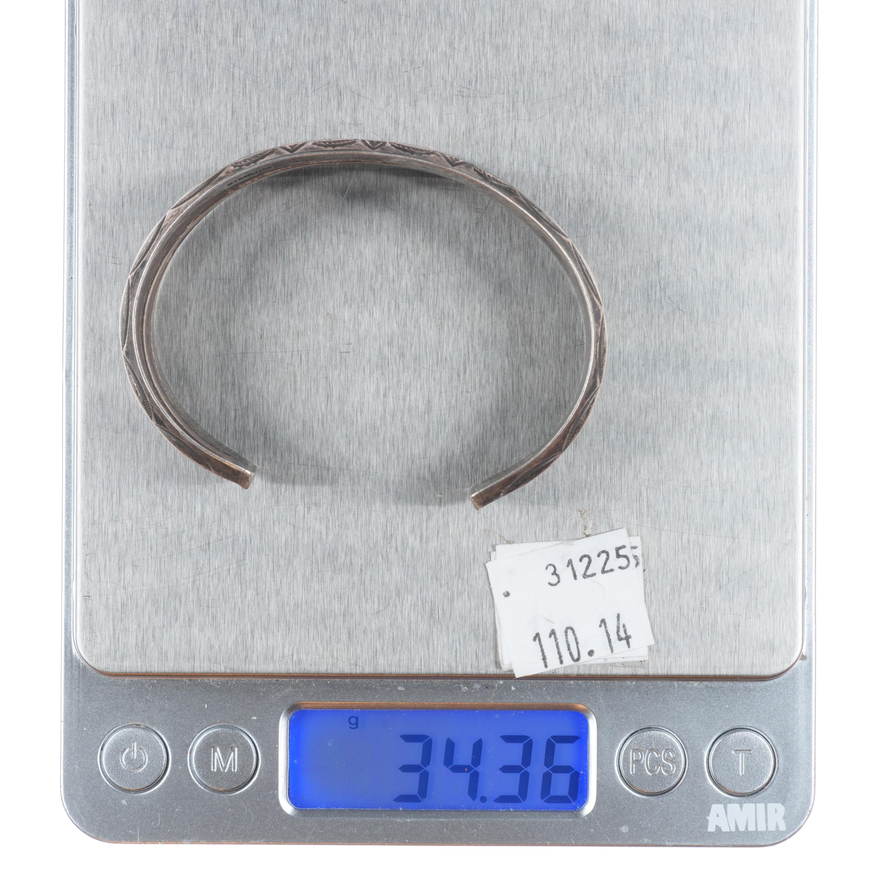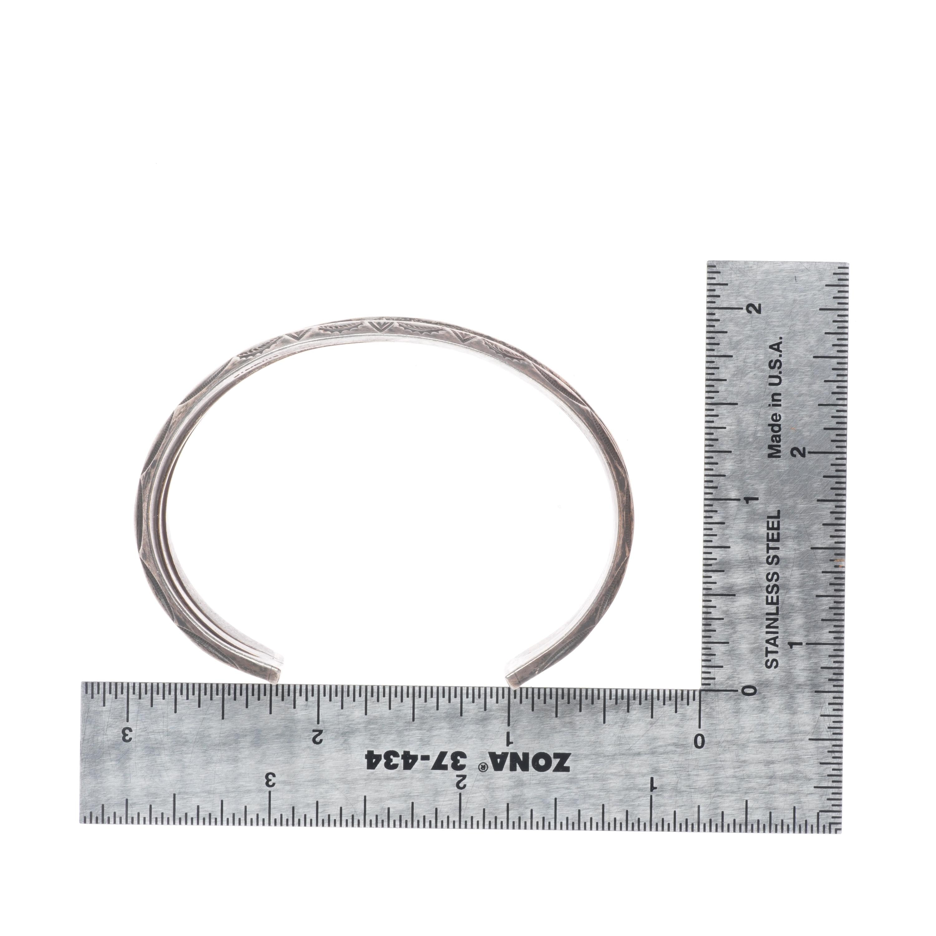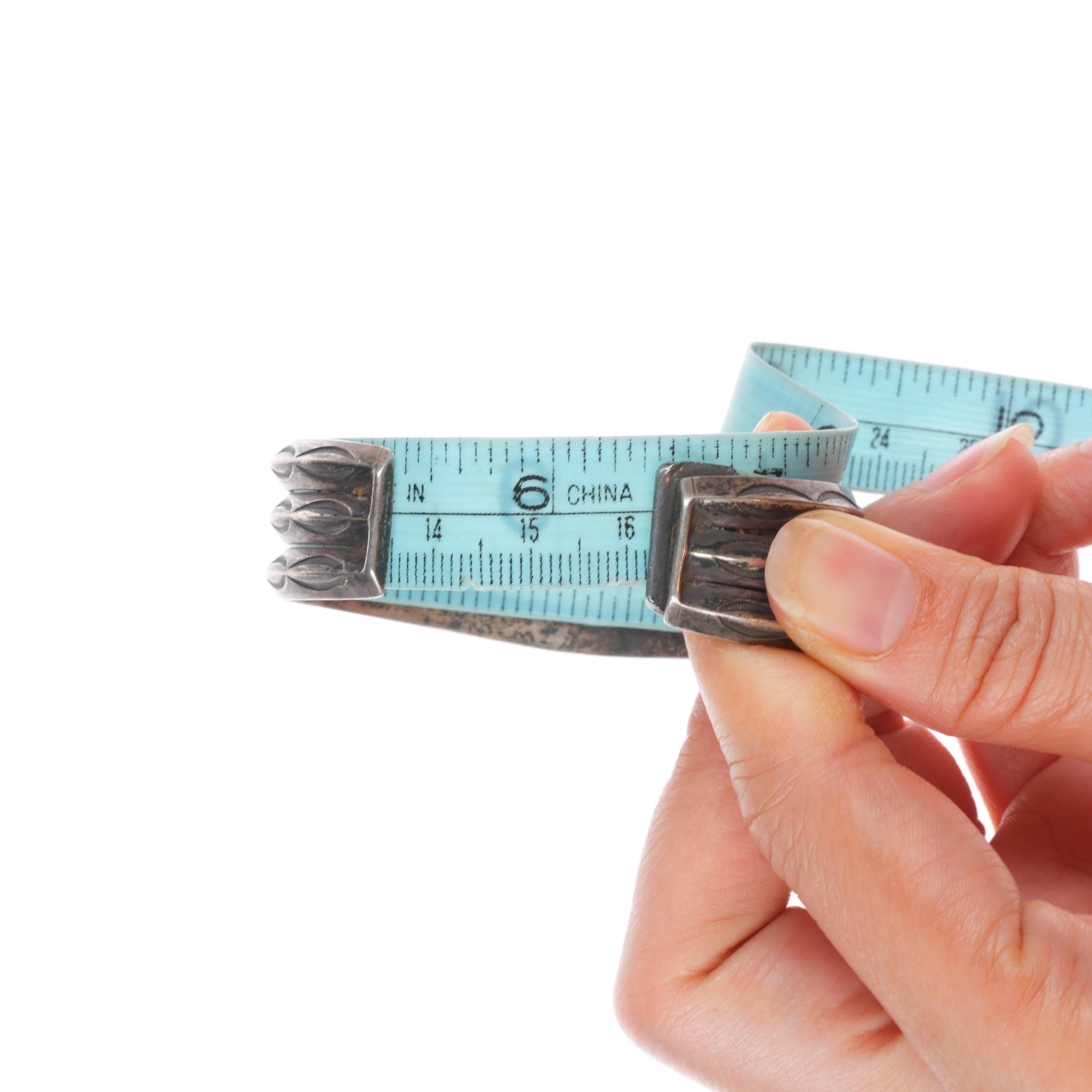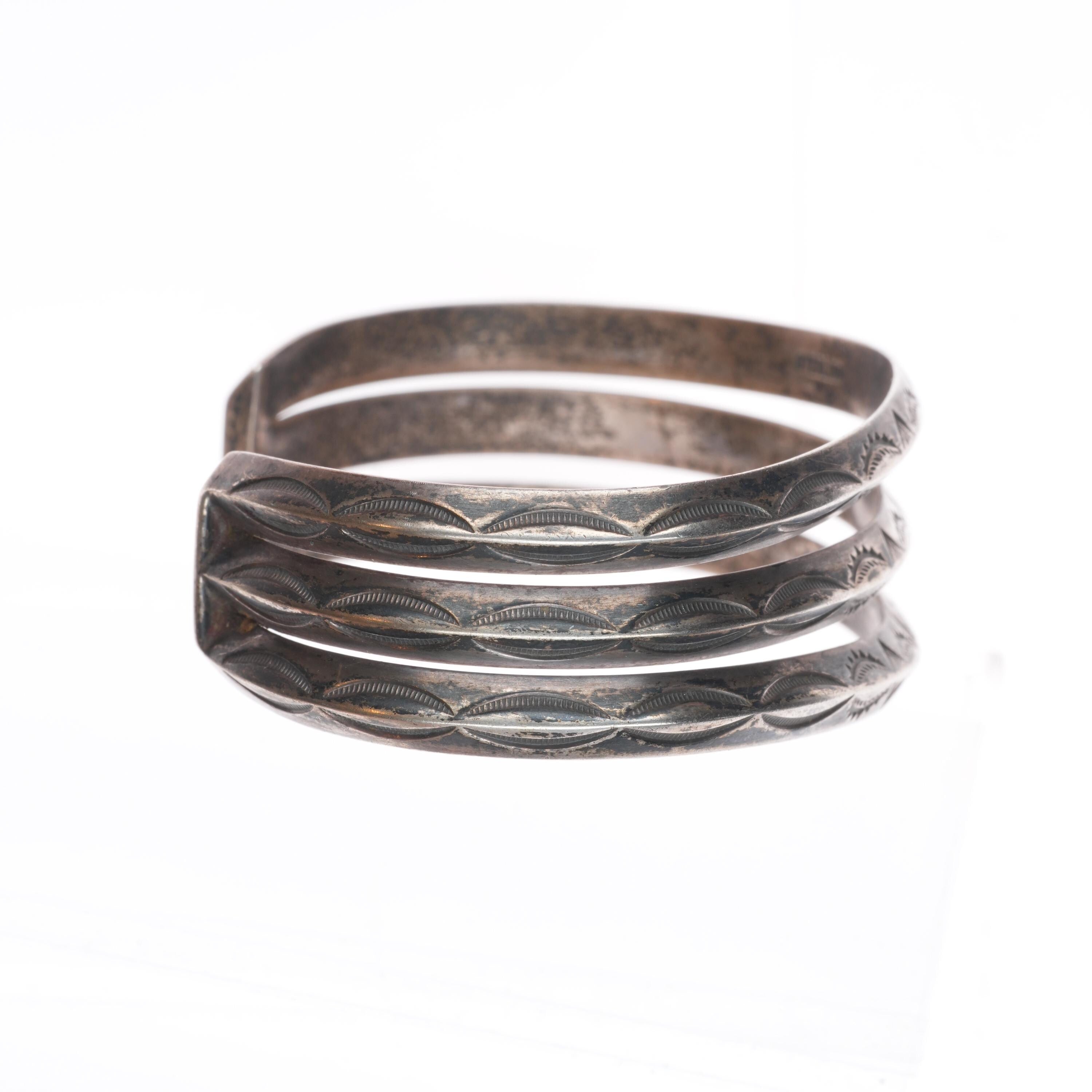 6.4" Vintage Navajo sterling silver 3 band stamped carinated cuff bracelet. Tested and guaranteed solid sterling silver with weight and measurements in pictures. Circa third quarter of the 20th century.
