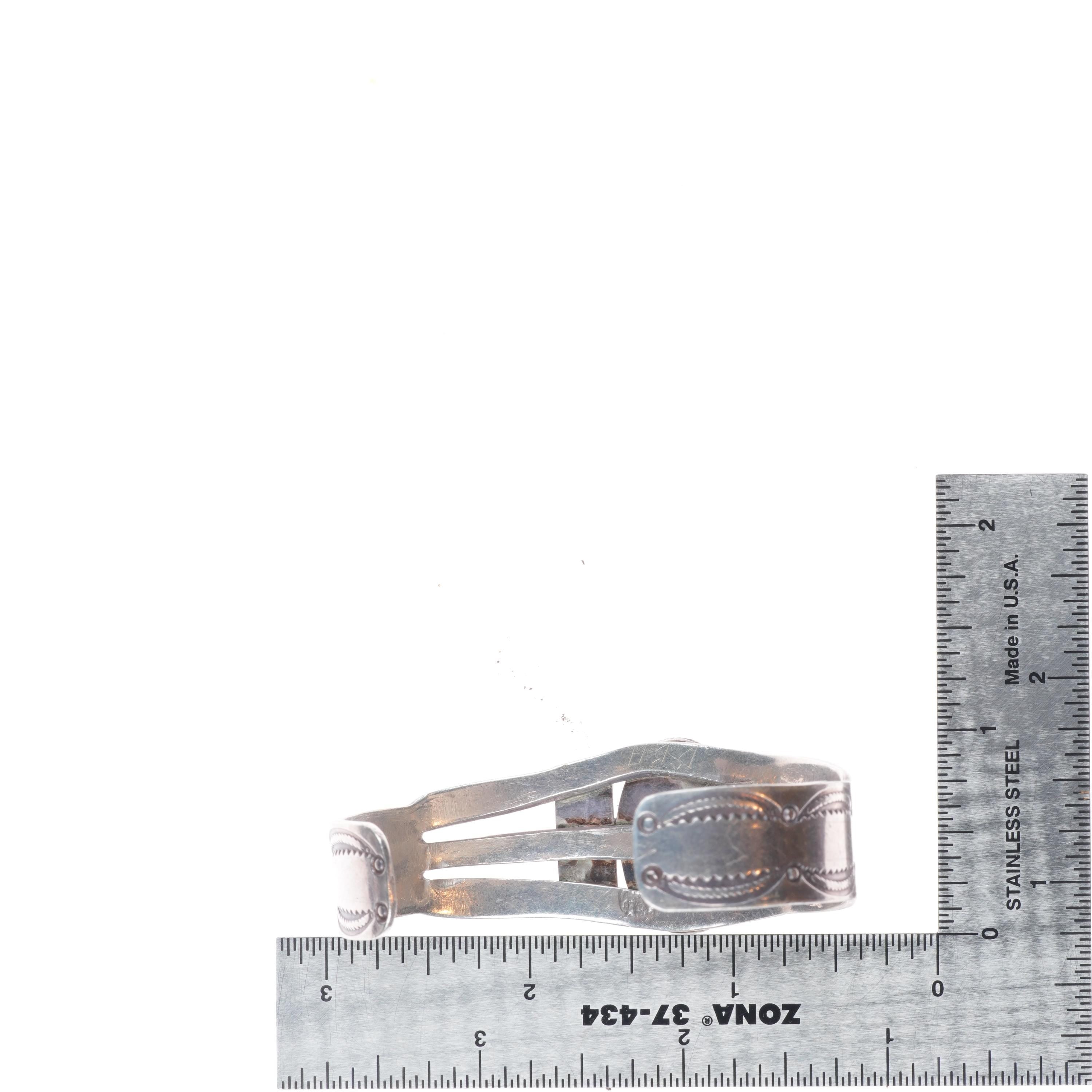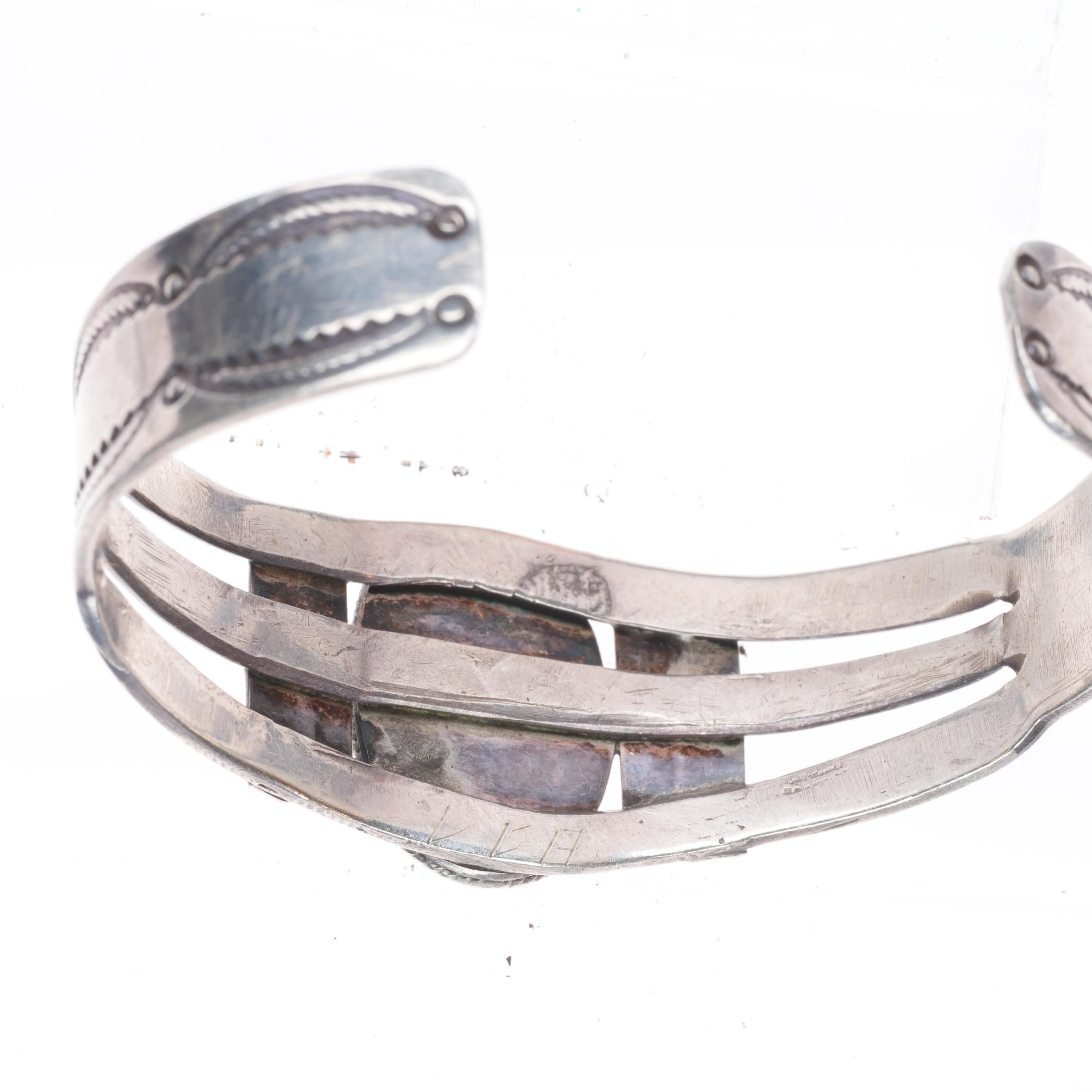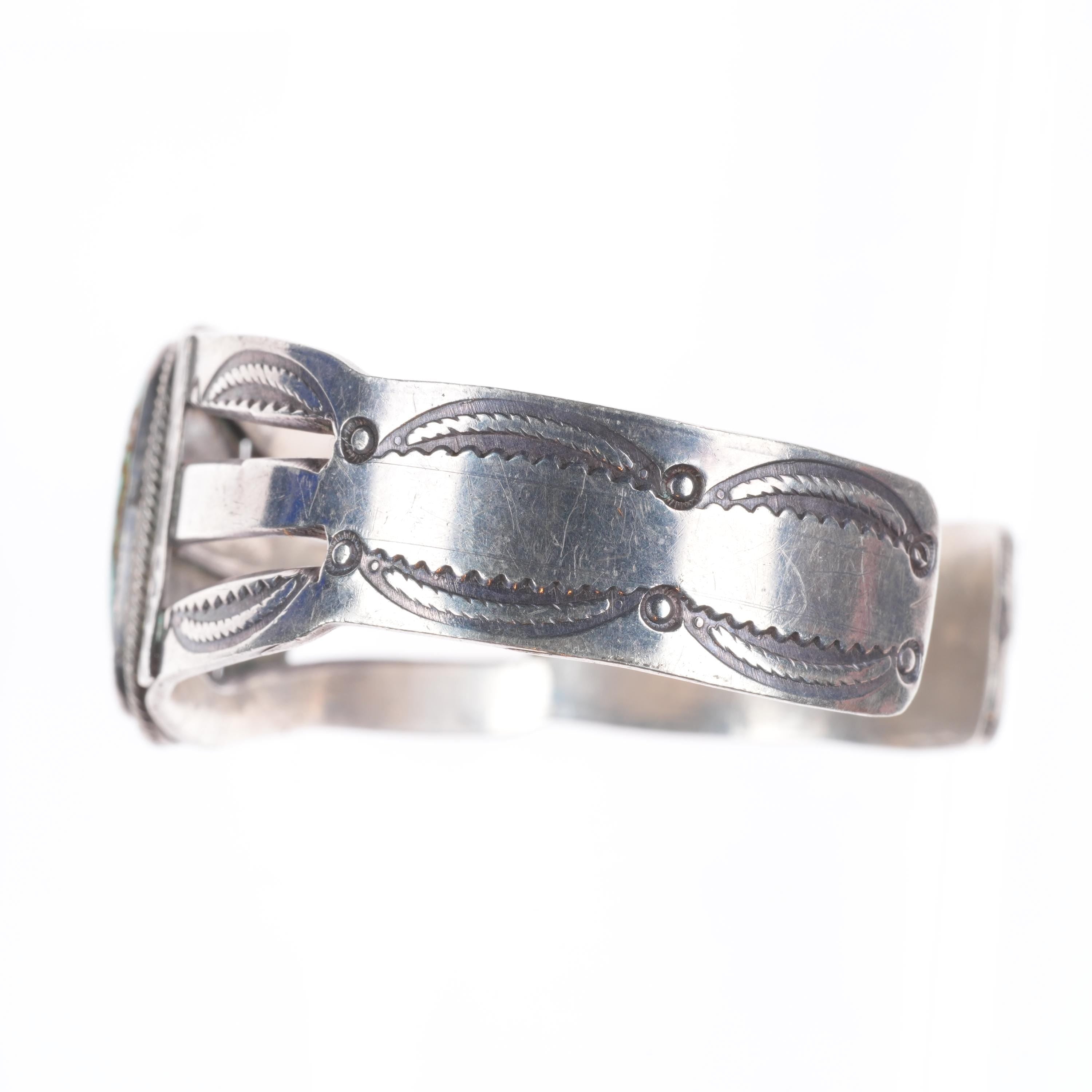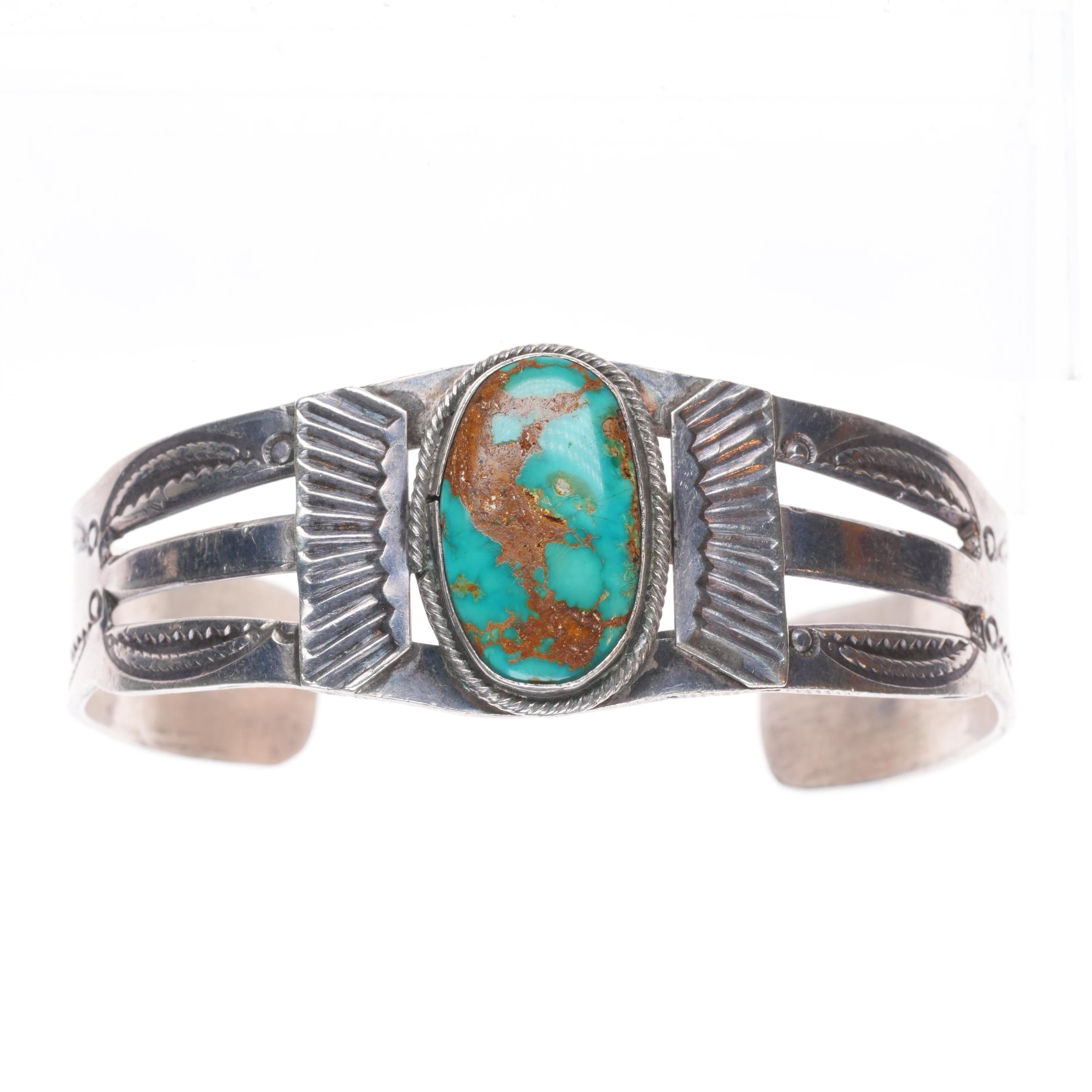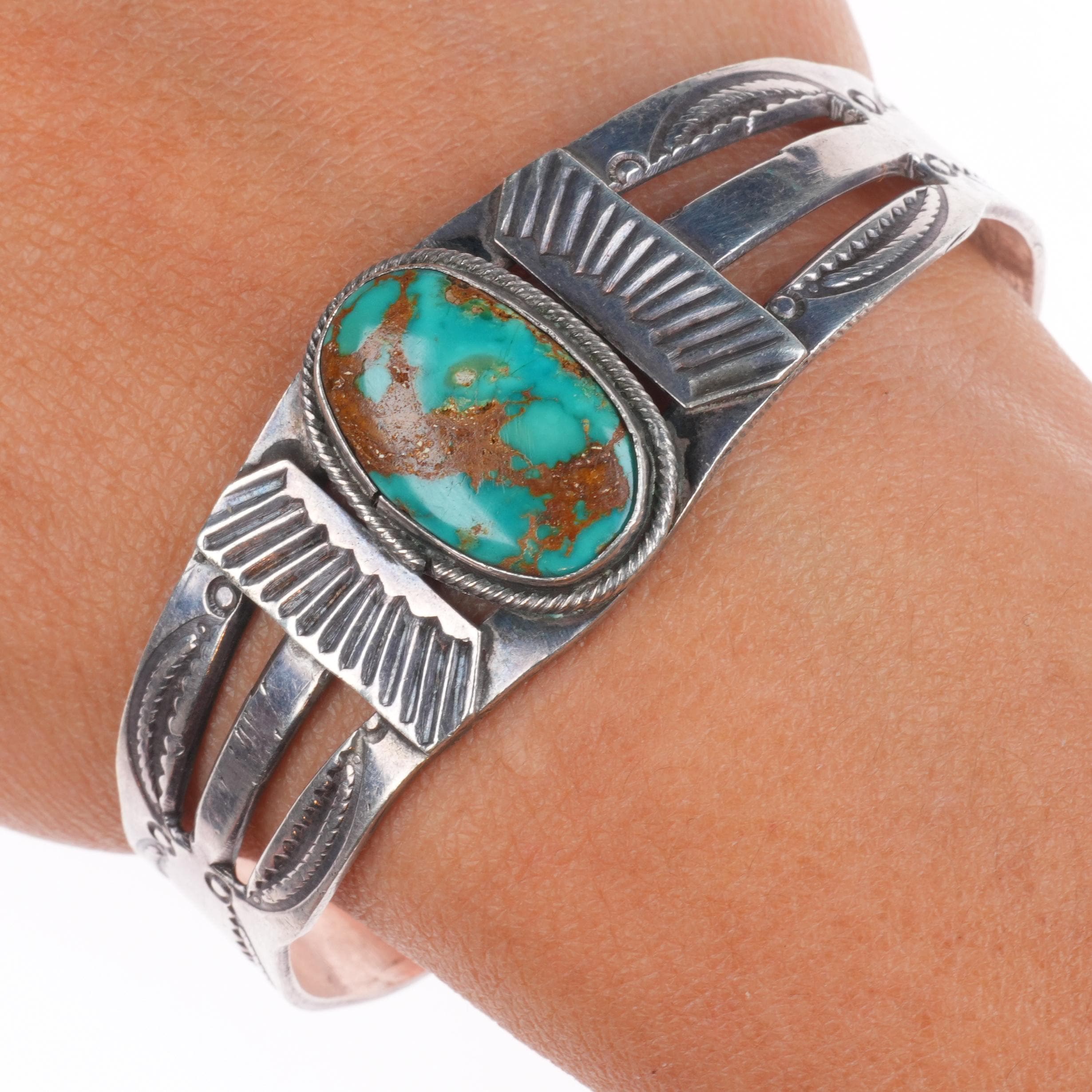 6.5" 1940‘s Navajo hand stamped sterling silver cuff bracelet w/ nice turquoise. Tested and guaranteed solid sterling silver with weight and measurements in pictures. Circa second quarter of the 20th century. Fits up to a 6.5" wrist without adjustment, though .25" or more of careful adjustment is typically very simple. Any adjustment will change the gap size of course which is shown in the pictures.