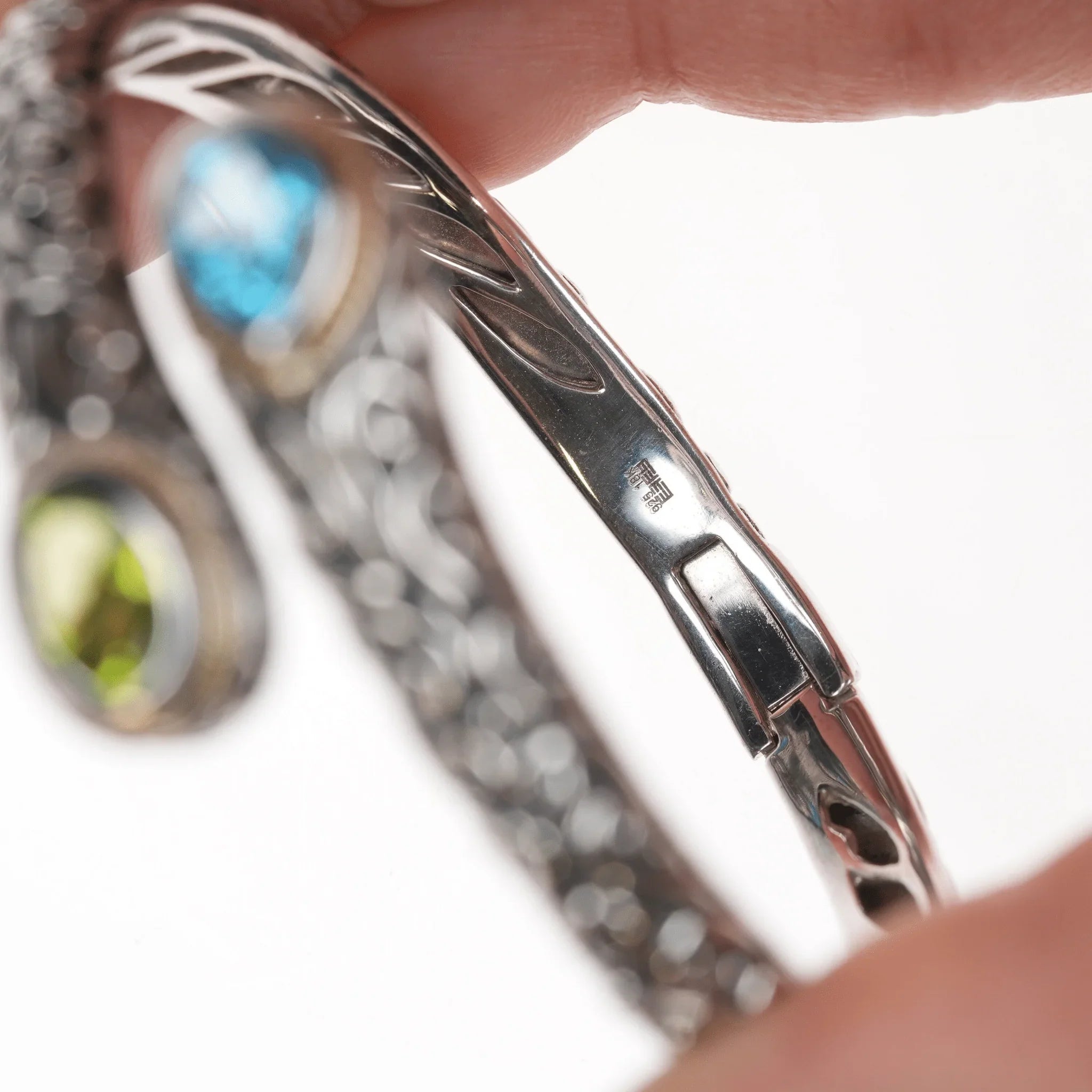 6 5/8" Effy Sterling/18k Topaz/Period clamper bangle bracelet. Clean with no issues. <br><br>Fatollah “Effy” Hematian (1943-2023)<br><br>Effy Jewelry shared news of its founder’s passing on social media Monday.<br><br>In a statement to National Jeweler, the company said: “With great sadness we<br>announce the passing of Mr. Effy Hematian. Although we will all mourn this<br>profound loss forever, we choose to celebrate all Effy has brought into our<br>lives.<br><br>“Effy was a loving husband, father, grandfather, visionary and community leader.<br>His honesty and humility only illuminate the industry-defining change he brought<br>to the jewelry world. Through his unwavering belief in God, he demonstrated that<br>we can live a life of passion and purpose, leaving the world better than he<br>found it.”<br><br>Born Dec. 10, 1943, Hematian emigrated to the US in the midst of the Islamic<br>Revolution in the late 1970s.<br><br>Though he trained and worked as an electrical engineer, Hematian started a<br>jewelry company when he landed in New York City in 1979, building his business<br>from nothing, as recounted in a video posted to the Effy Jewelry YouTube<br>channel.<br><br>“I’m really proud that I could tell you that [I] came to this country with zero<br>and today we are one of the biggest [jewelry] manufacturers in the States,” he<br>said.<br><br>According to the video, Hematian spent most of his mornings sketching jewelry<br>designs, sometimes completing as many as 20 to 30 sketches in a single day. He<br>said his background as an electrical engineer helped him see things other people<br>might have missed.<br><br>In the afternoon, he liked to walk the factory floor and keep an eye on the<br>production of his designs.<br><br>While his creativity and design inspirations were “endless,” the Effy Jewelry<br>website describes one creature—the panther—as the designer’s “lifelong muse.”<br><br>The big cat became the cornerstone of the brand’s “Signature Collection,” and it<br>became a star at Jewelers for Children’s “Facets of Hope” event, held annually<br>in Las Vegas alongside the Couture and JCK shows.<br><br>Hematian and Effy Jewelry were longtime supporters of JFC and donated plush<br>panthers to give away at the gala for about five years.<br><br>JFC Executive Director David Rocha remembered Hematian as a “lovely man.”<br><br>“Effy was always so kind and would make time to share his latest designs, his<br>inspiration and his process. He was a real icon in our industry. My thoughts are<br>with (Hematian’s son) Benny and his family,” Rocha said.<br><br>Sarin Bachmann, group vice president of the RX Jewelry Portfolio, said: “We were<br>so saddened to learn about Effy Hematian’s passing. Effy has been a wonderful<br>partner to JCK over the years and a force in the industry.<br><br>“We appreciated his deep passion for creating beautiful jewelry stemming from<br>his roots as an engineer. Effy’s legacy will live on with his family, his<br>namesake business, and the wonderful jewelry creations he inspires.”<br><br>On social media, members of the trade—including many Effy Jewelry employees—and<br>the brand’s customers reacted to news of Hematian’s passing with similar<br>remembrances, recalling a man who was kind and had a passion and a talent for<br>design.<br><br>Jan Swartz, the group president for Holland America Group, wrote on LinkedIn,<br>“Mr. Effy Hematian was much more than one of the world’s most brilliant jewelry<br>designers and visionary entrepreneurs.<br><br>“Beyond his professional achievements, he had a kind and generous spirit. I<br>admired his craftsmanship, creativity, passion, and love of his colleagues,<br>community, and family. Mr. Effy will long be remembered by every life he<br>touched, and his legacy will live on.”<br><br>On Facebook, a longtime Effy Jewelry customer said, “RIP Effy … your creations<br>have been making me happy for years and will continue to, for years to come.”