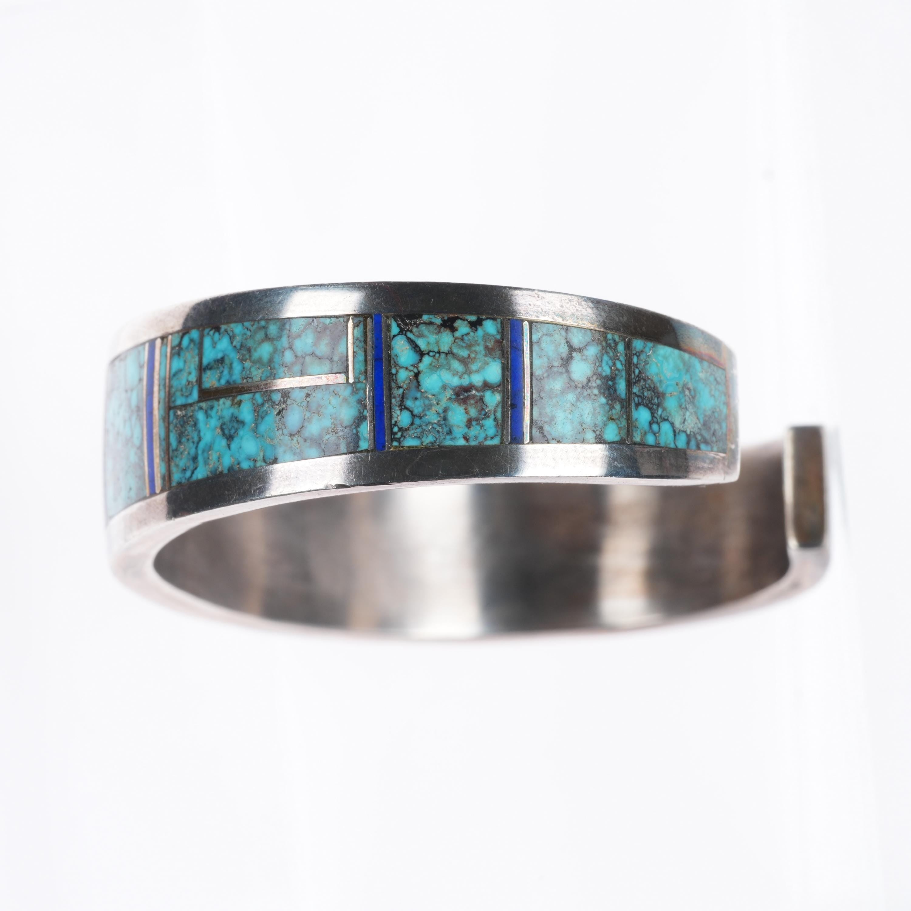 6.5" Herman Smith Navajo sterling silver spiderweb turquoise inlay cuff bracelet. Tested and guaranteed solid sterling silver with weight and measurements in pictures. Circa last quarter of the 20th century. Fits up to a 6.5" wrist.