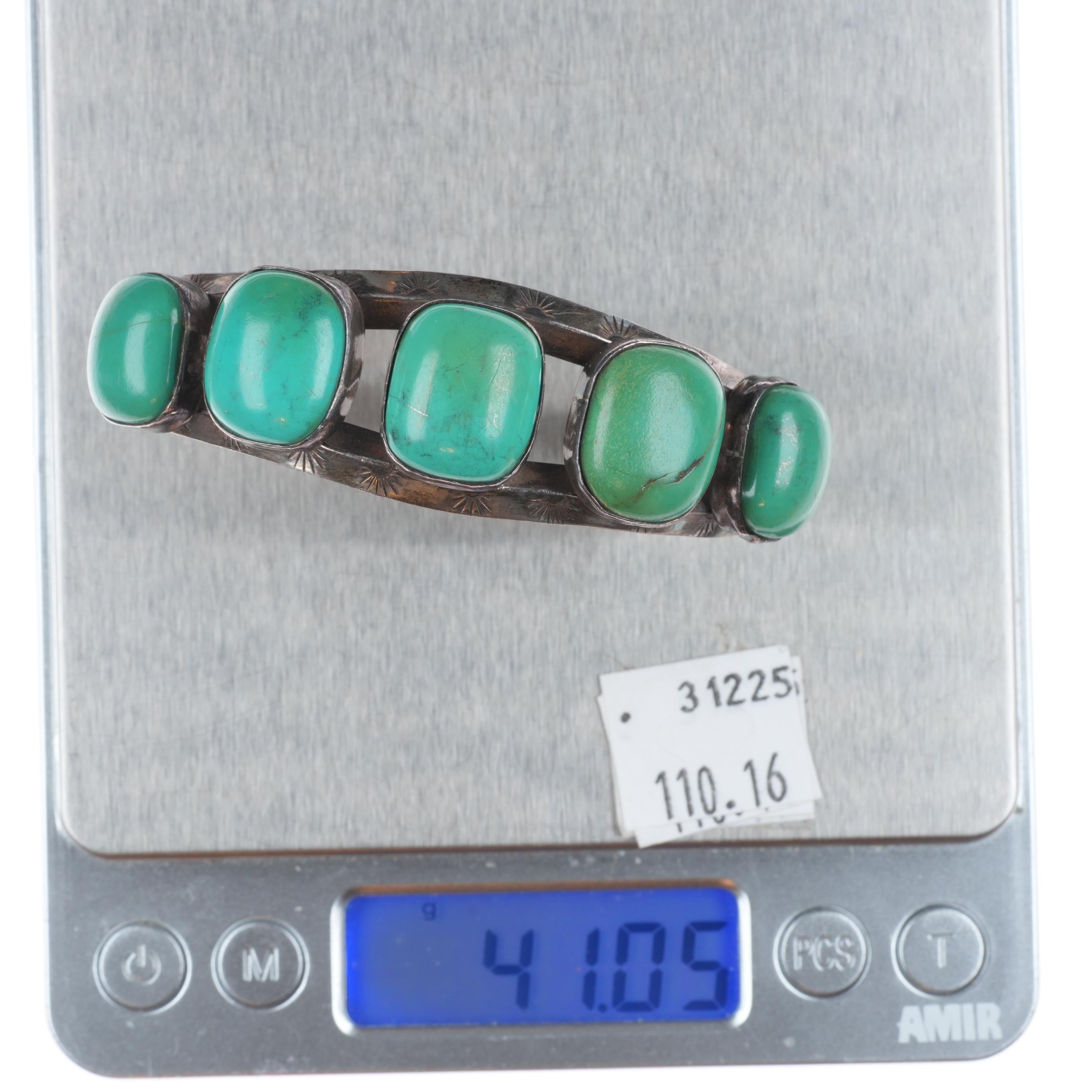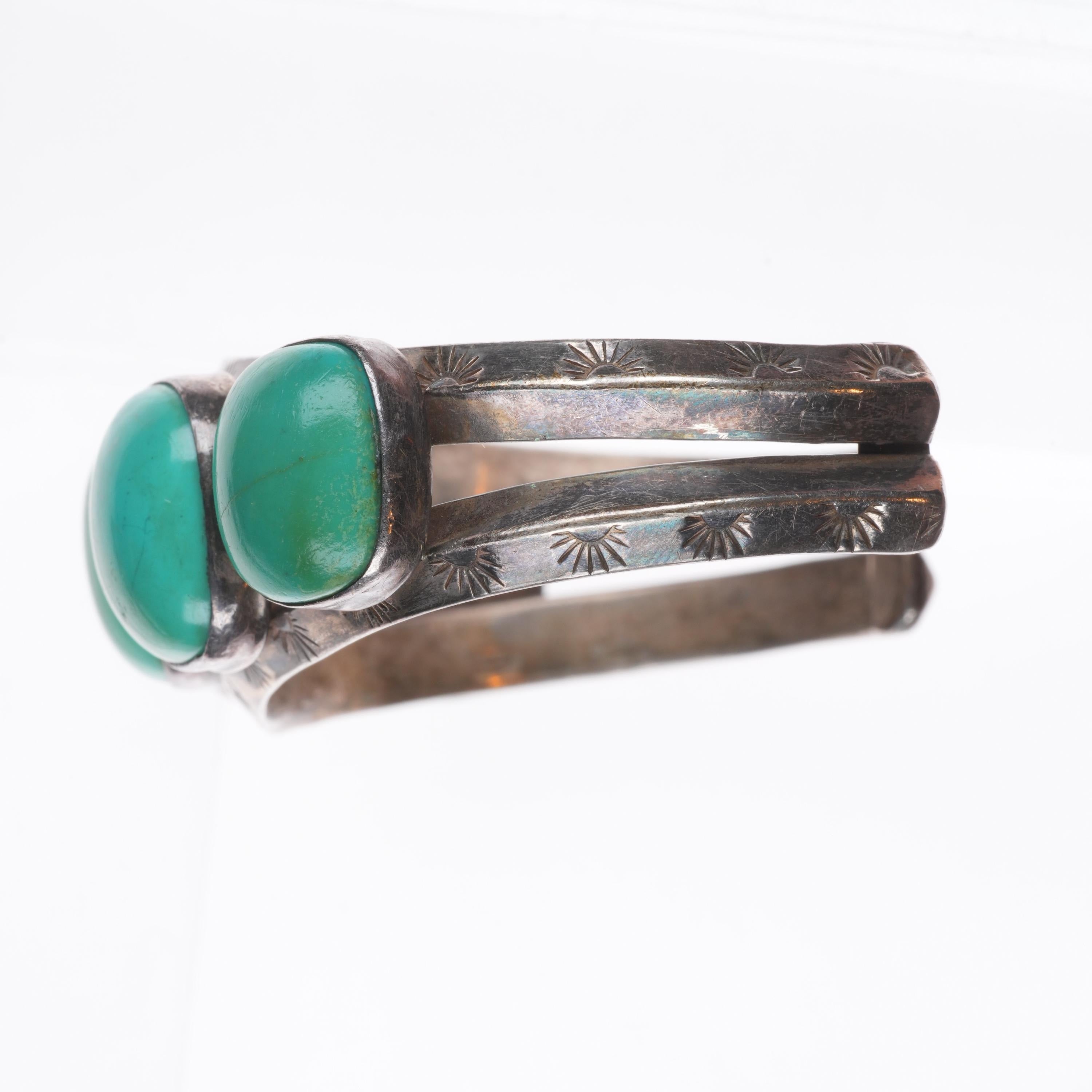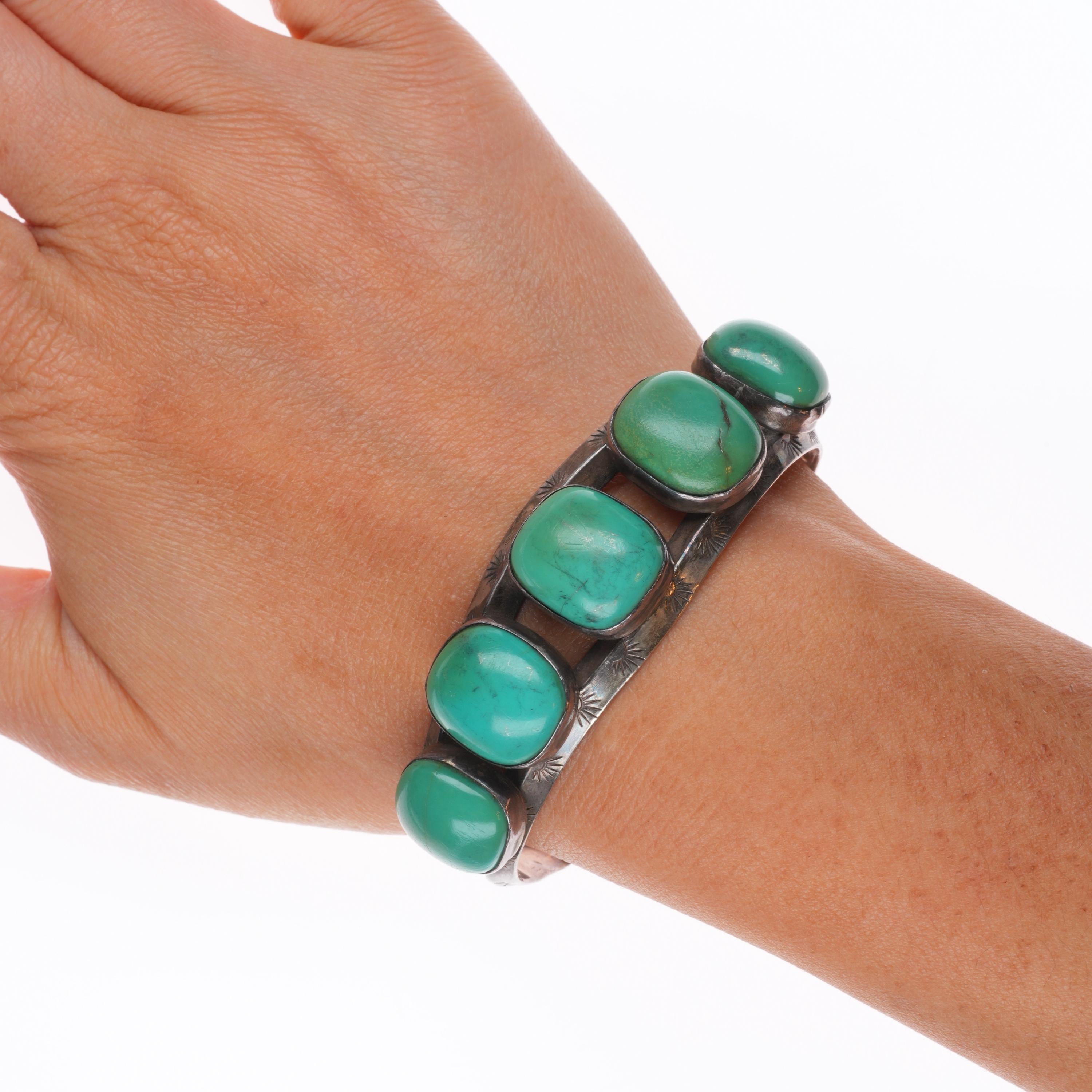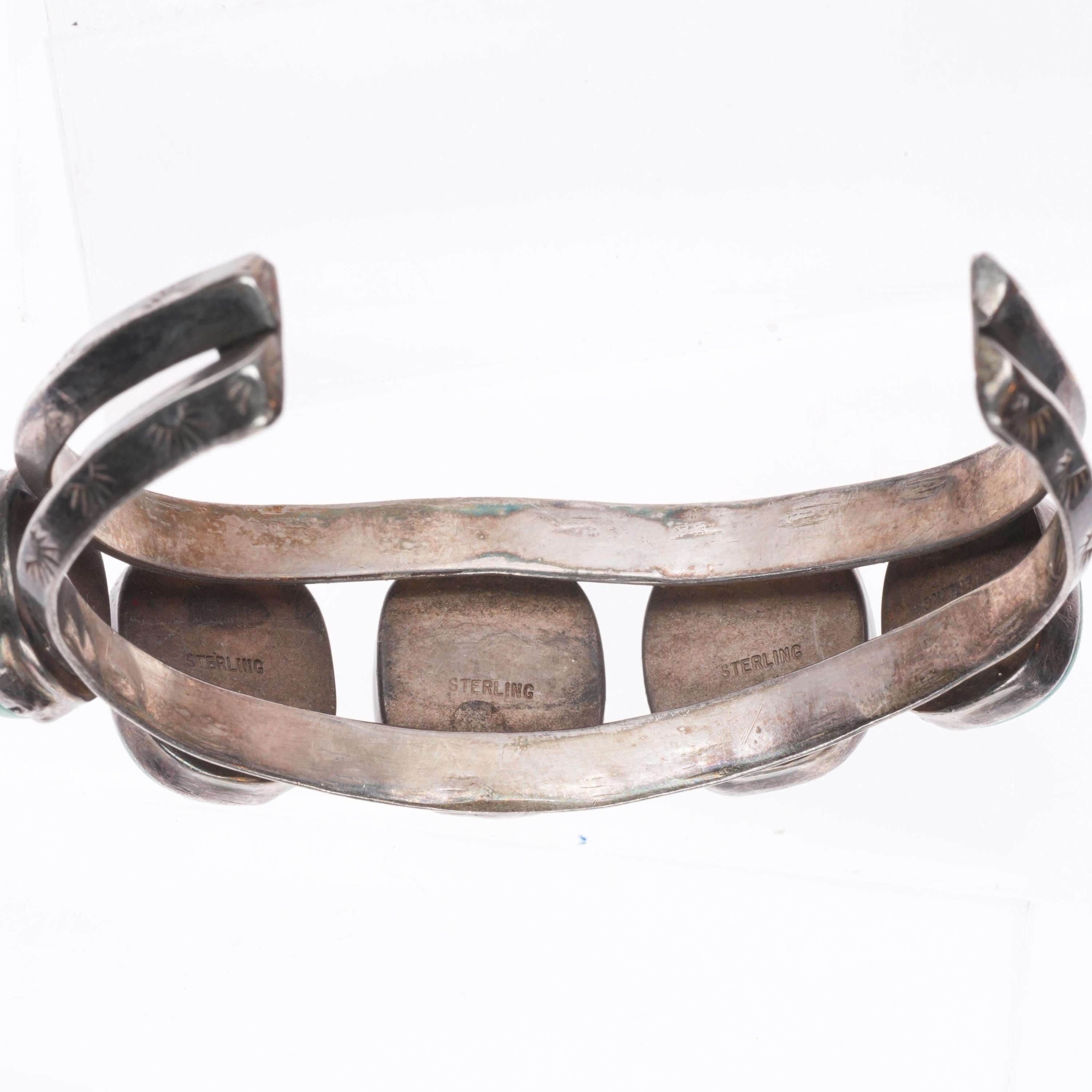 6.5" Vintage Navajo carinated sterling silver turquoise row cuff bracelet. Tested and guaranteed solid sterling silver with weight and measurements in pictures. Circa third quarter of the 20th century with age appropriate wear..