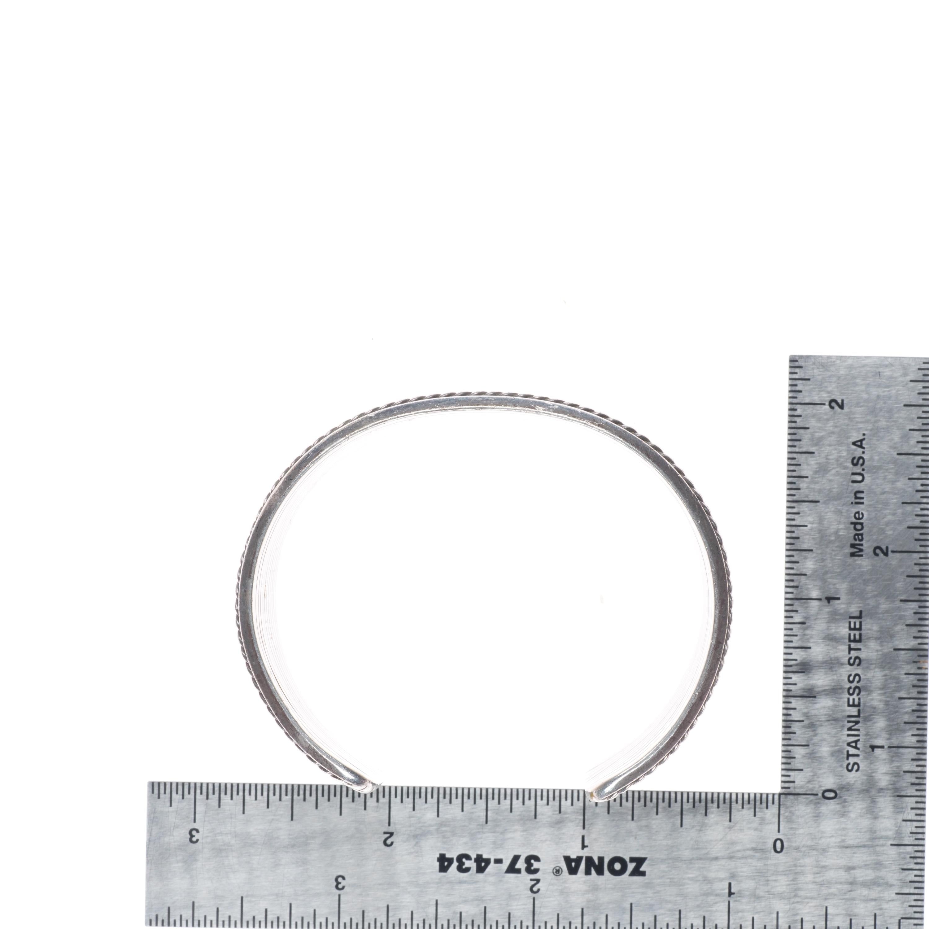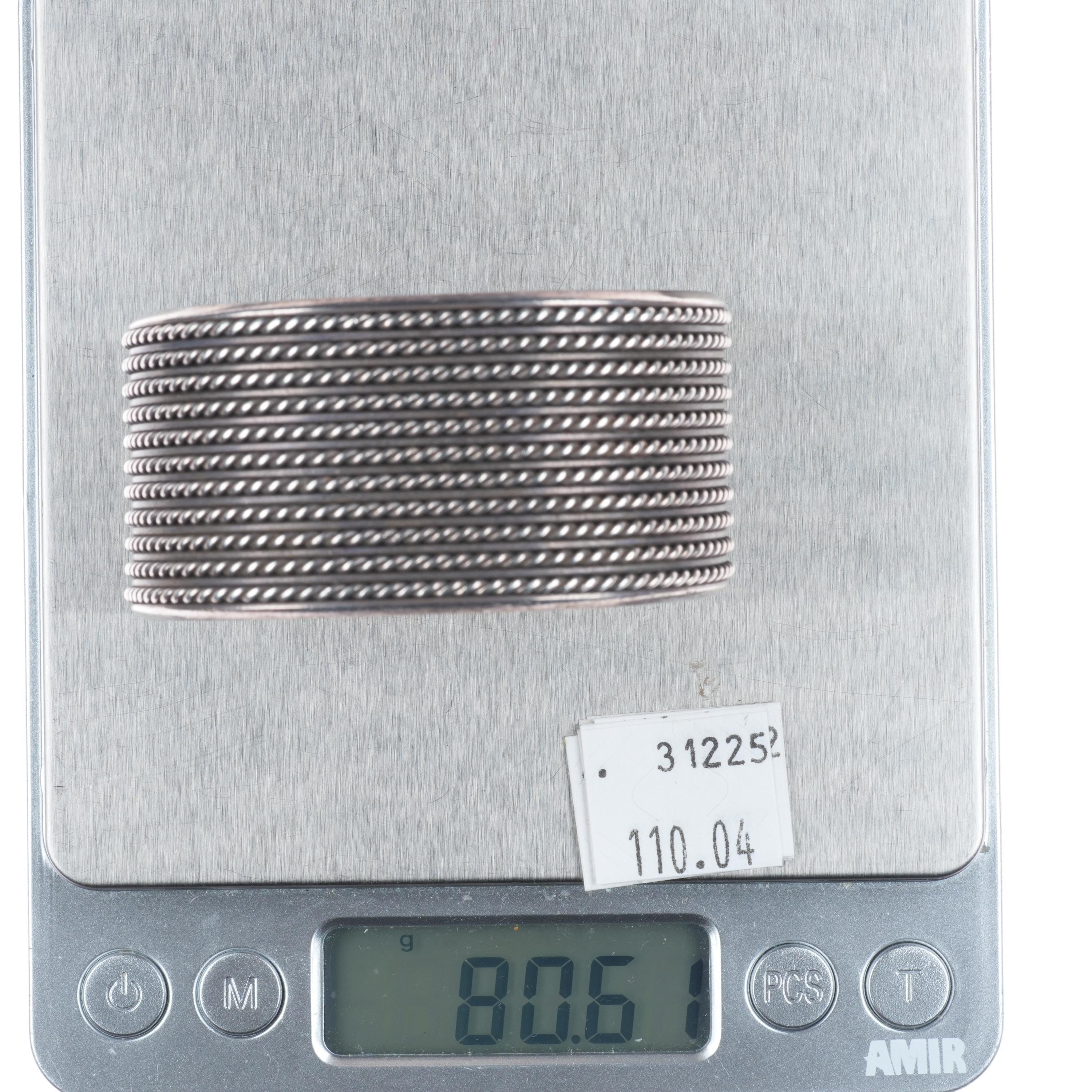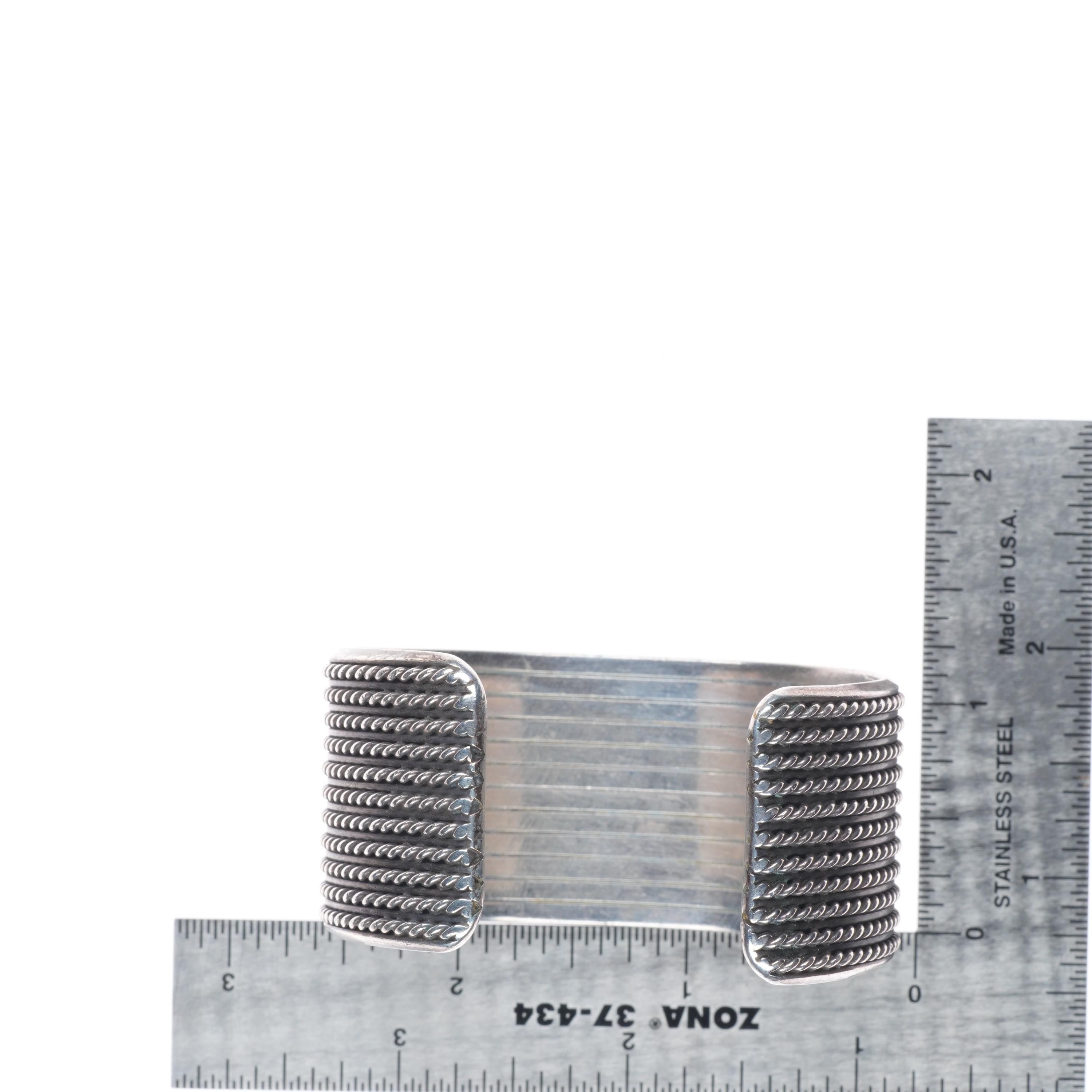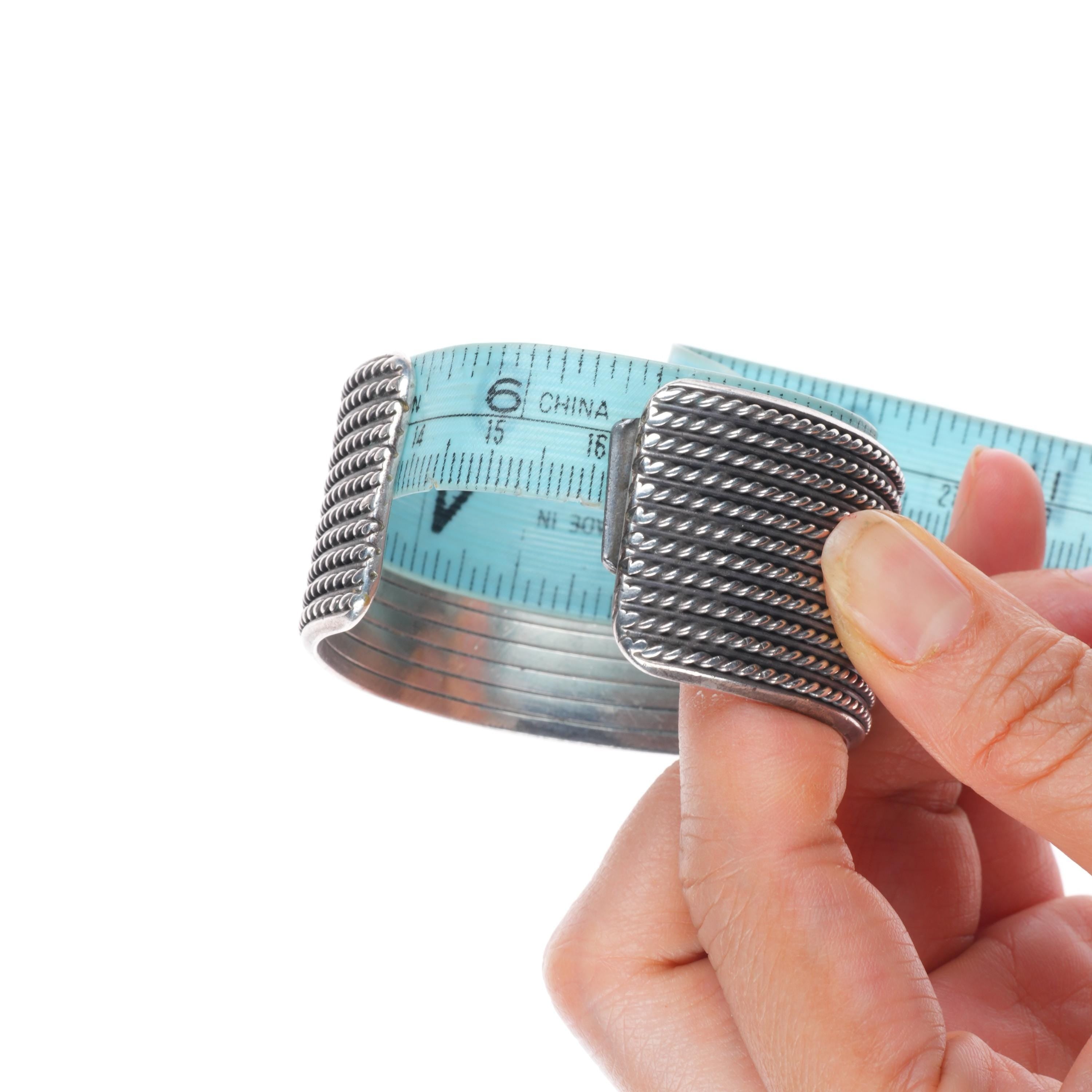 6.5" Vintage Navajo sterling silver twisted wire wide band cuff bracelet. Tested and guaranteed solid sterling silver with weight and measurements in pictures. Circa third quarter of the 20th century. Fits up to a 6.5" wrist without adjustment, though .25" or more of careful adjustment is typically very simple. Any adjustment will change the gap size of course which is shown in the pictures. Unmarked.
