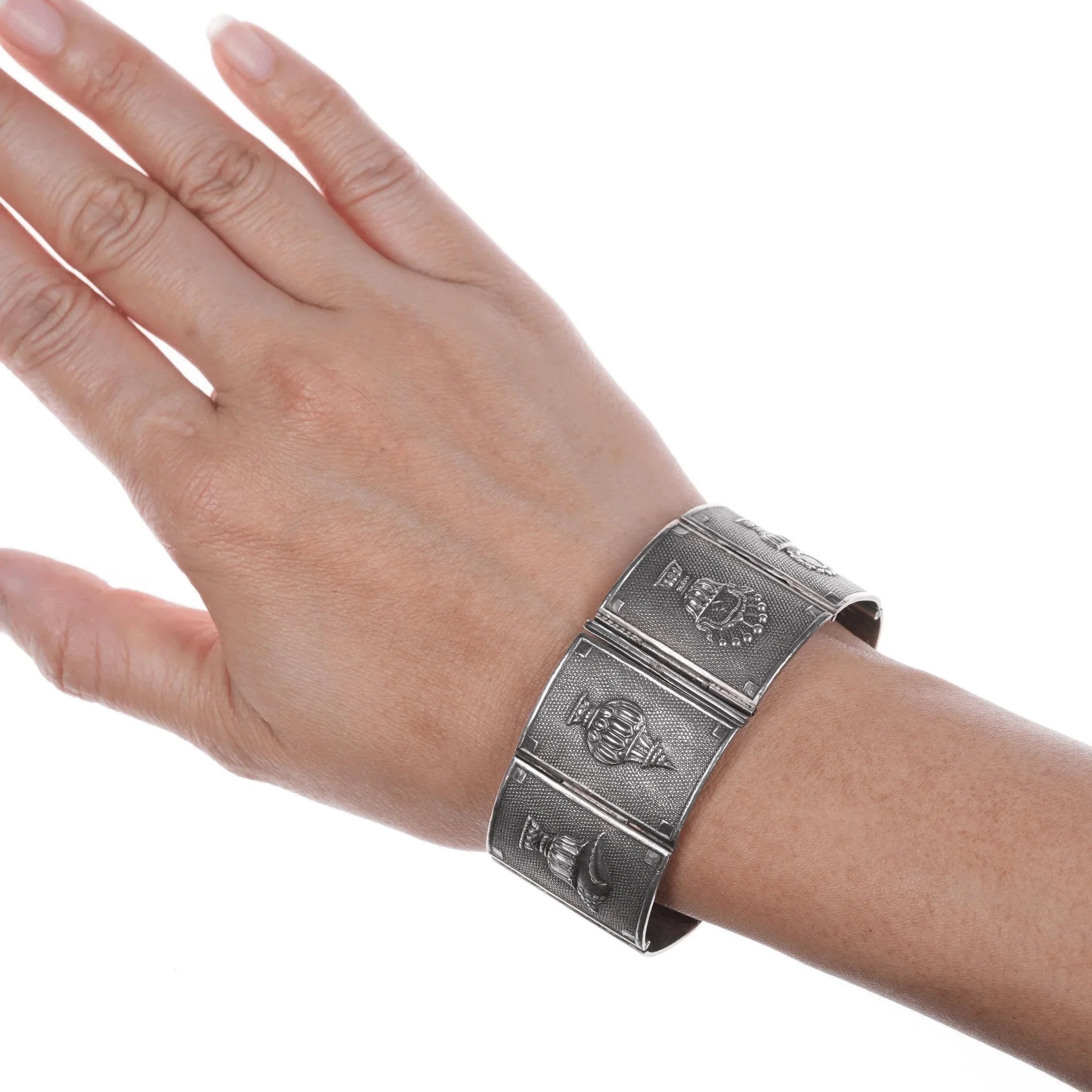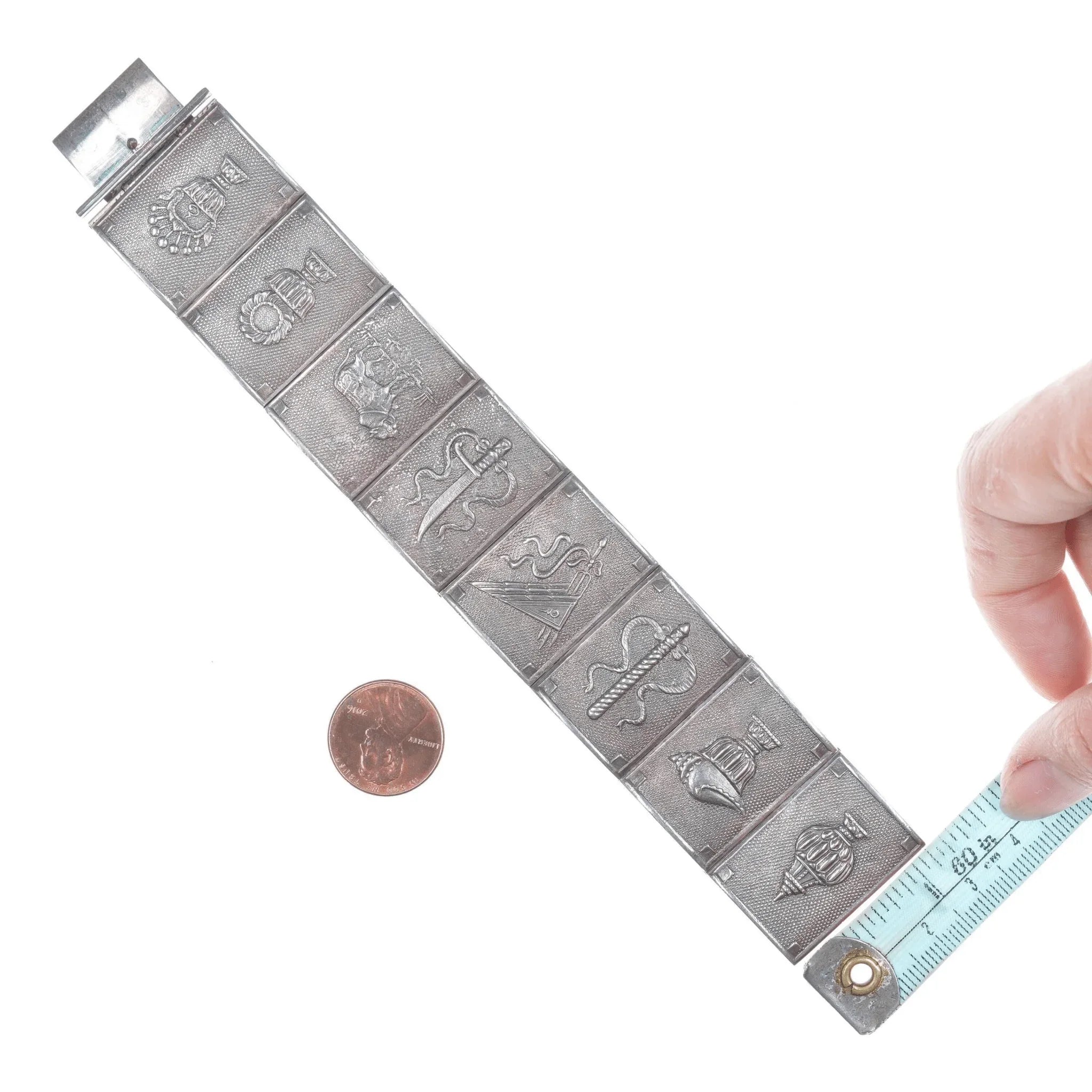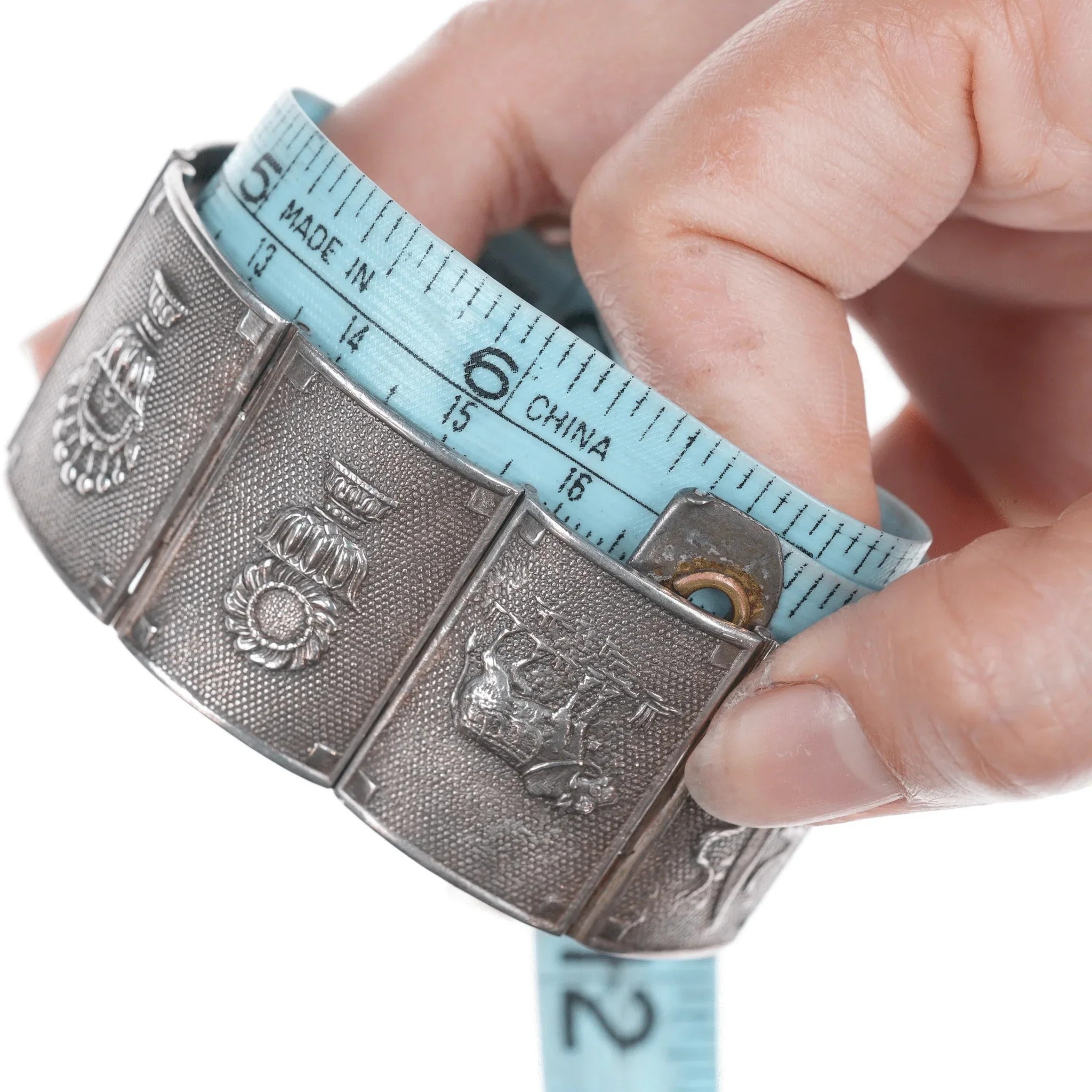6.5" Vintage Sterling Siam 8 Precious things bracelet<br><br>Marked or unmarked as shown in pics, weight and other measurements in pics. Sorry but my jewelry is stored in a secure location and cannot be accessed for more pictures,<br>videos, or measurements until sold. If you look at pictures/description your<br>question should be answered. Thank you so much for your time and consideration! If you would like to chat, that would be great, but lets chat about something that isn't answered in this listing that we put so much effort into already :)<br><br>All precious metals are tested and guaranteed. A Native American jewelry piece referred to as "silver" or "ingot" is guaranteed to be at least 90% silver. I rarely use the word "sterling" when referring to older Native American silver or really any older silver jewelry as silver contents vary and "sterling" is 92.5% silver. No older jewelry is going to be exactly 92.5% silver, some a little over, some a little under. It wasn't an exact thing with handmade jewelry. I've seen thousands of pieces xrf'd to prove this. Bracelets are photographed on a 6" women's wrist.<br><br>anderas
