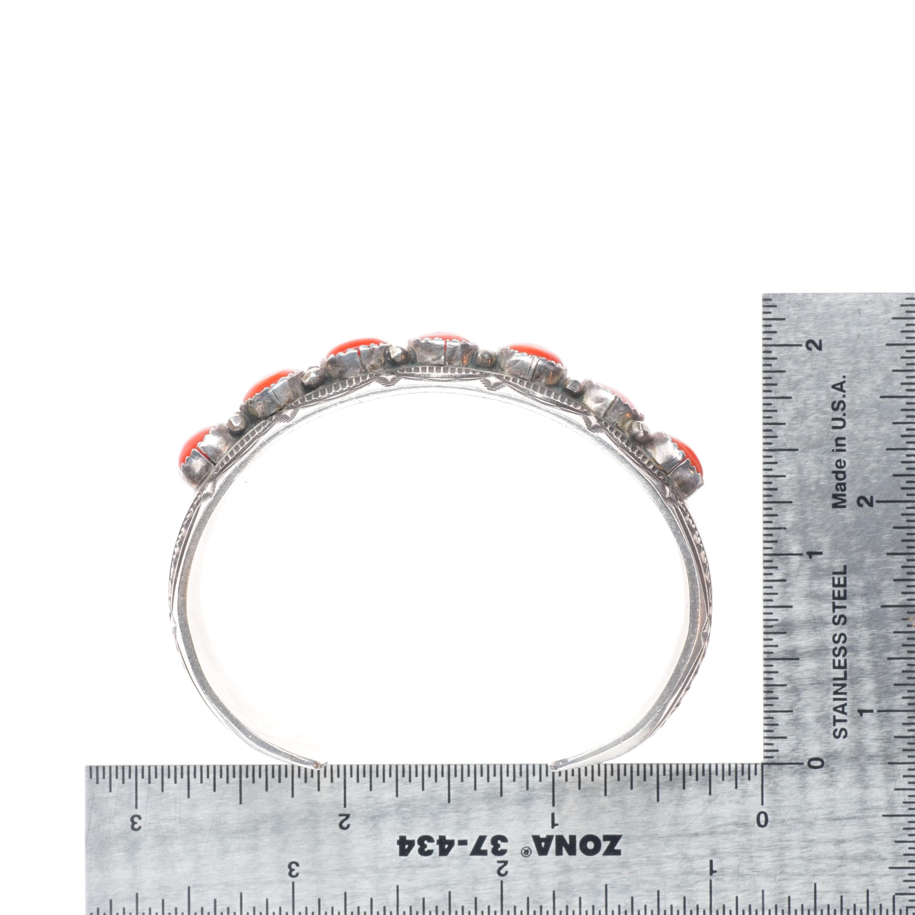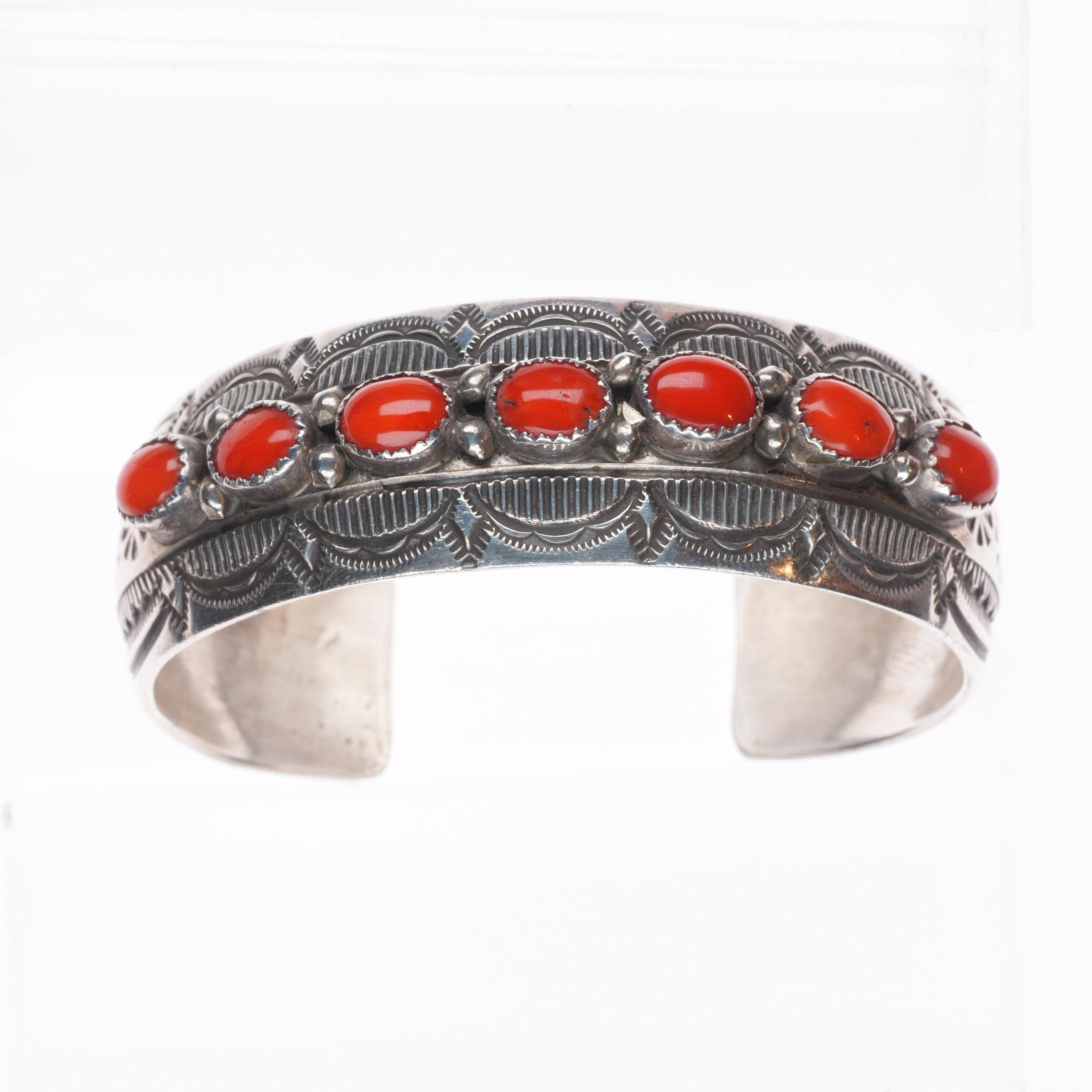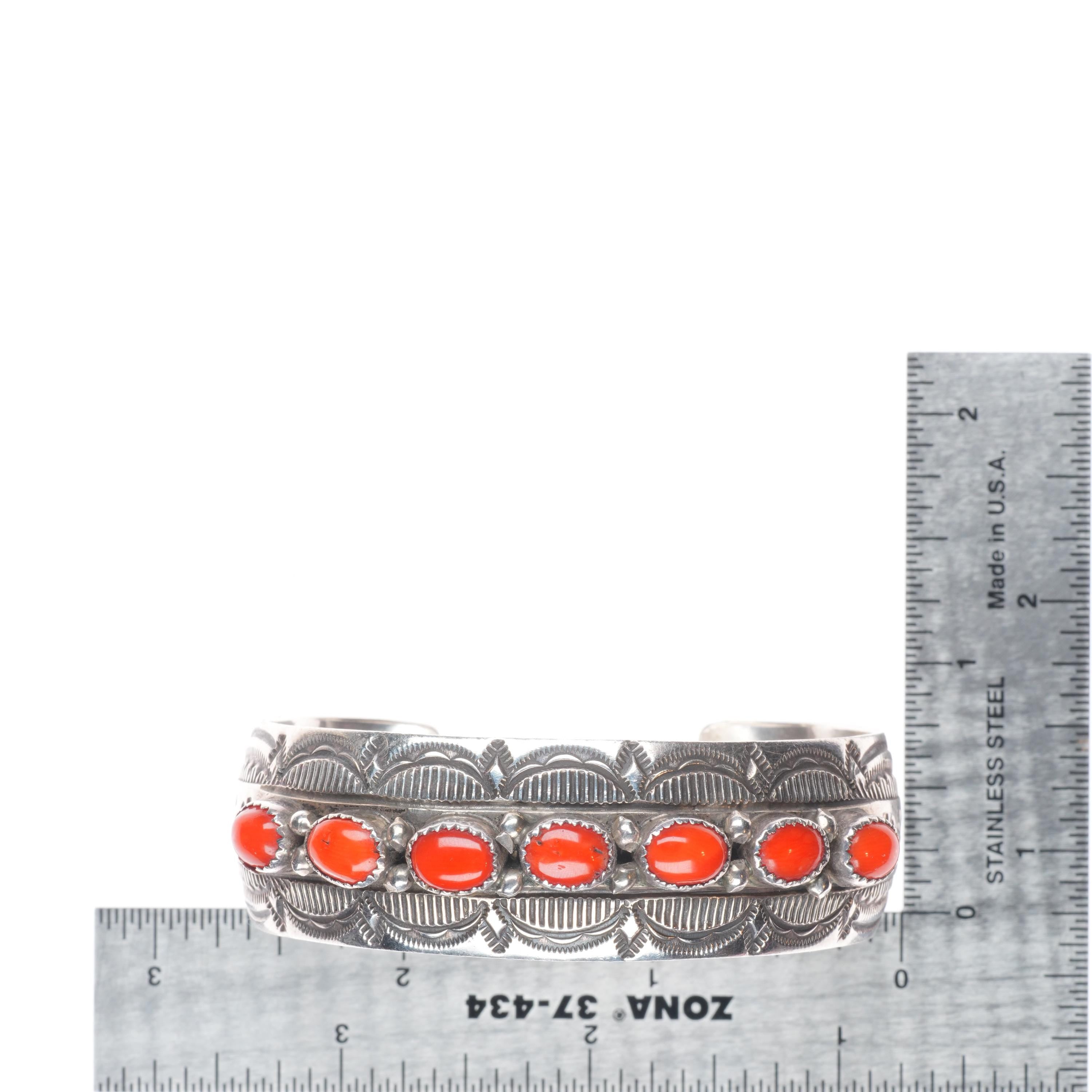 6.5" Wilbert Benally Navajo sterling silver deep stamped coral row cuff bracelet