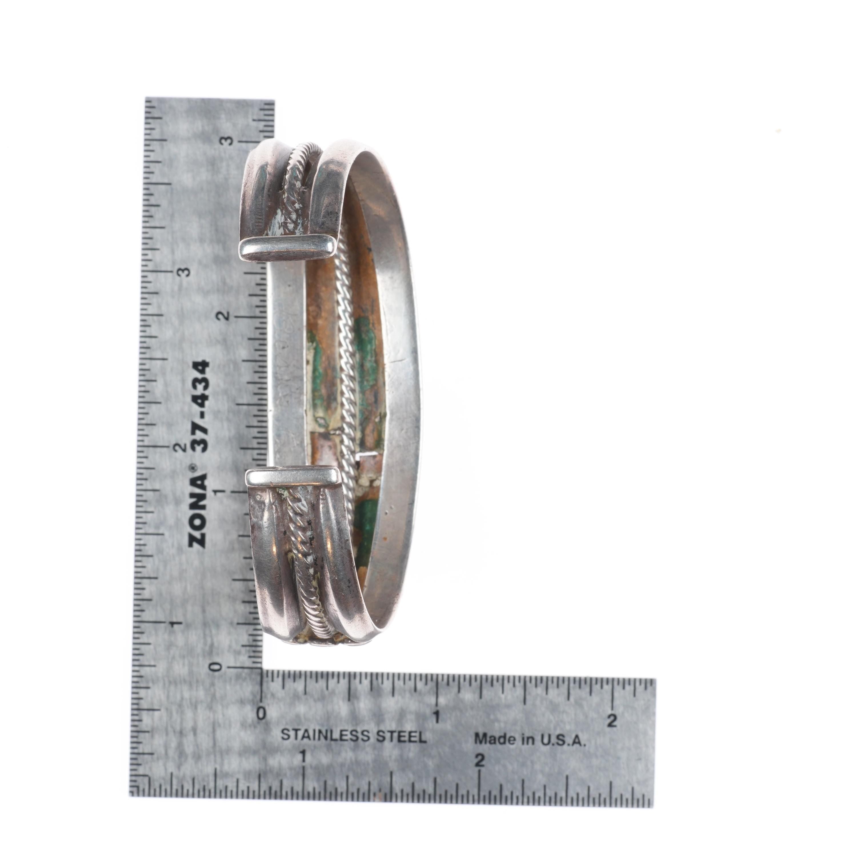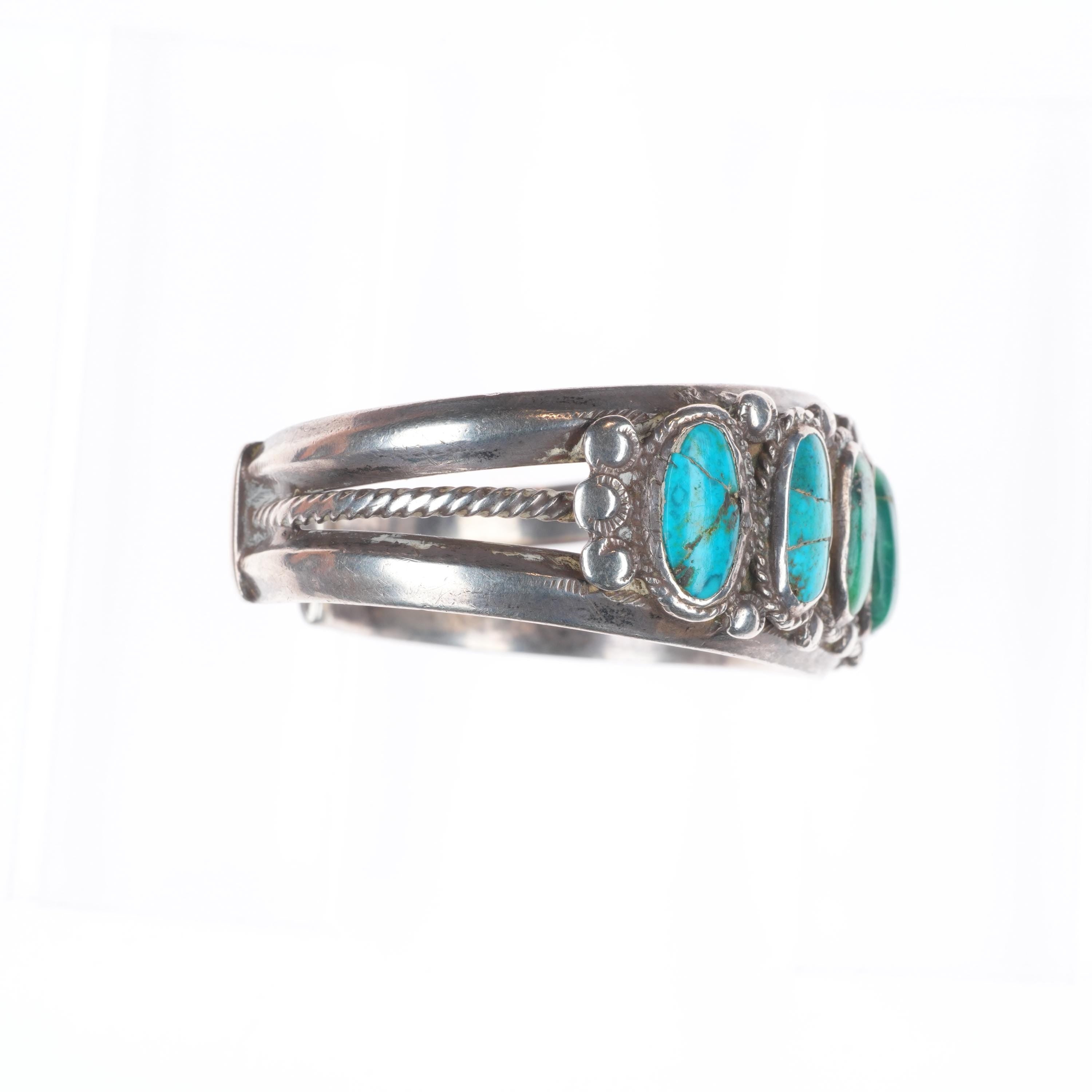 6.6" 1930's Navajo ingot silver turquoise row cuff bracelet twisted wire center. Tested and guaranteed solid sterling silver with weight and measurements in pictures. Circa second quarter of the 20th century with some expected age appropriate wear. All stones secure, some with old stable fractures. Previous owners name in interior.