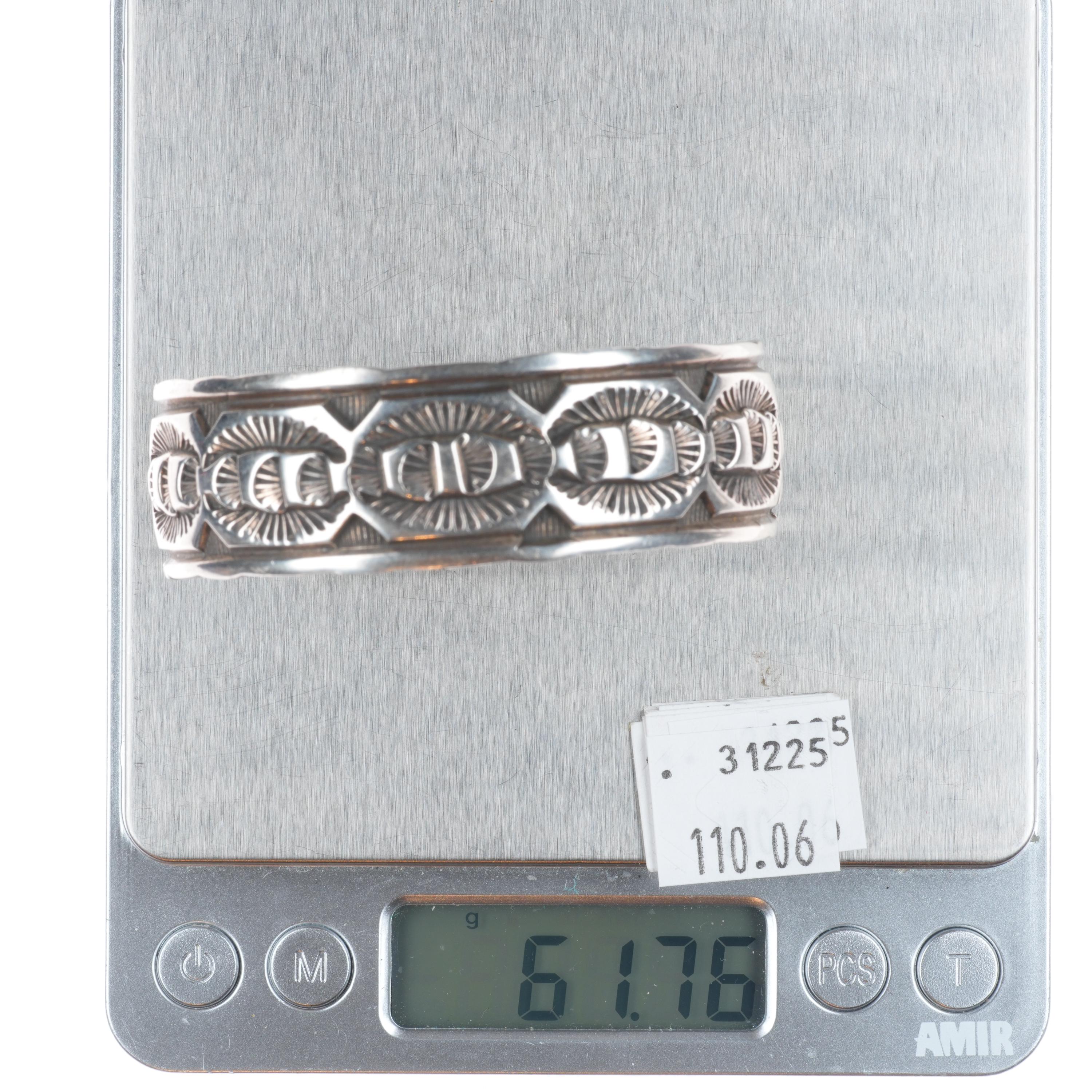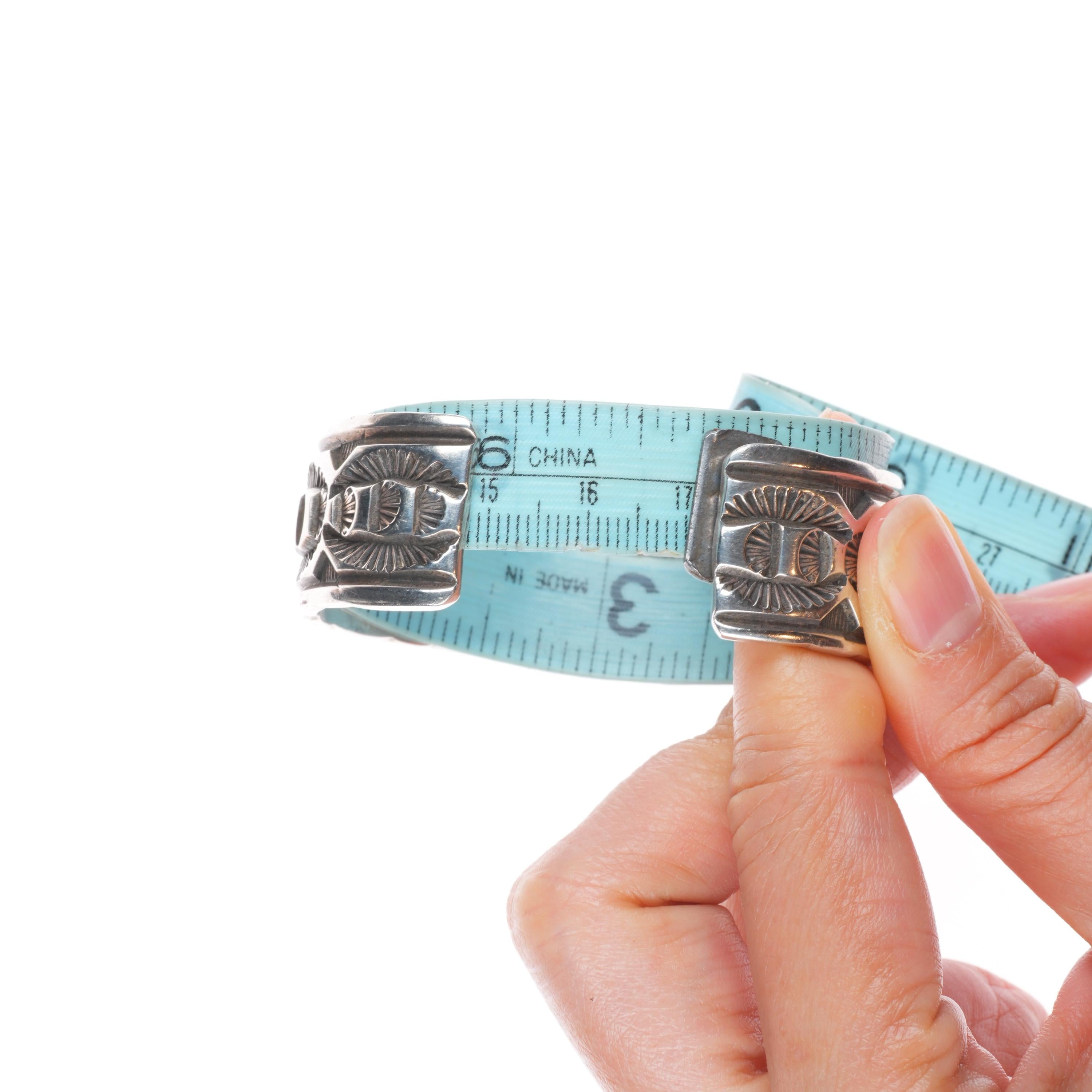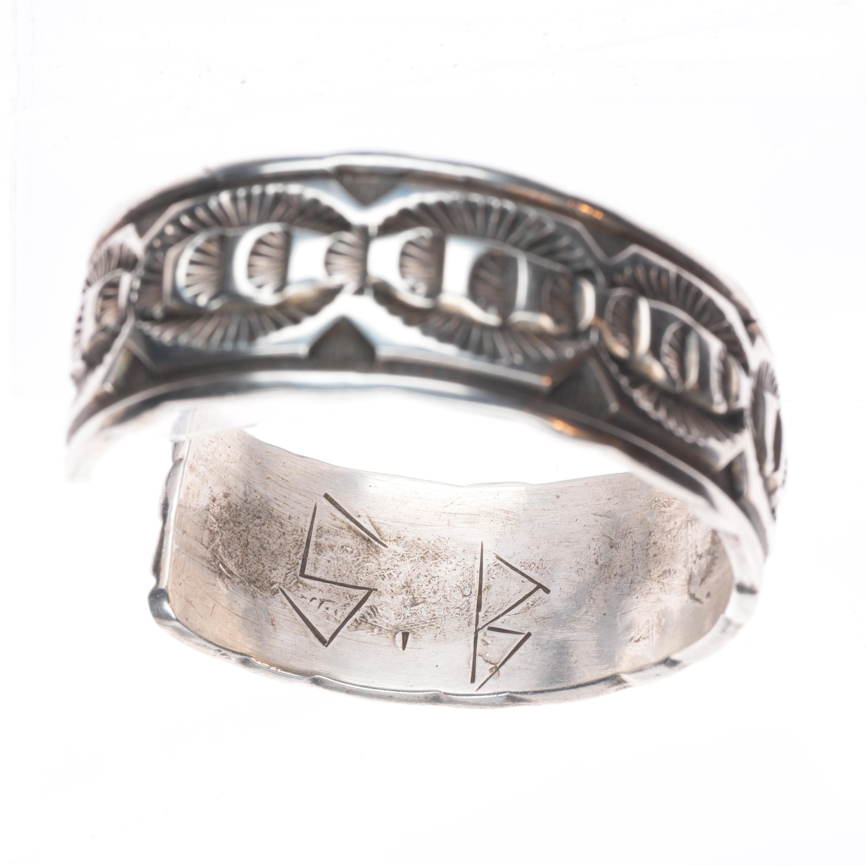 6.6" Vintage Navajo Deep stamped sterling silver SB cuff bracelet. Tested and guaranteed solid sterling silver with weight and measurements in pictures. Circa third quarter of the 20th century. Fits up to a 6.6" wrist. Illegible/unidentified hallmark.