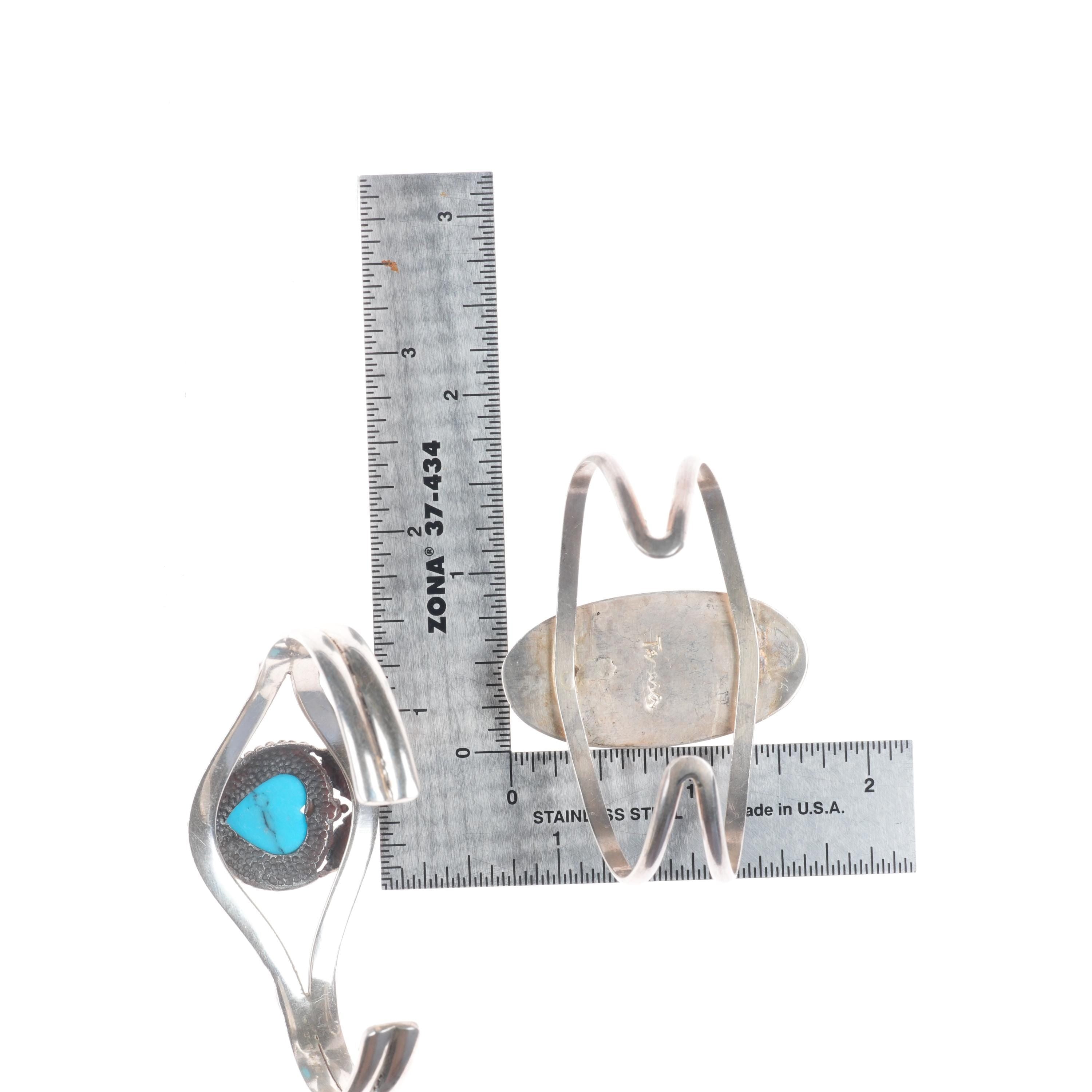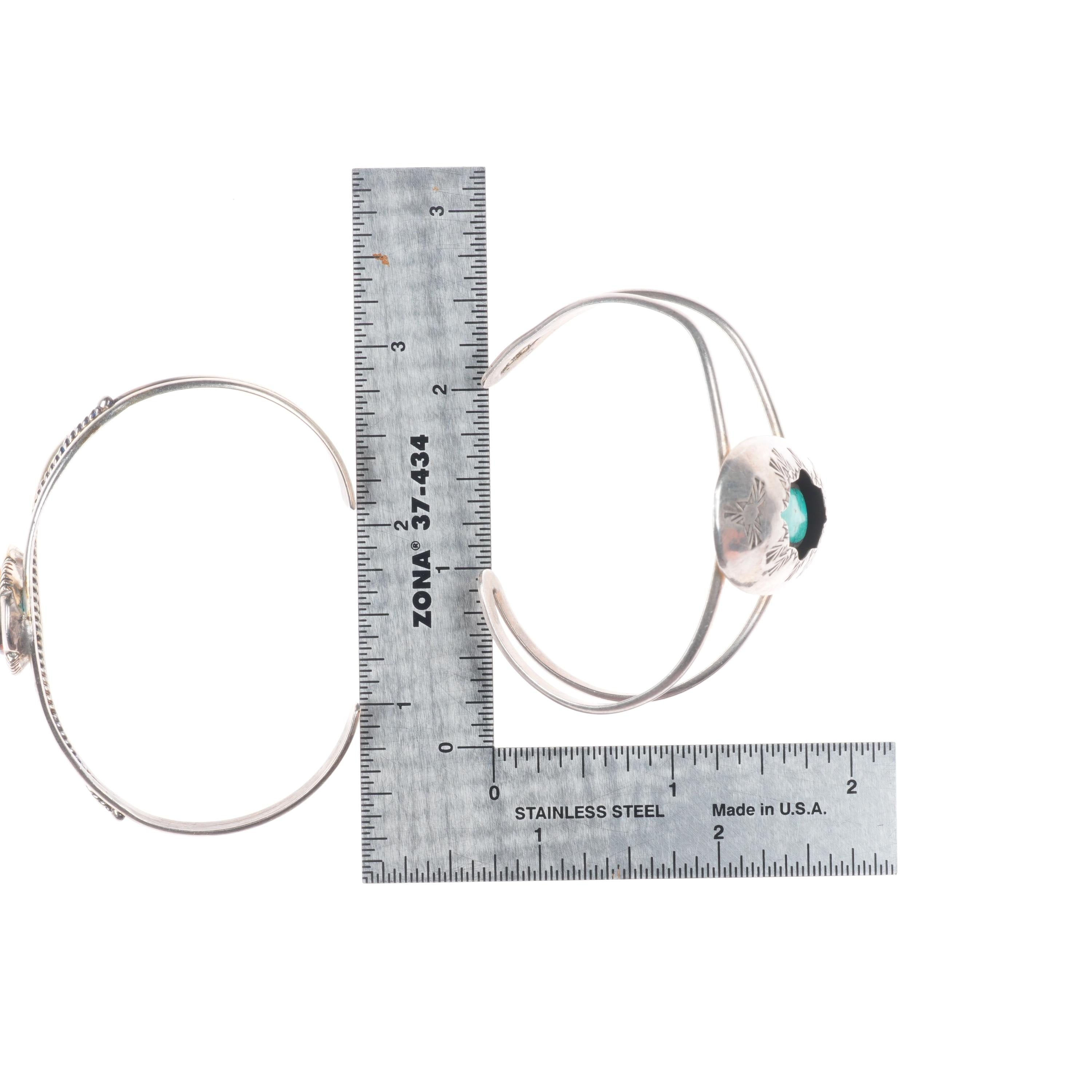 6"-7" Vintage Southwestern/Navajo sterling silver-turquoise cuff bracelet lot. Tested and guaranteed solid sterling silver with weight and measurements in pictures. No issues, most appear to be Native American made from the last half of the 20th century. Selling the whole lot shown with no significant issues.