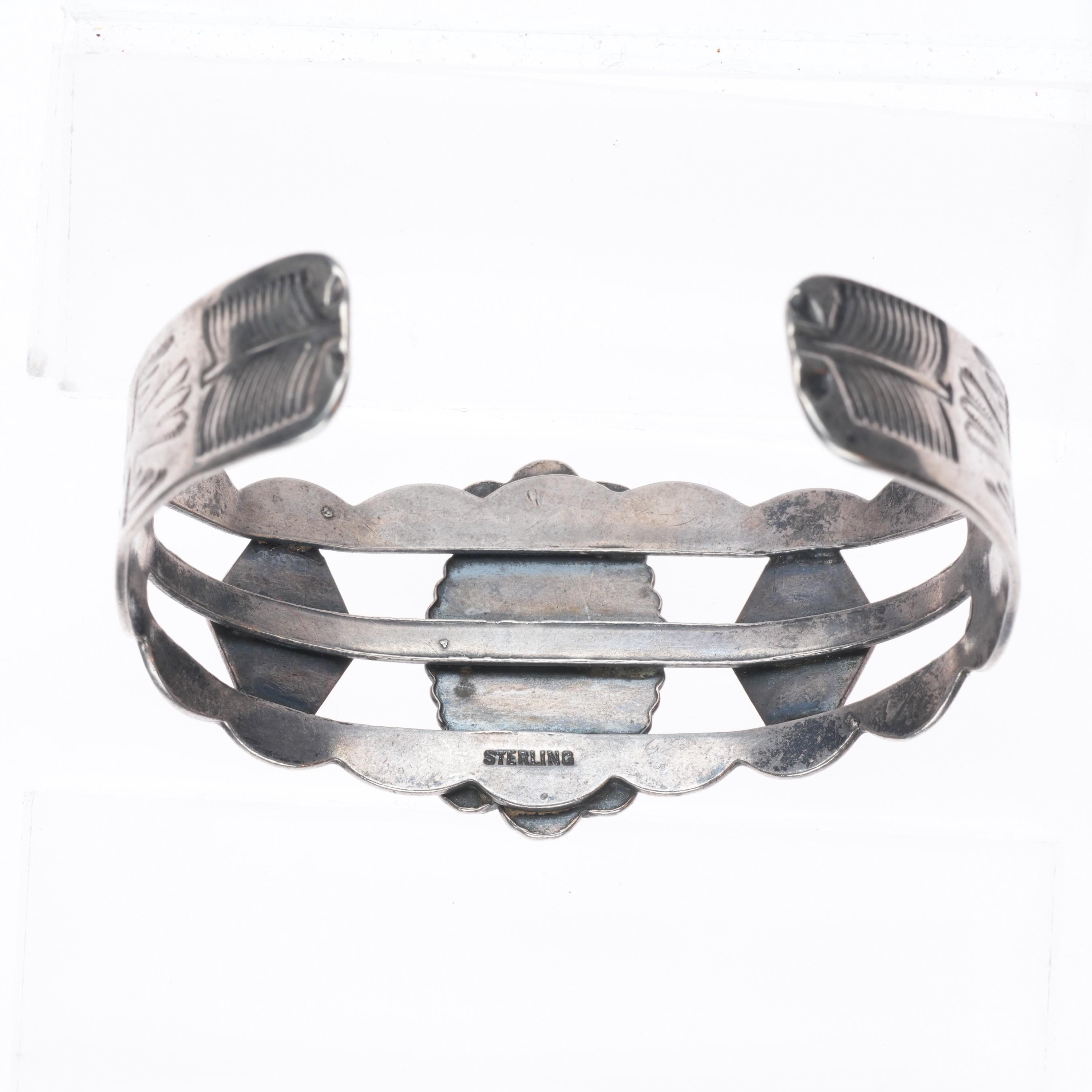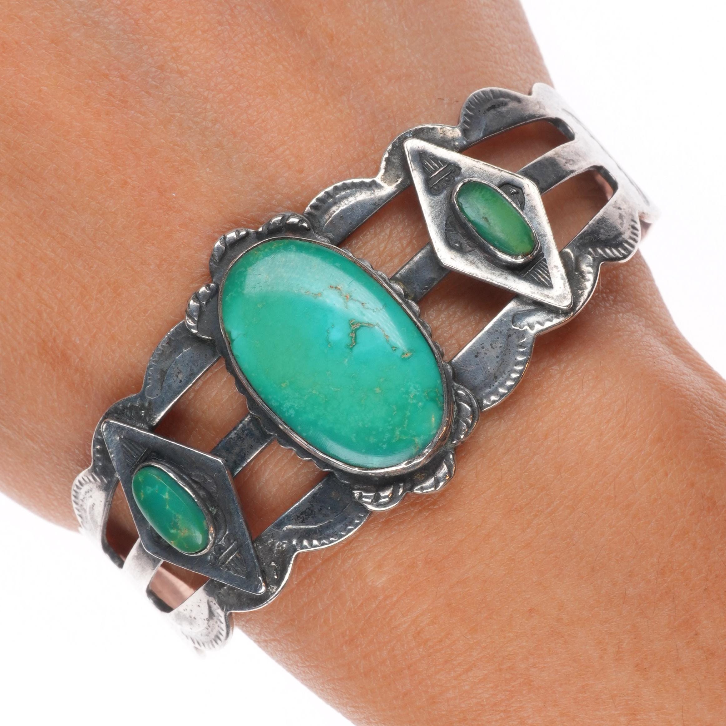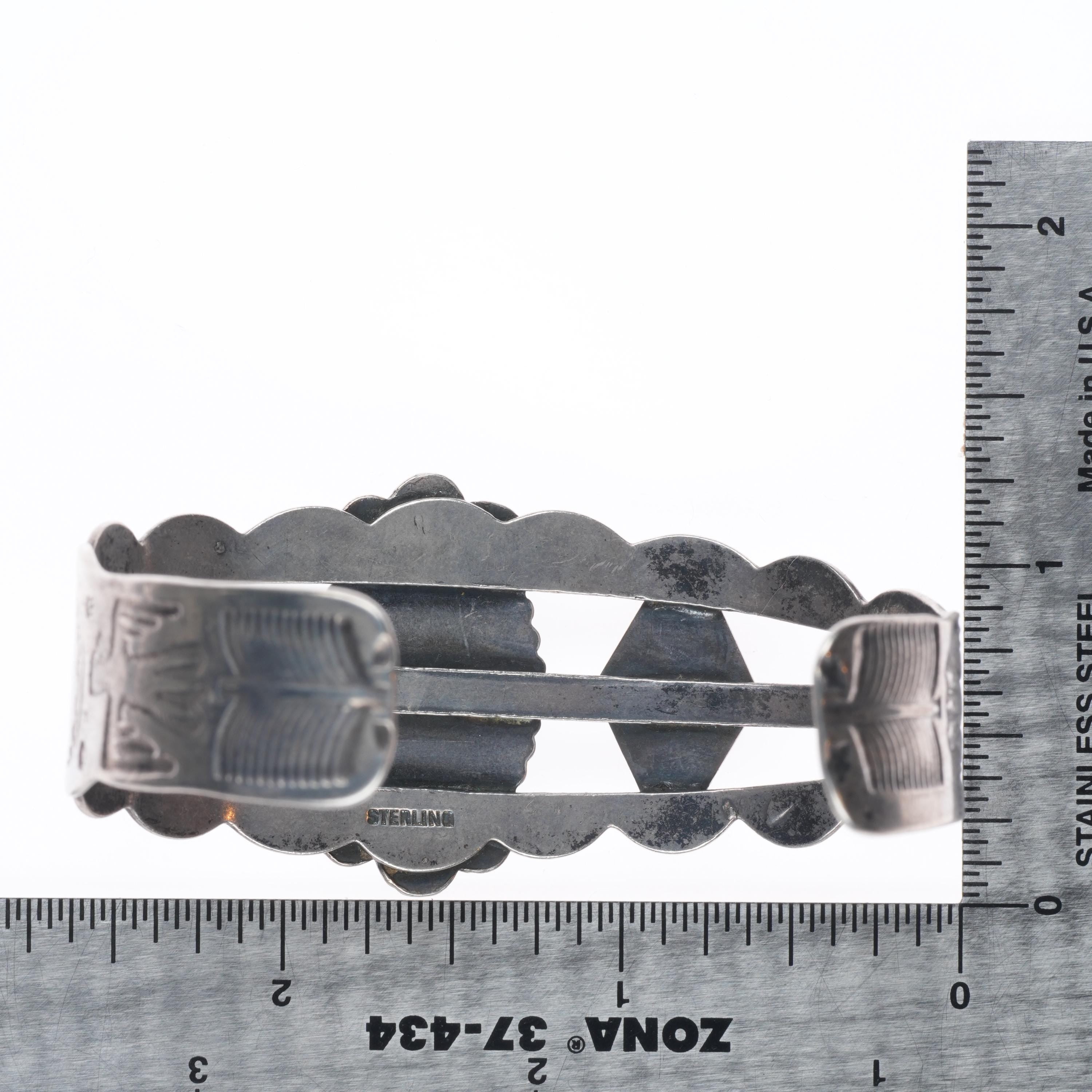 6.75" 1940 Fred Harvey type thunderbird sterling silver turquoise cuff bracelet. Tested and guaranteed solid sterling silver with weight and measurements in pictures. Fits up to a 6.75" wrist. Circa second quarter of the 20th century.