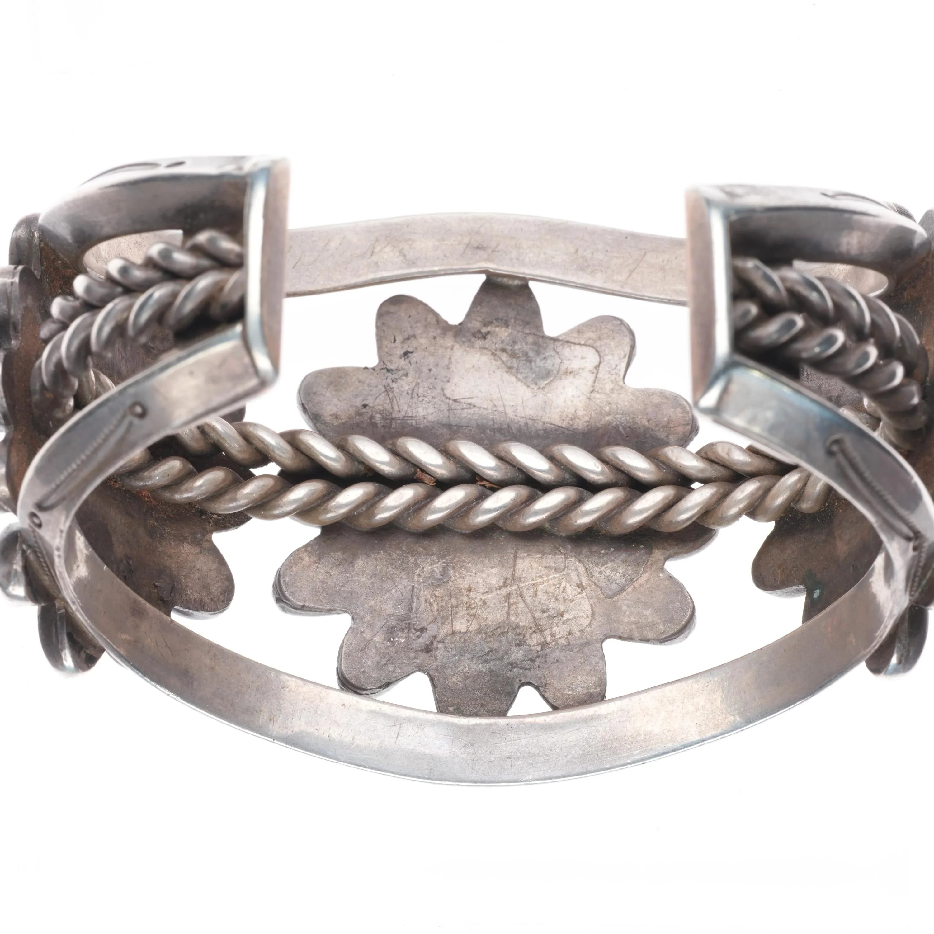 6.75" 30‘s-40‘s Navajo turquoise cluster vintage cuff bracelet sterling silver. Tested and guaranteed solid sterling silver with appropriate wear, a few of the stones with old fractures. Some wear to bezels, all stones secure. Weight and measurements in pictures. Circa second quarter of the 20th century. unmarked
