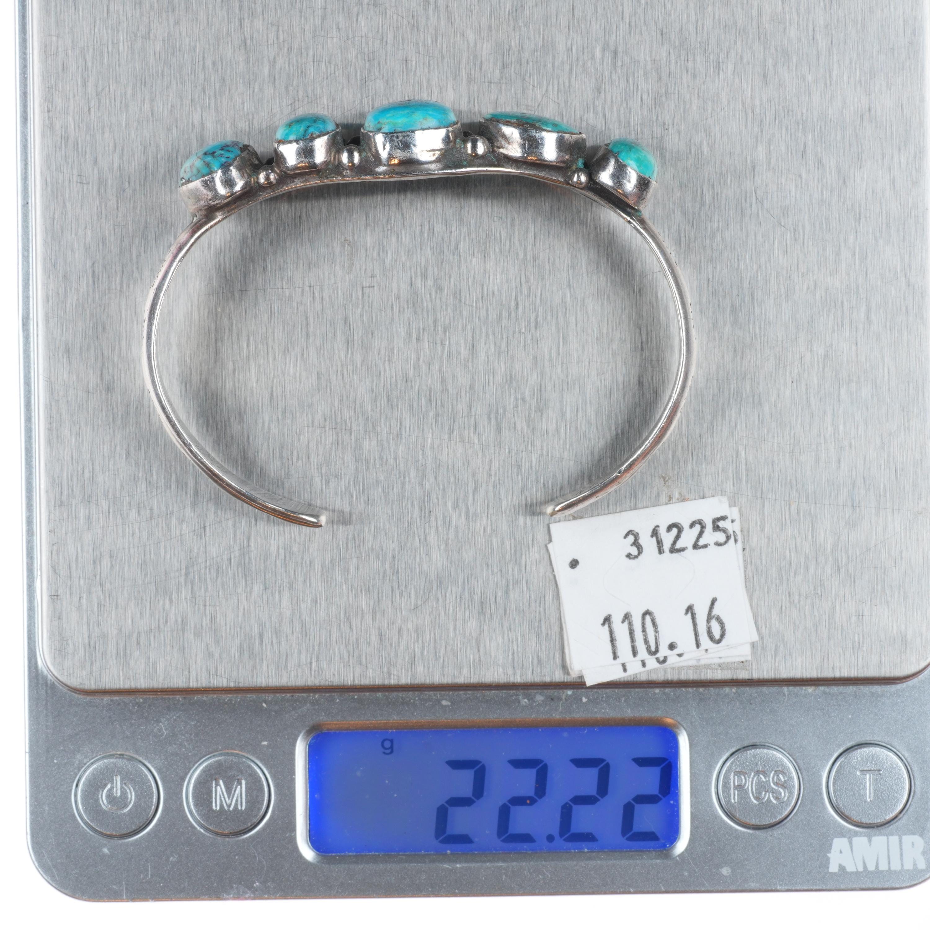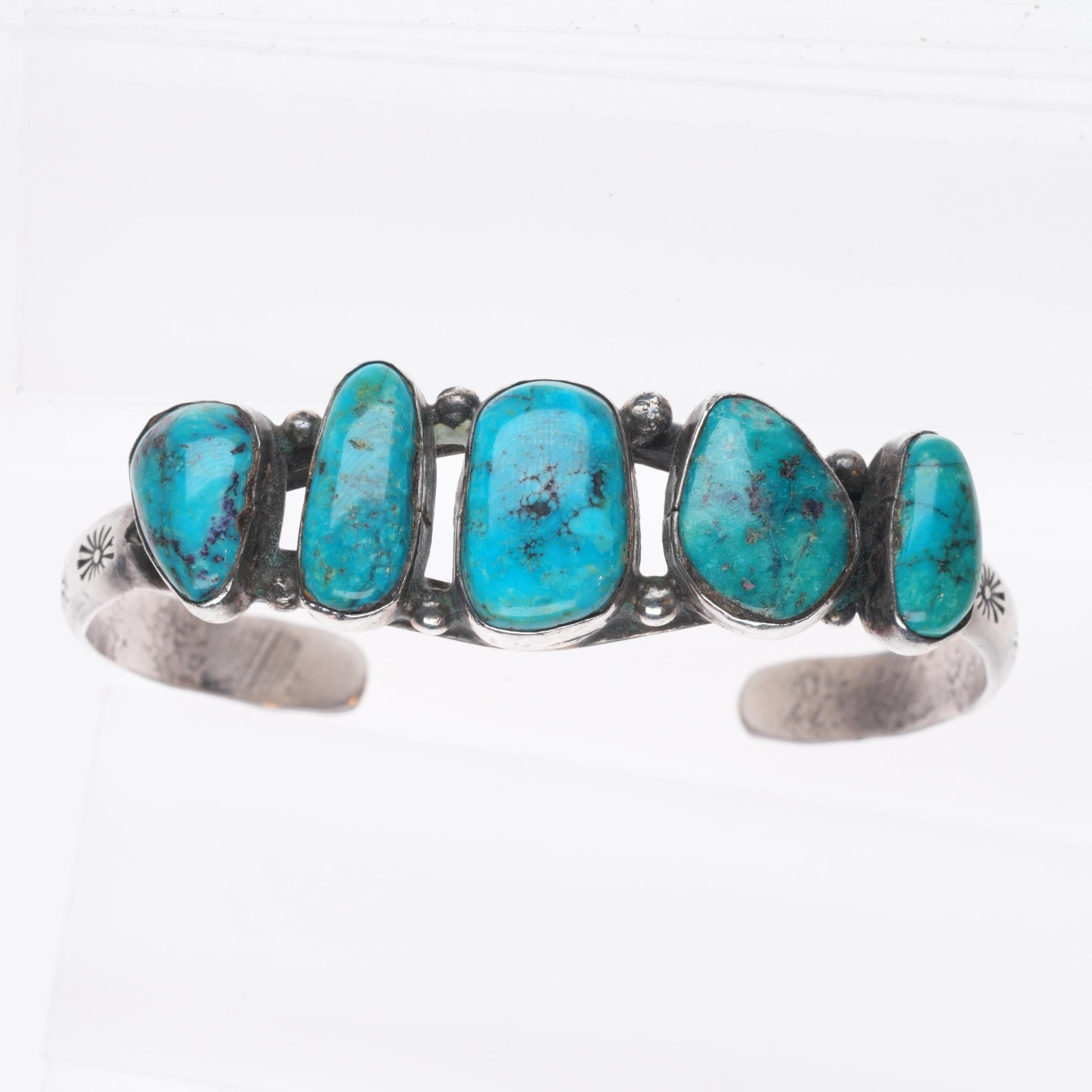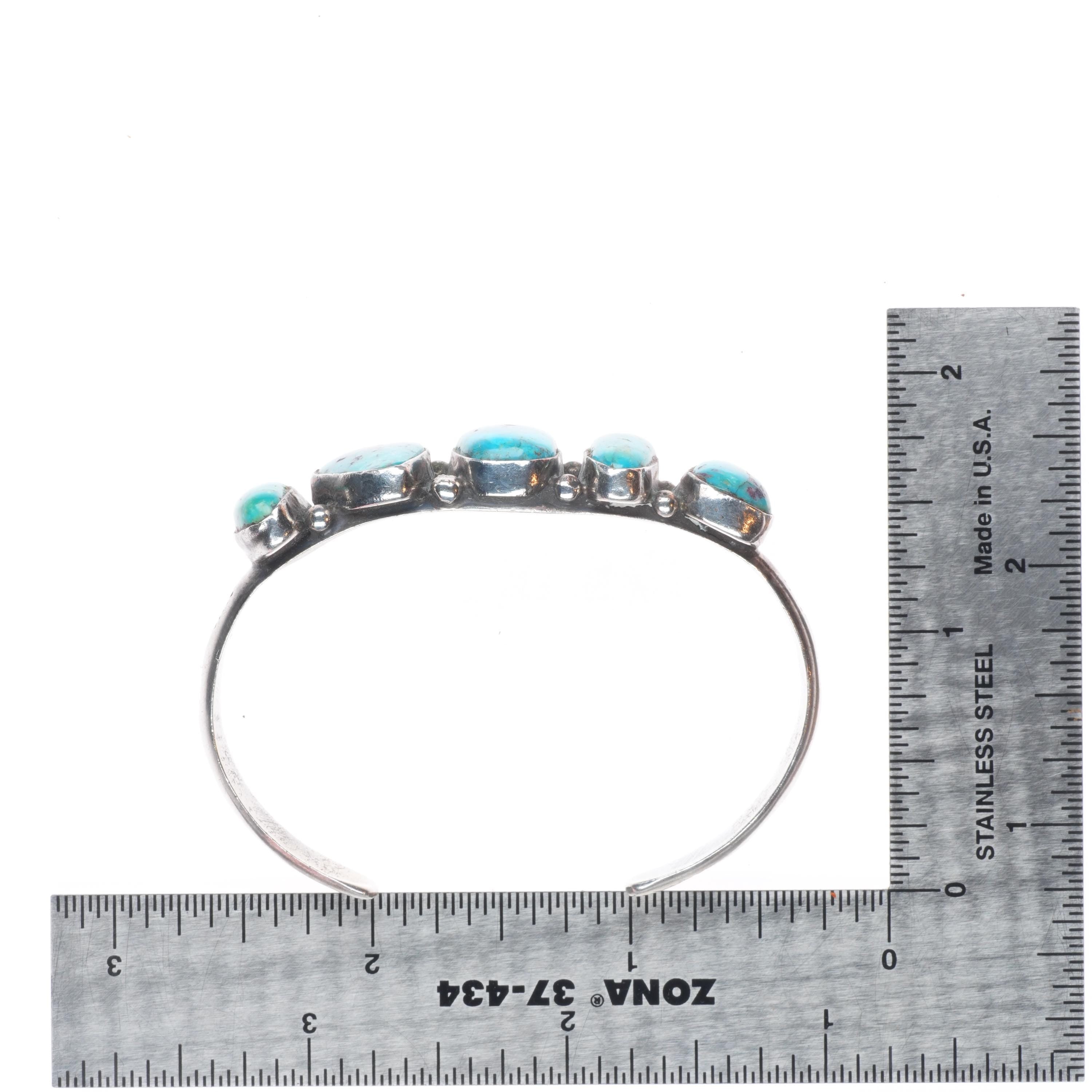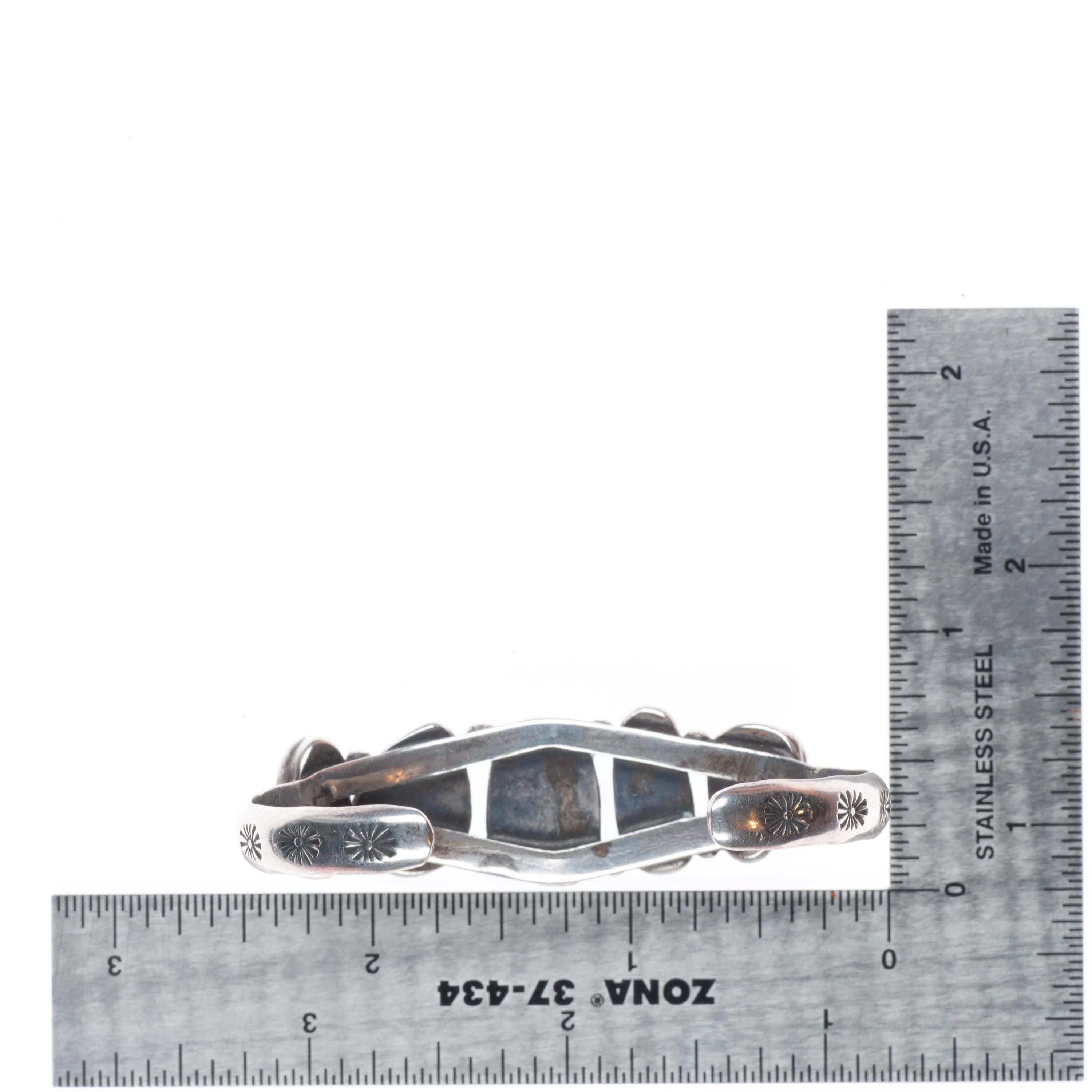 6" c1950 Vintage Navajo sterling silver abstract turquoise row cuff bracelet. Tested and guaranteed solid sterling silver with weight and measurements in pictures. Circa third quarter of the 20th century with age appropriate wear.. No apparent markings.