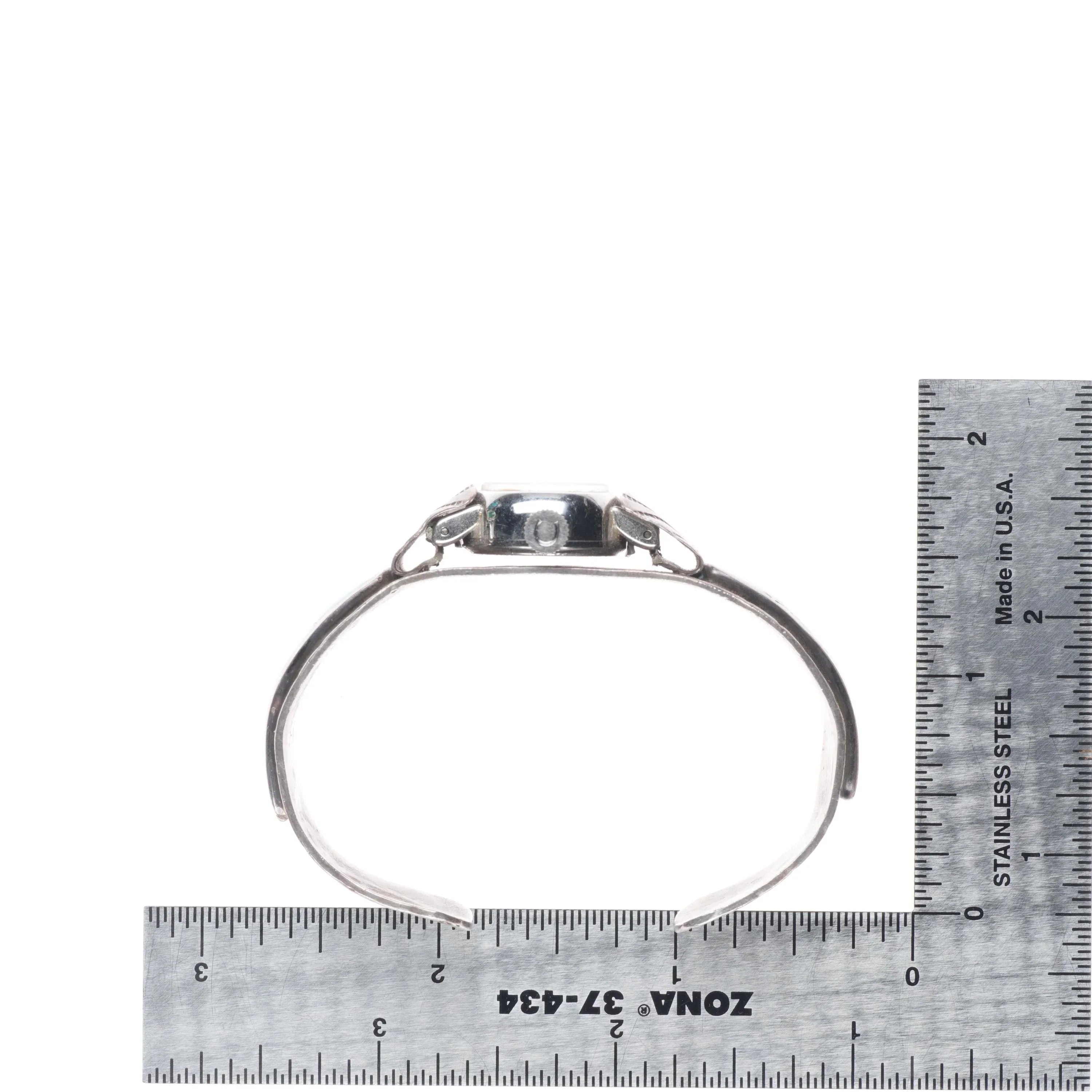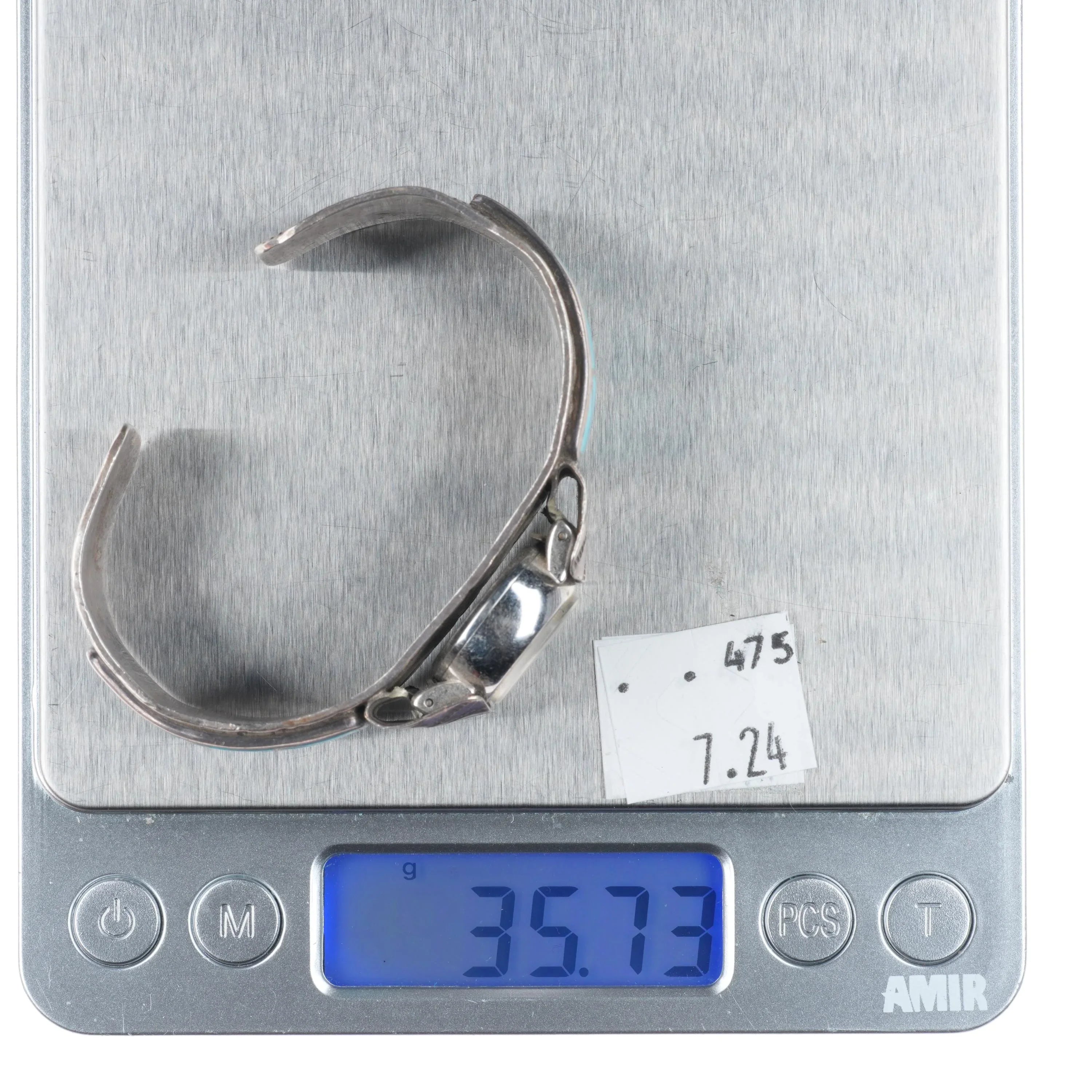 6" Vintage F.W. Zuni sterling silver channel inlay turquoise watch cuff bracelet. Selling the watch bracelet shown, tested and guaranteed solid sterling silver. Weight and measurements in pictures. Windup watch appears to work, not tested for accuracy.